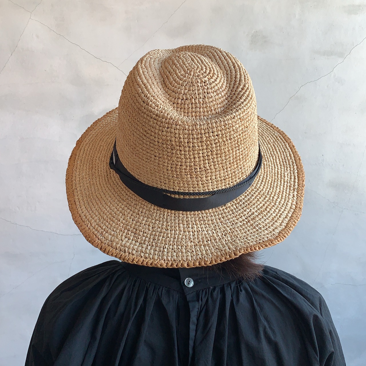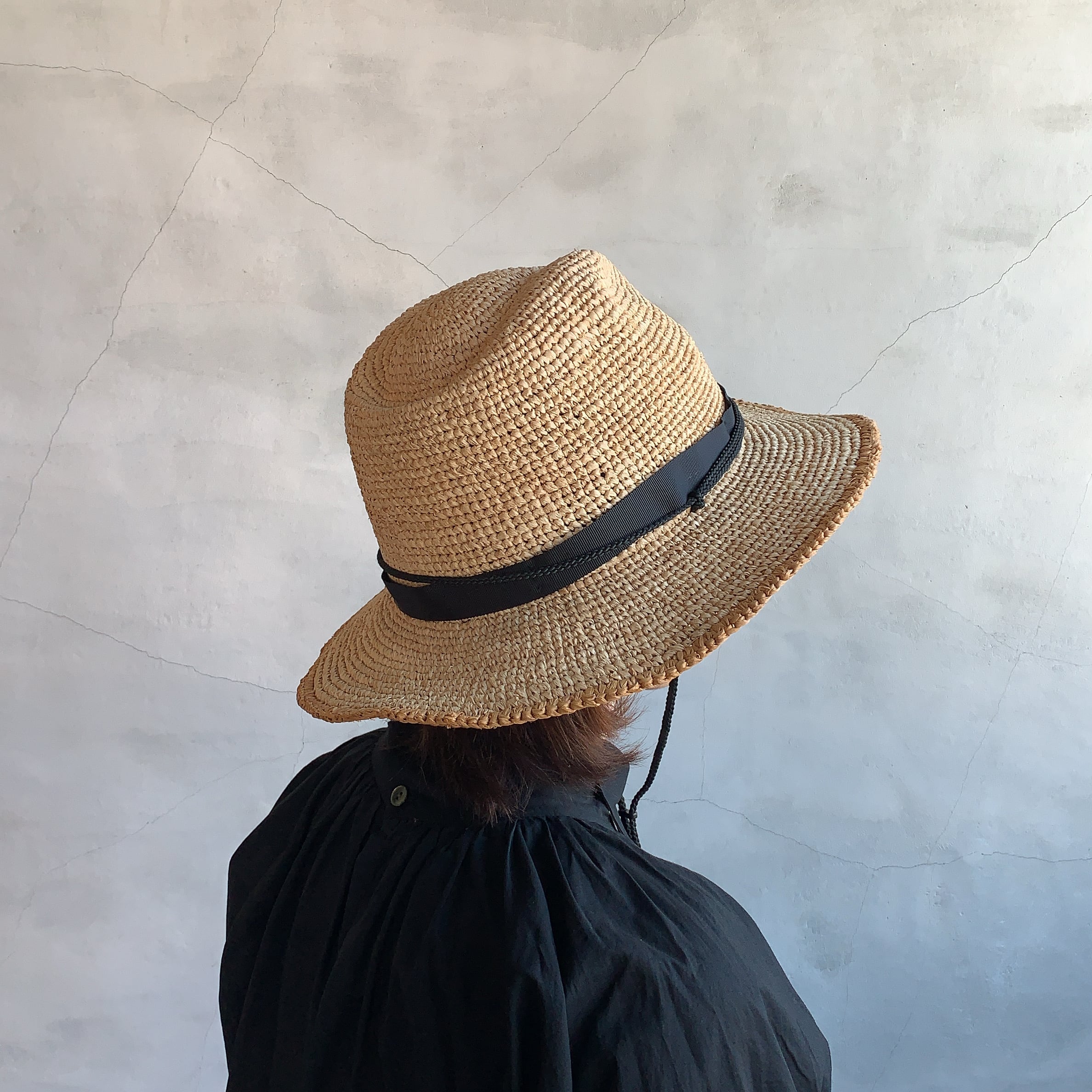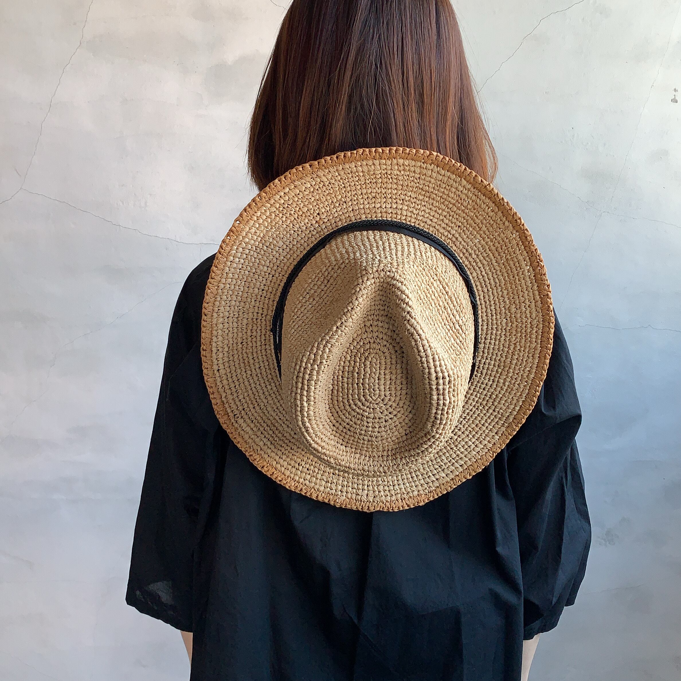 ヤシ科の天然素材ラフィアを使用したサファリハット。通気性が高く、広めのツバが太陽光線を遮ってくれるため、暑い日に最適なハットです。