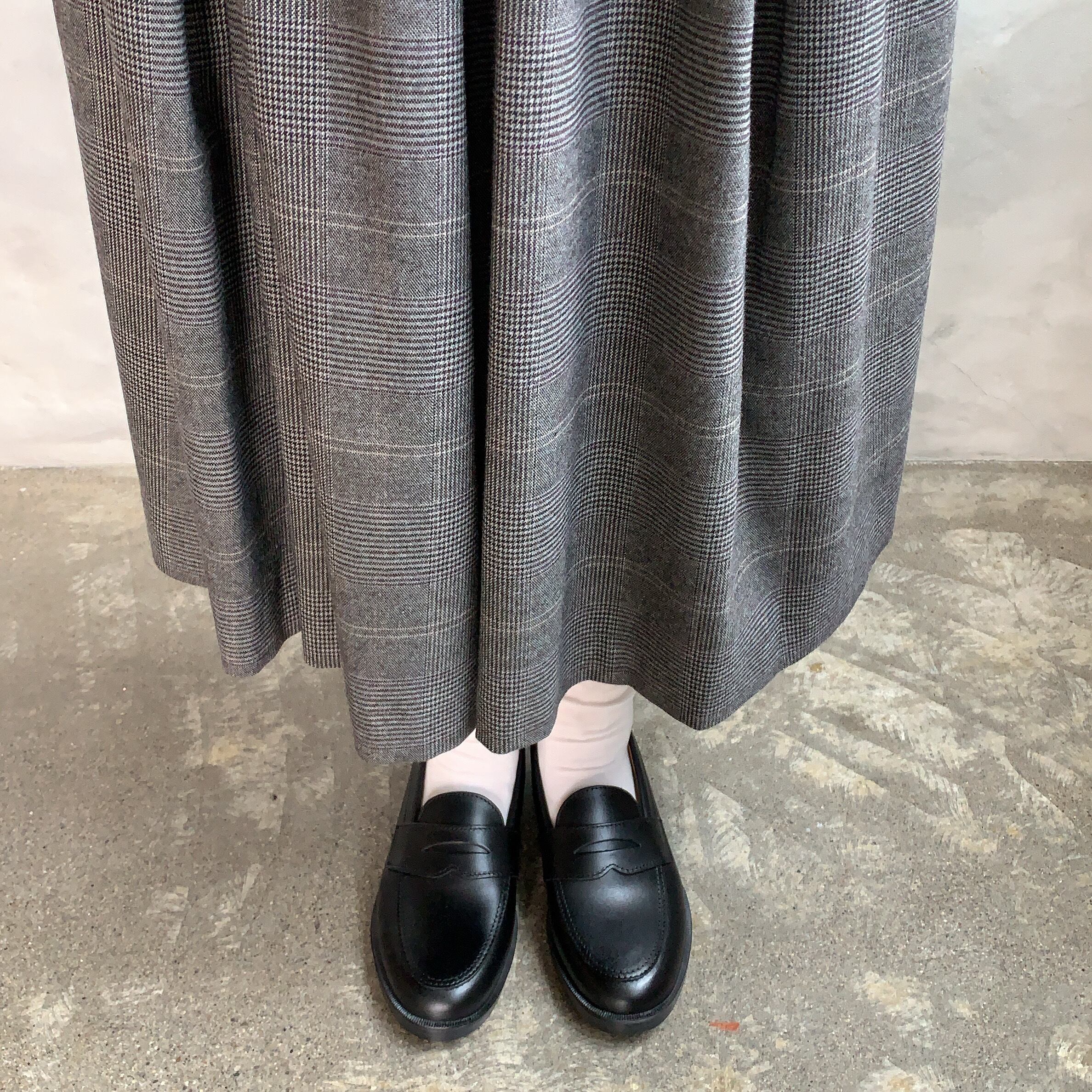 前後にタックとギャザーを入れ適度な広がりに仕上げたグレンチェックのロングスカートは、大人の女性らしさを演出します。