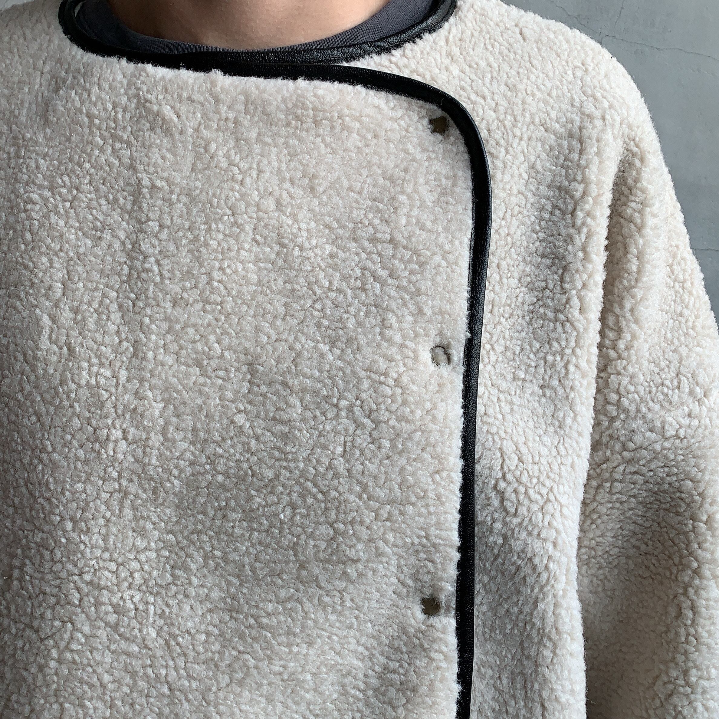 すっきりとしたノーカラータイプで袖や首元フロントラインなどに配された、レザーのパイピングもポイント。