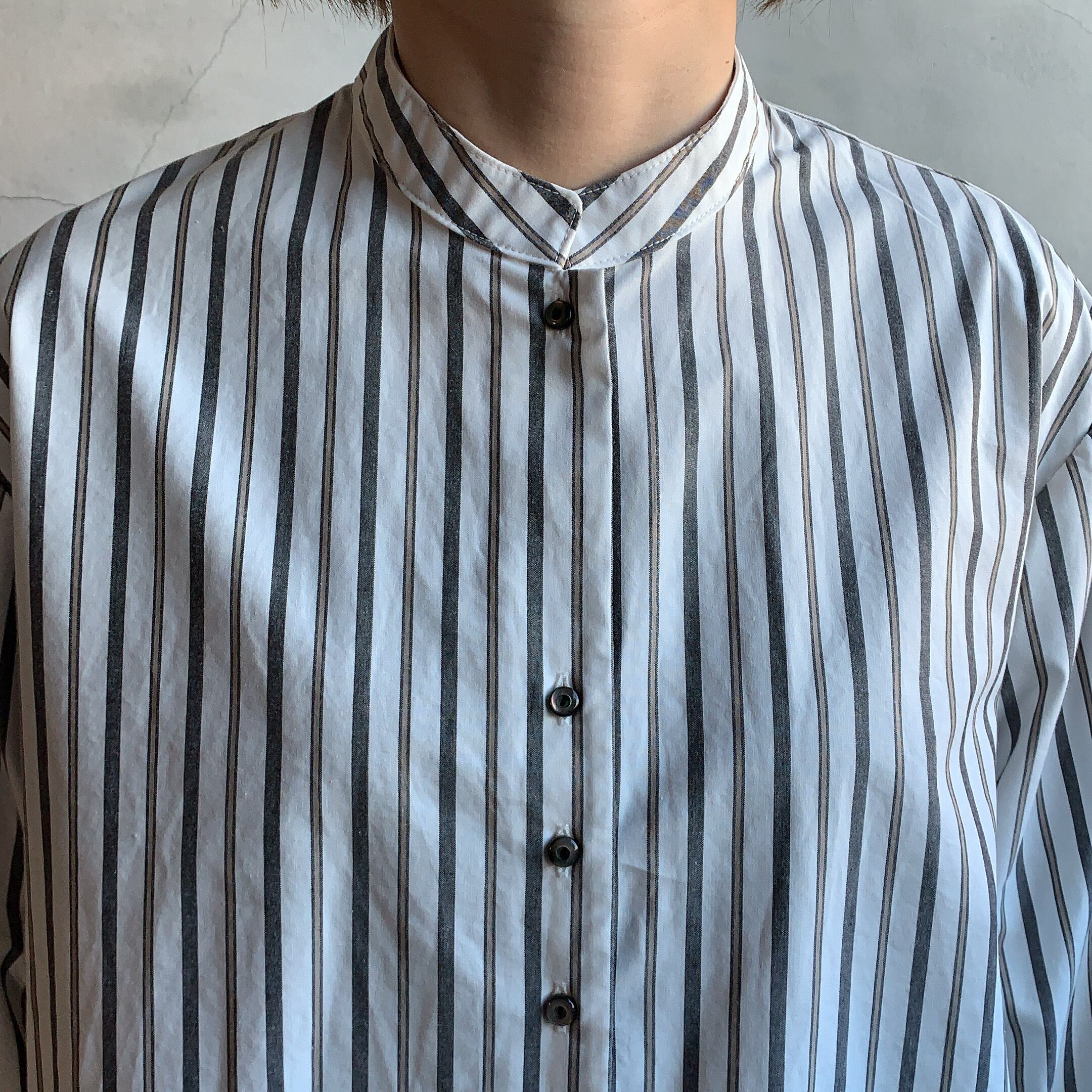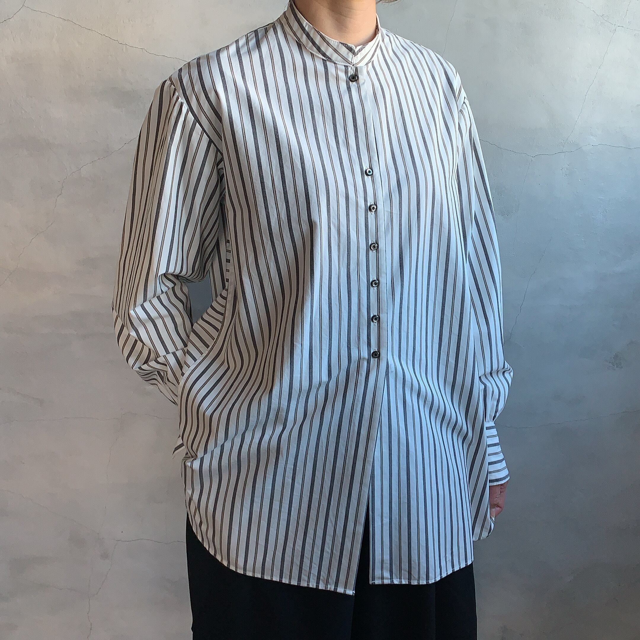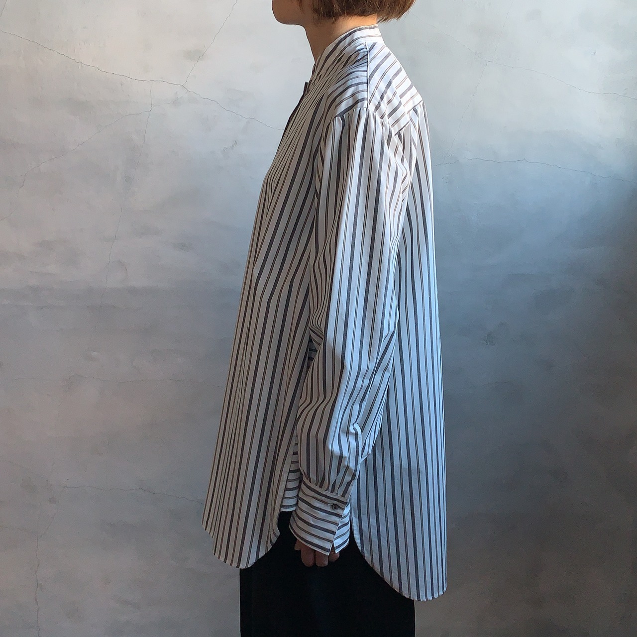 PULETTEデザイナー郡司さんに”ジーンズに合うトップス”をテーマにパターン作成していただいた、やや長めの着丈のバンドカラーシャツ。