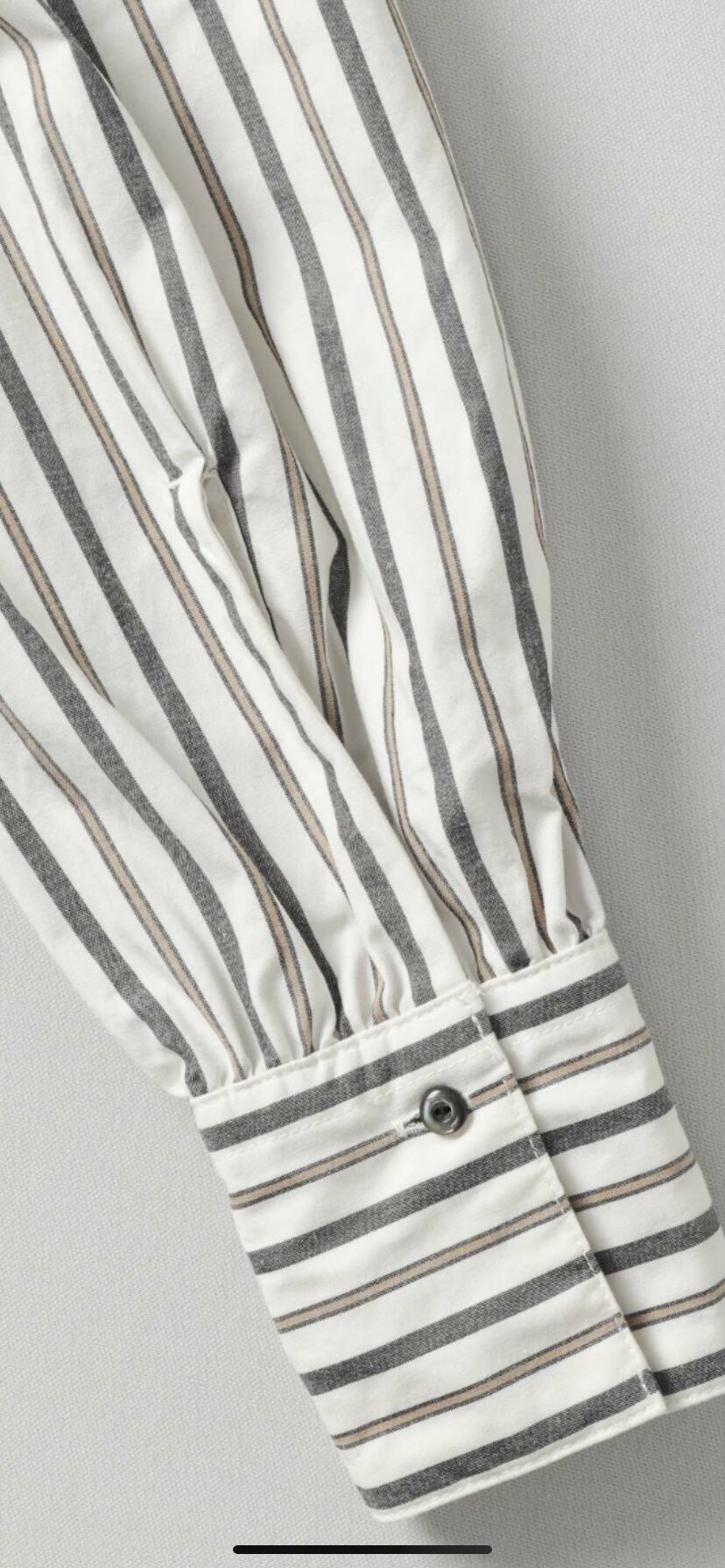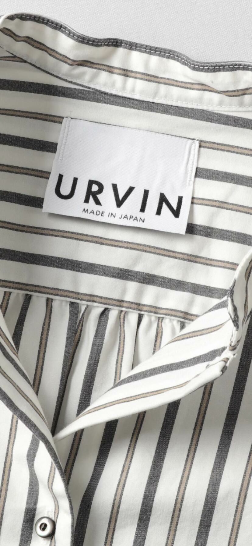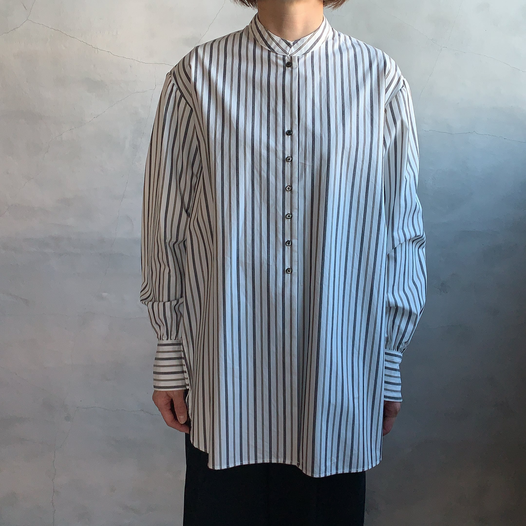 PULETTEデザイナー郡司さんに”ジーンズに合うトップス”をテーマにパターン作成していただいた、やや長めの着丈のバンドカラーシャツ。