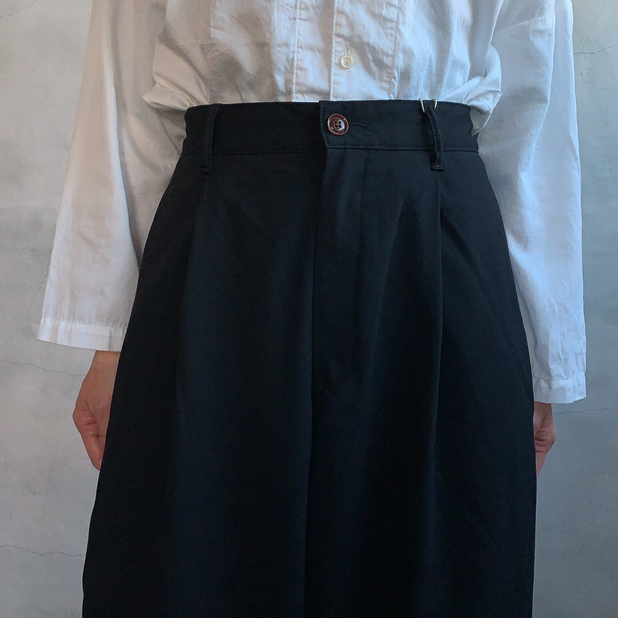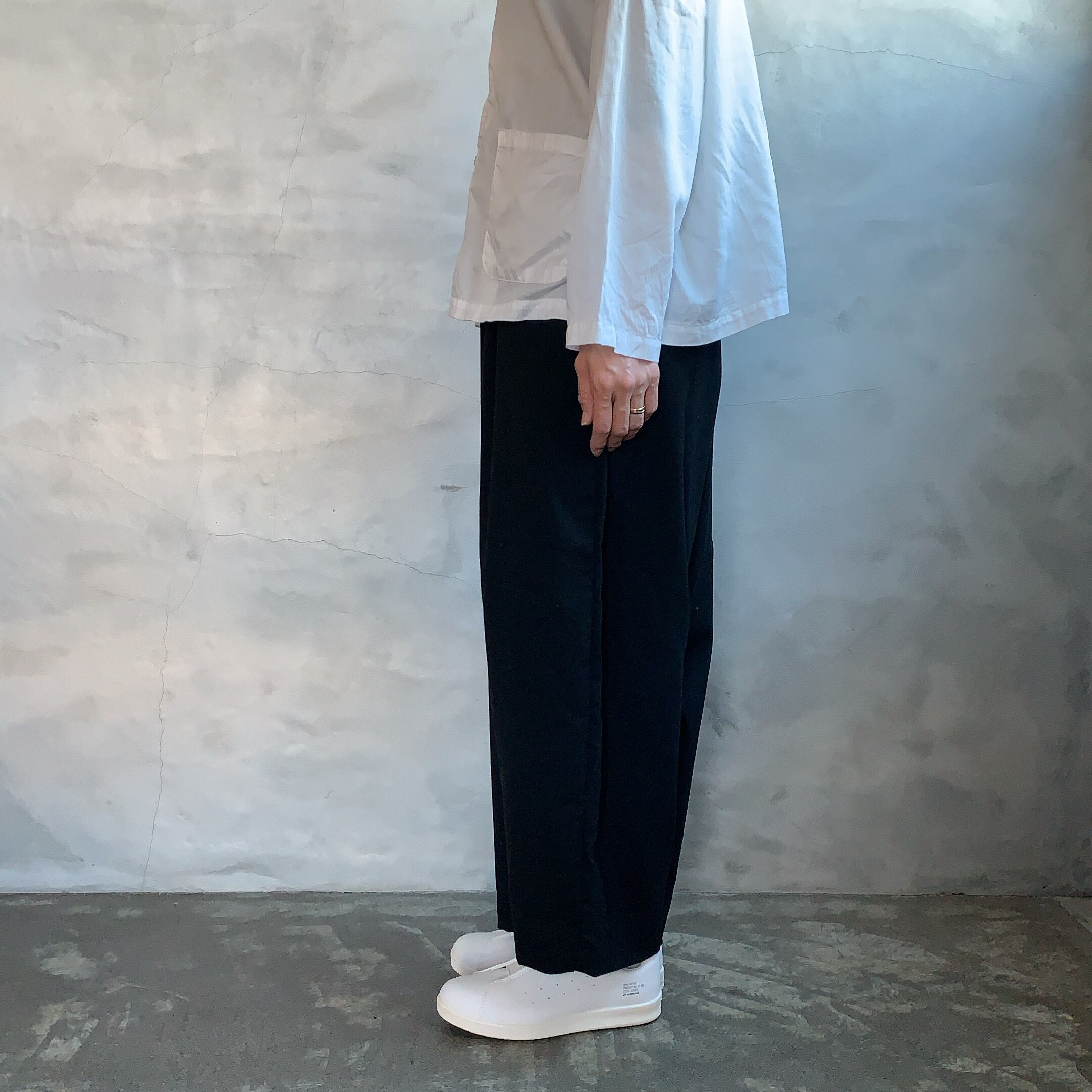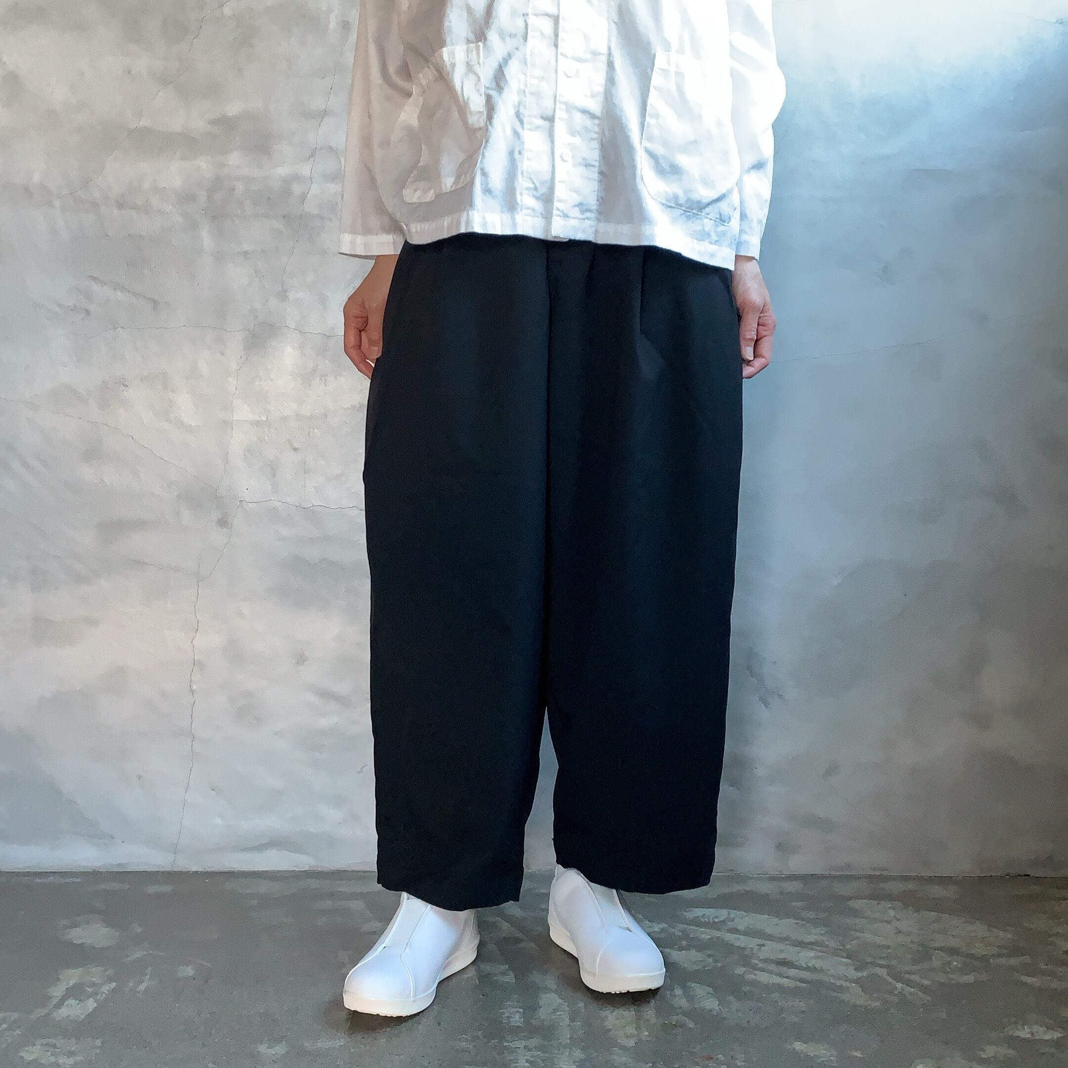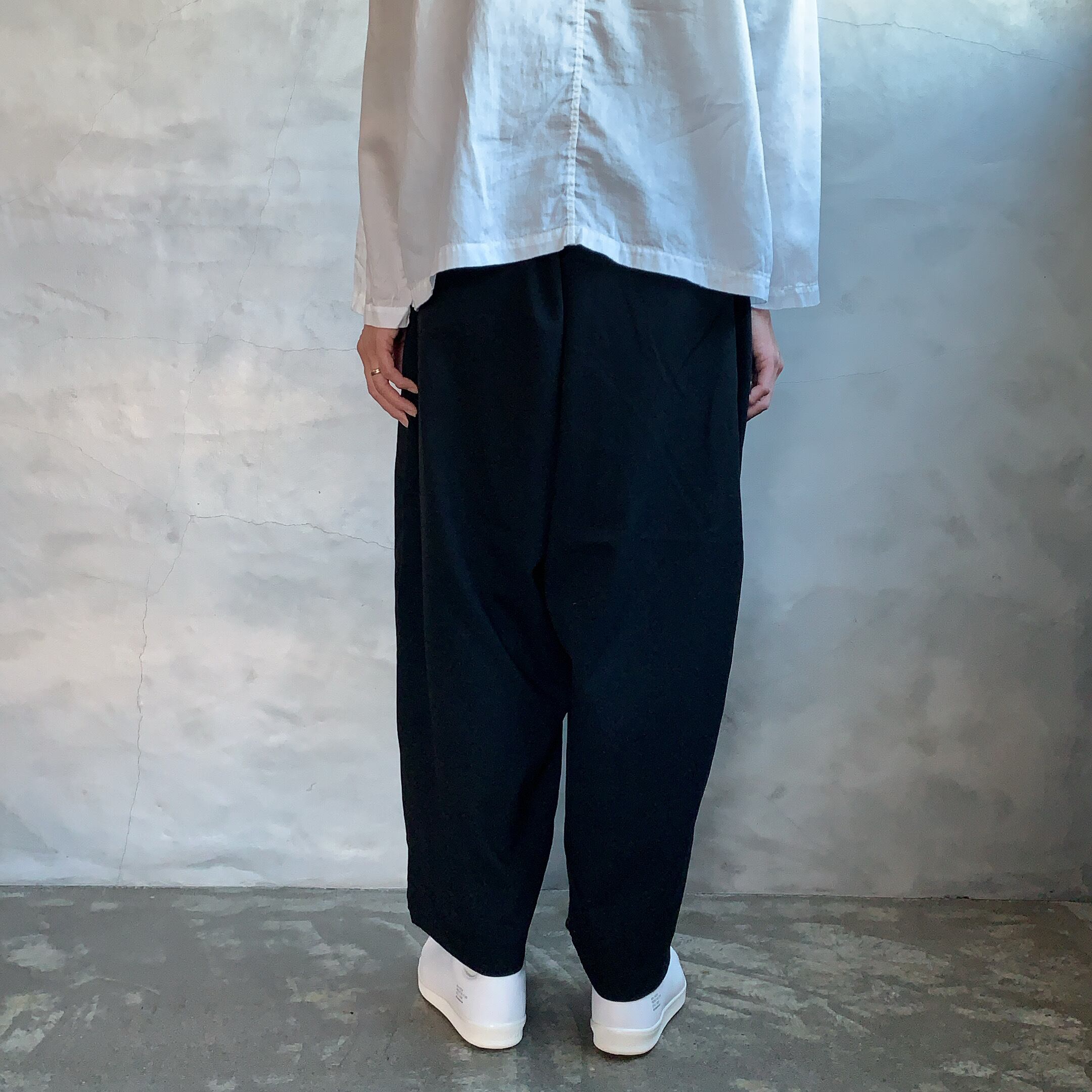 レーヨン混のさらりと軽くてドレープ感のある素材が、独特の丸みのあるきれいなラインのシルエットを出しています。ウエスト後ろはゴム仕様でリラックス感もあります。