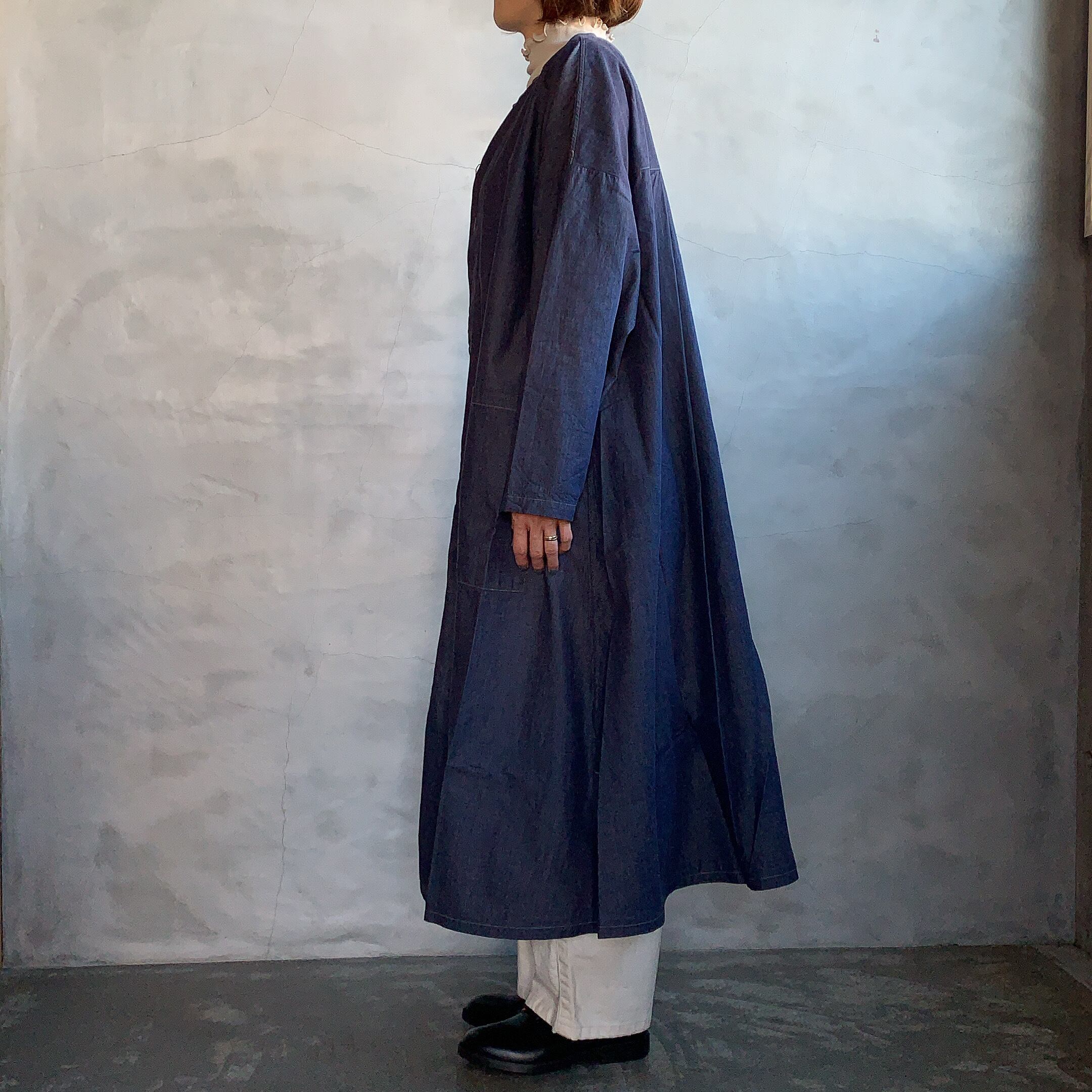 小さな襟とゆったりロングなシルエットが特徴のアトリエローブ。