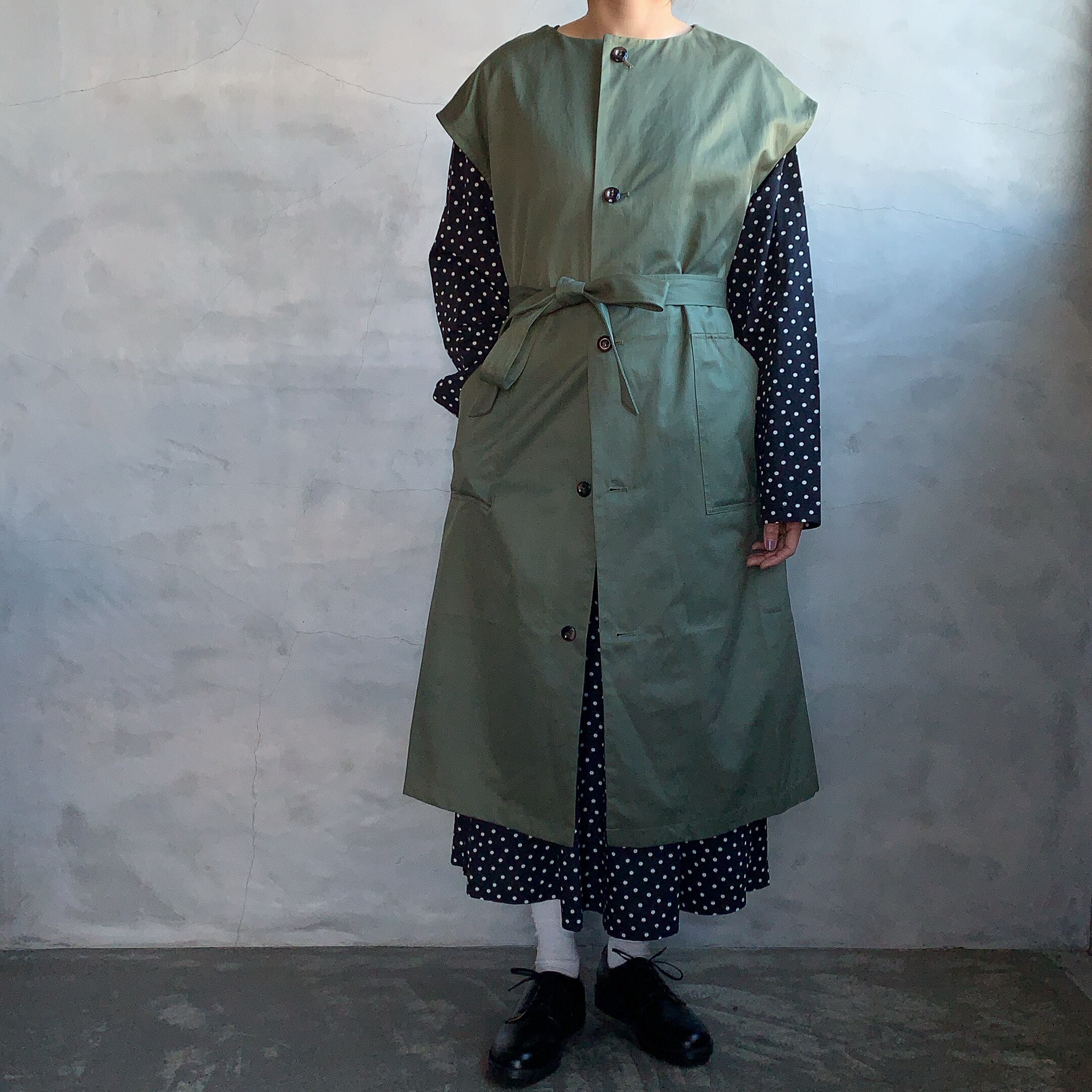 足元の靴やソックスとのバランスでもスタイルのアレンジができるロングベストです。