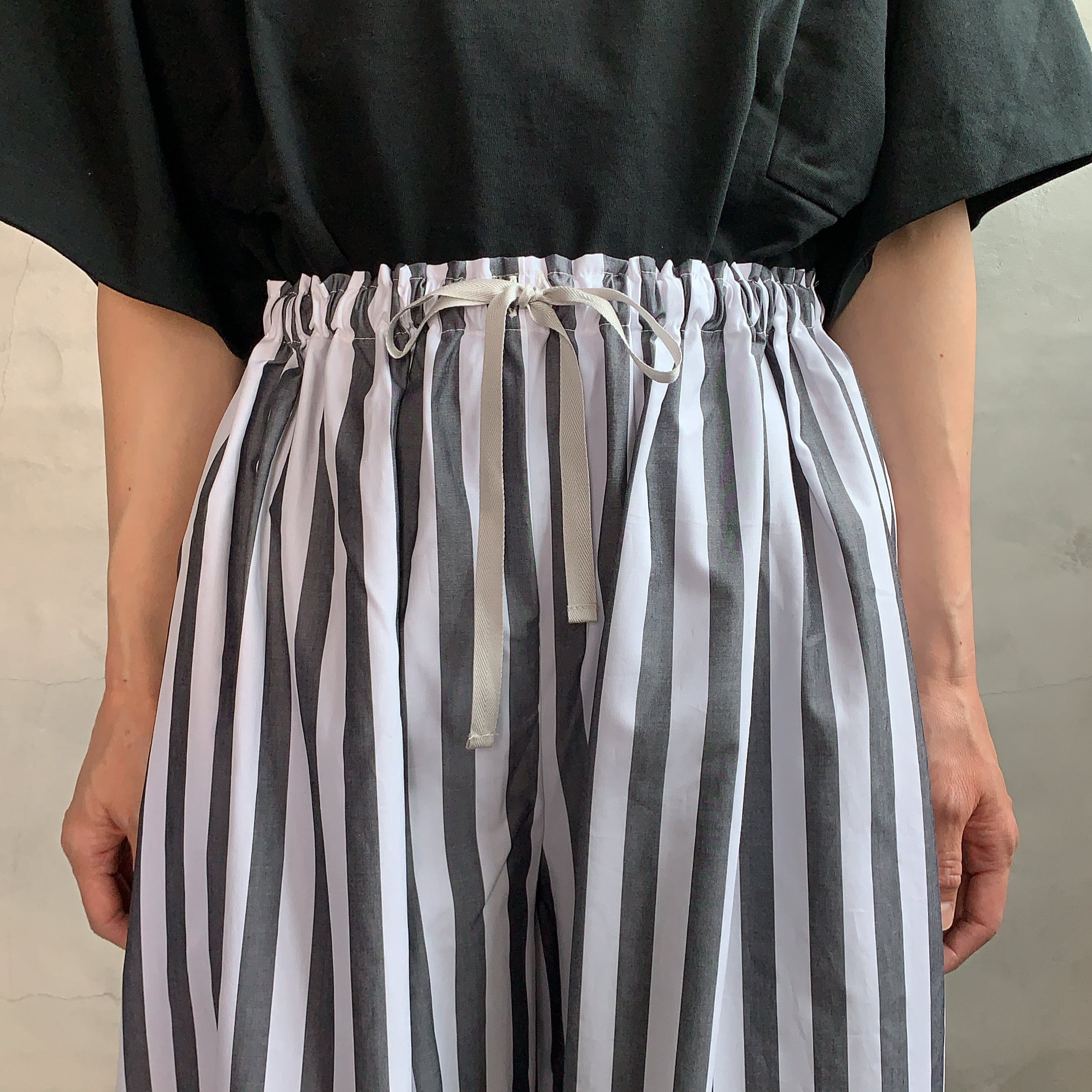ウエストゴムで楽に履けて、見せるひもタイプなのでさまざまなアレンジが可能です。