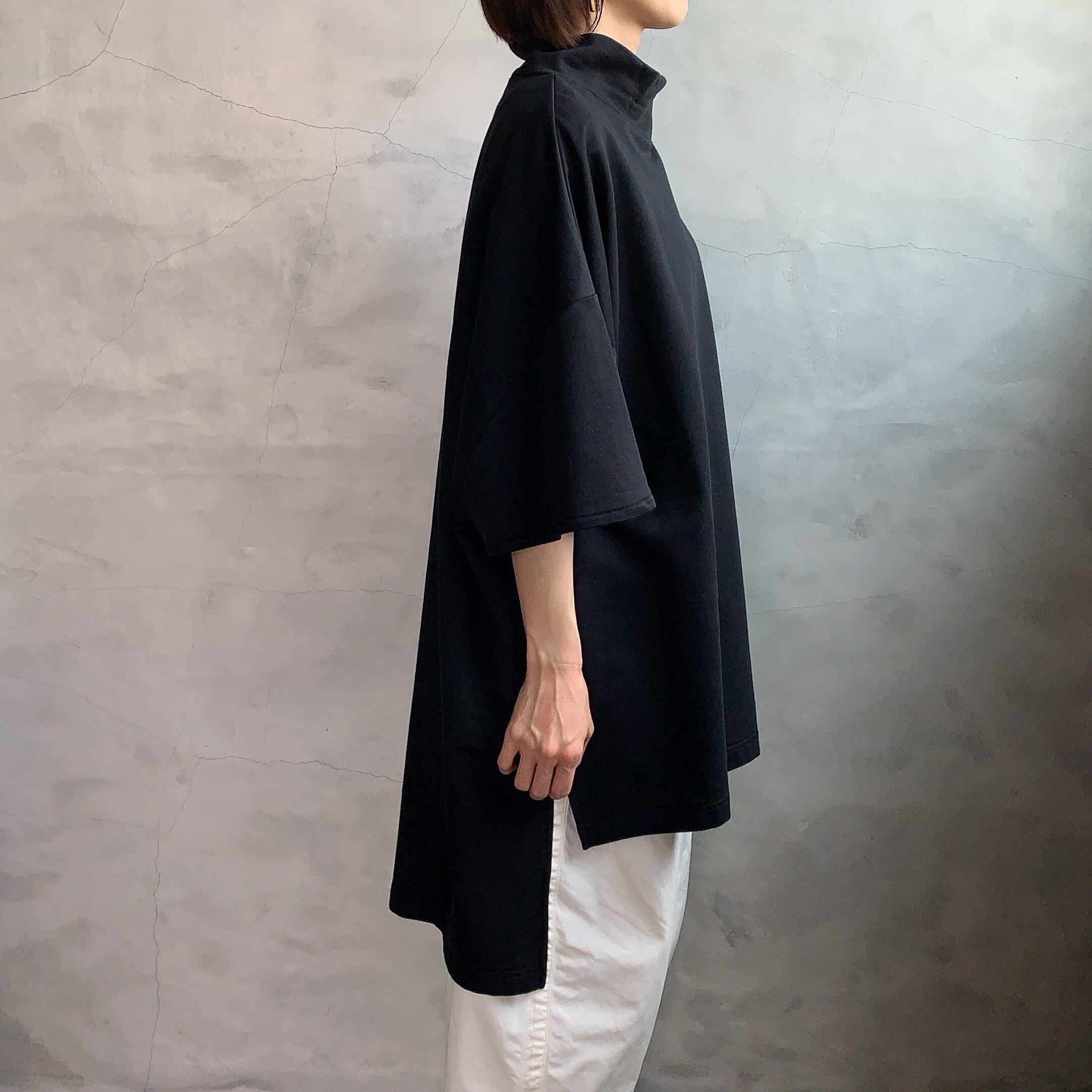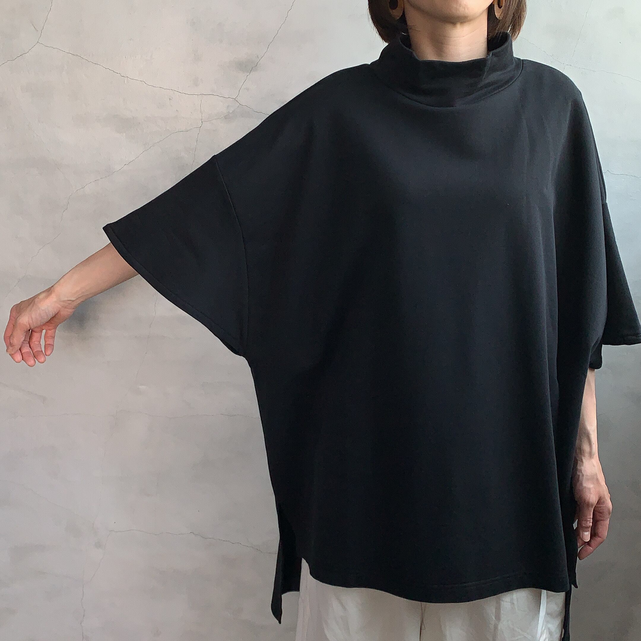 幅広のハイネックは窮屈感はなくスッキリと着ていただけます。