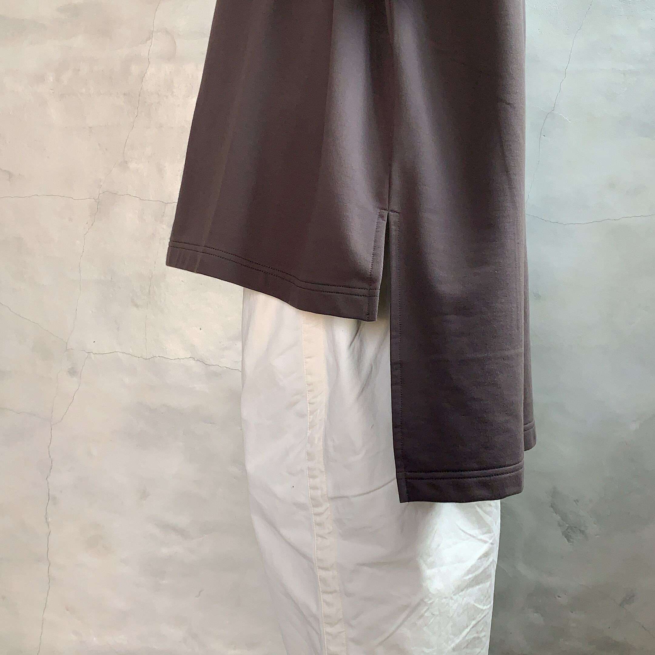 前後の着丈の長さが違い、深めのスリットで後ろが長く、全体にストンとした落ち感があるので、気になるところはカバーしつつリラックスした着心地です。