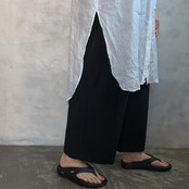 涼しげなリネンのハリ感とふんわりと身体を包み込むノーカラーボリュームスリーブシャツ。爽やかな雰囲気と透明感を感じられるデザインが印象的。肩の下からボリュームを出した袖に加え、袖口をゴム使用にしたことでよりふんわりとしたシルエットを表現。サイドスリットは足もとの軽さとレイヤードなコーディネートがより分かりやすく動きのある着こなしを演出。シンプルで着回しがきく魅力のシャツです。