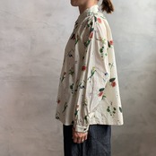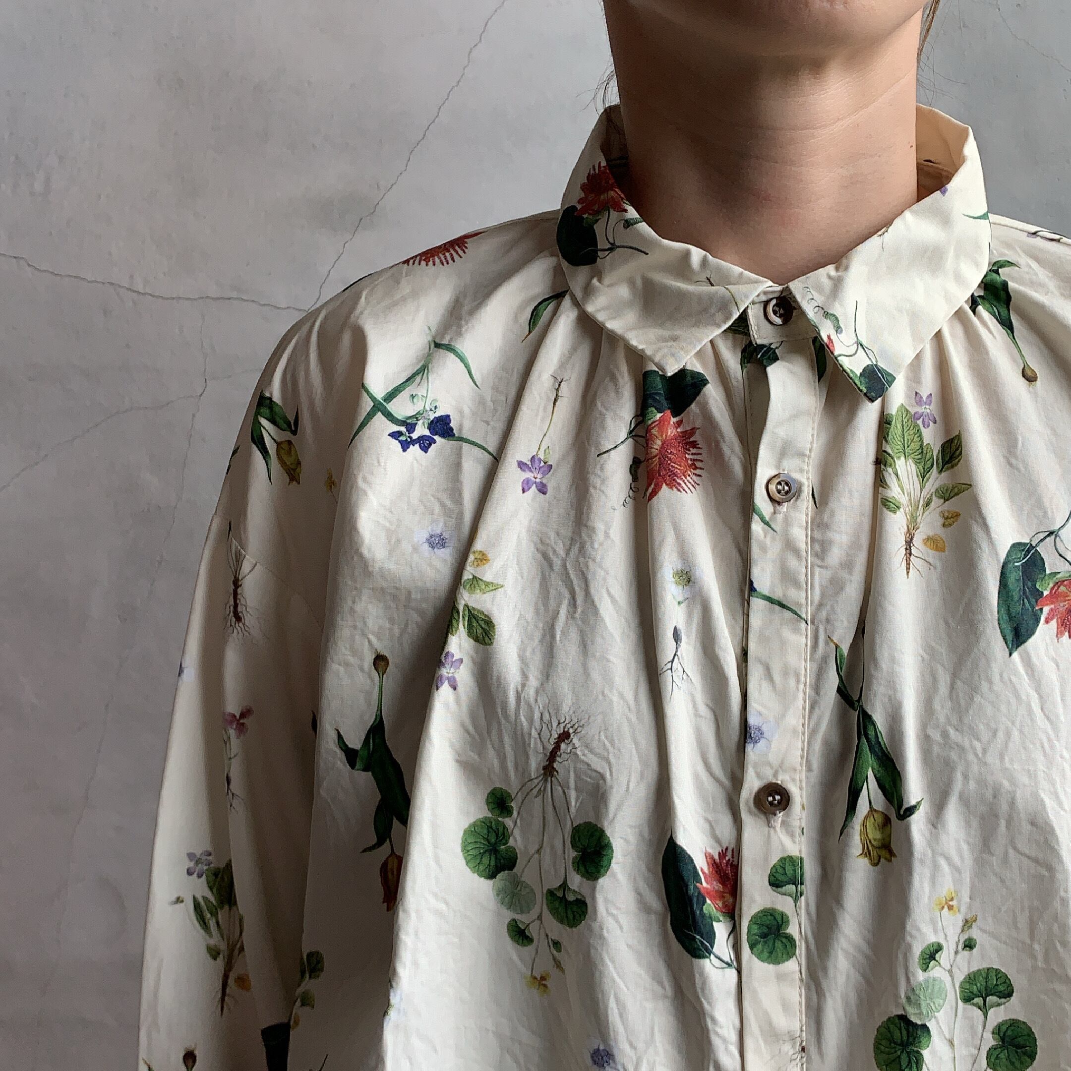 シンプルなスタイルに映えるボタニカルフラワーのシャツ。衿ぐり、袖口にギャザーの入った、ふんわりとしたシルエットです。シャツとして1枚でさらっと着るのはもちろん、夏はタンクトップやTシャツに羽織った涼しげなスタイルもおすすめです。ボタンを留めてジャケットやアウターなどを合わせるとかっちりとした印象に、ボタンを少し開けて首元を見せると程よくリラックスした印象で着られます。スカートにもパンツにも合わせやすい着丈で、雰囲気を変えて着まわしを楽しめます。