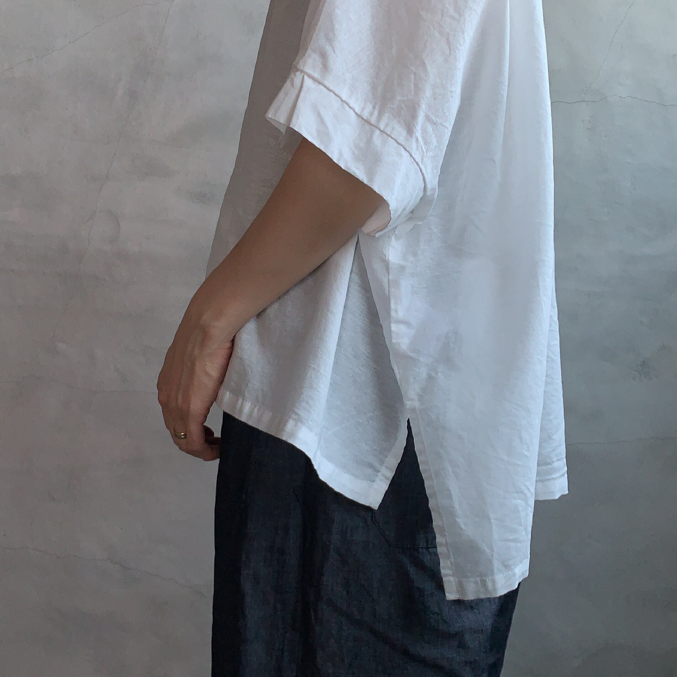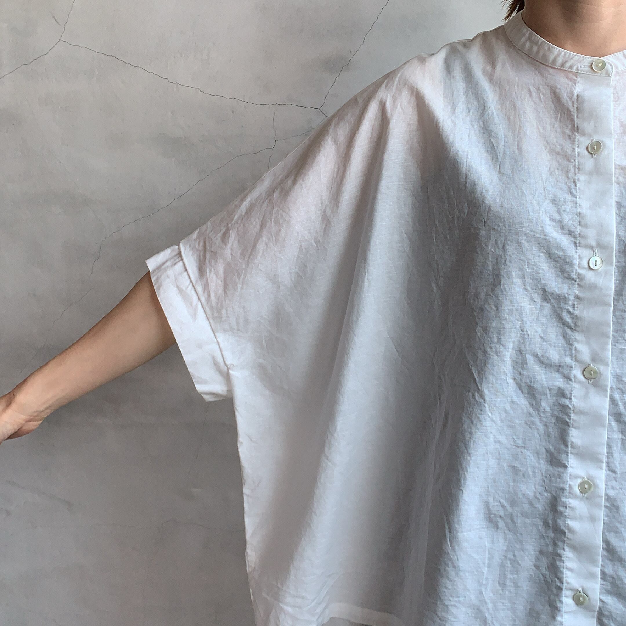mizuiro indの定番アイテム、スタンドカラーワイドシャツ。コットン×リネンの柔らかさとハリ感を合わせ持ったシンプルな1枚。自然な動きを表現した前後差のあるデザインが印象的。ベーシックにこの1枚で着用しても素敵ですが、羽織としてコーディネートすることで春から夏まで長く愛用できるアイテムです。爽やかなカラー展開で涼しげなコーディネートを演出します。