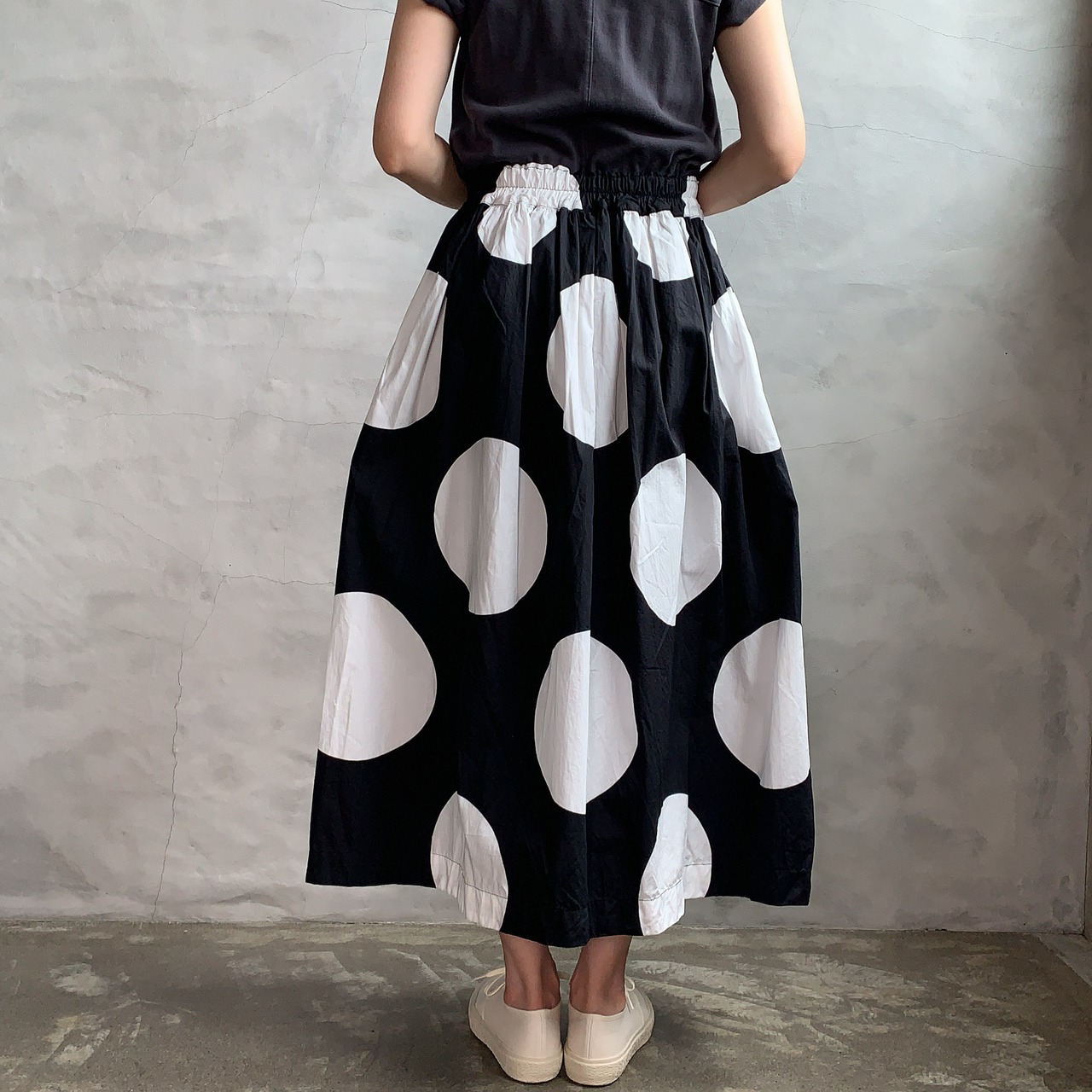 大きなドット柄が魅力のロングスカート。