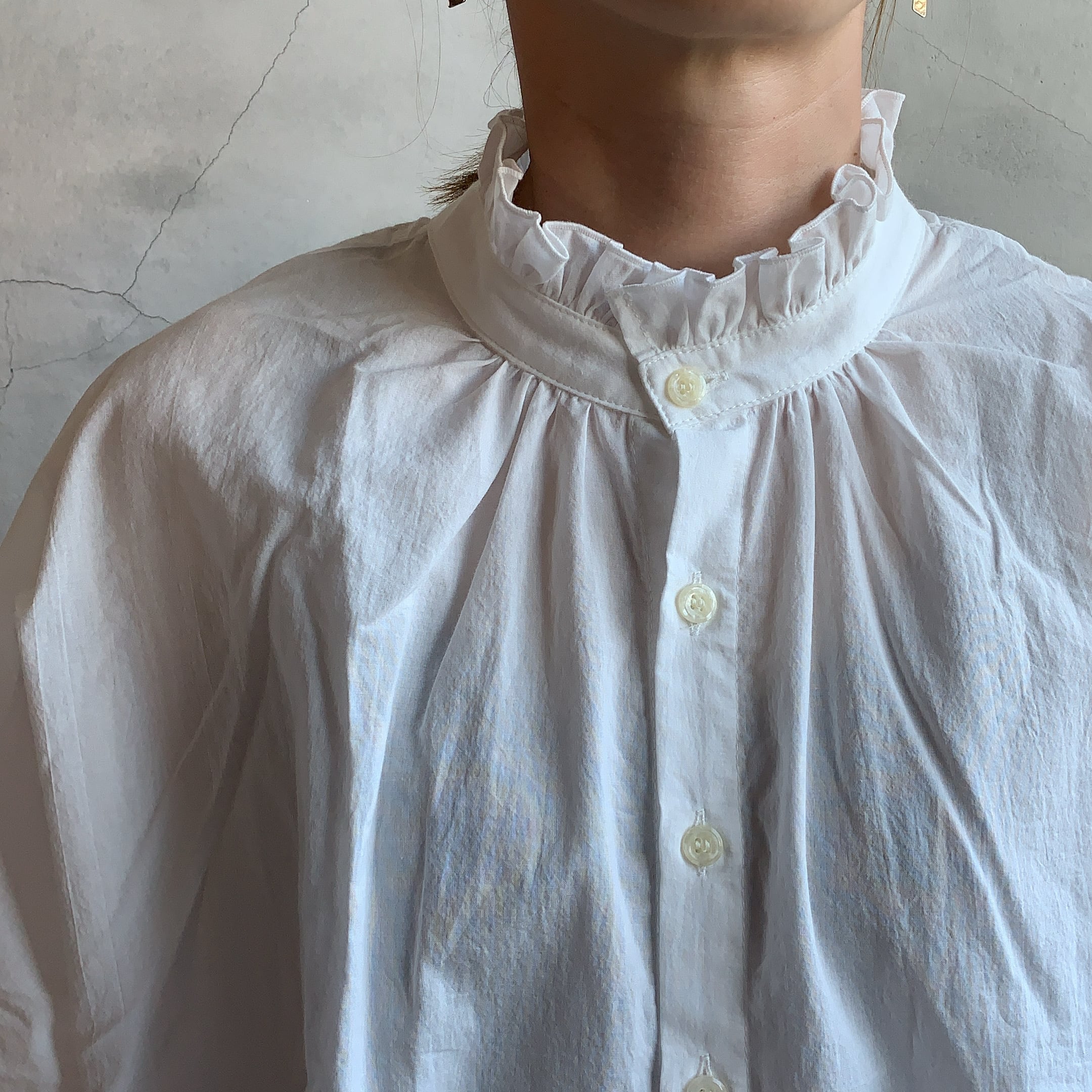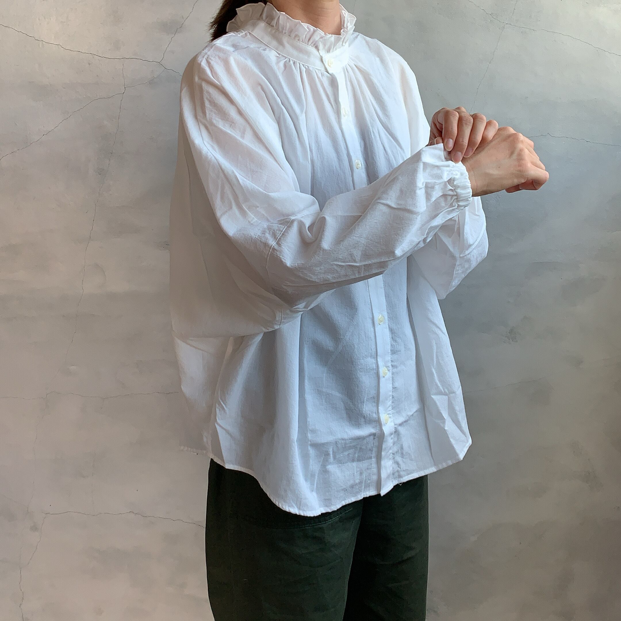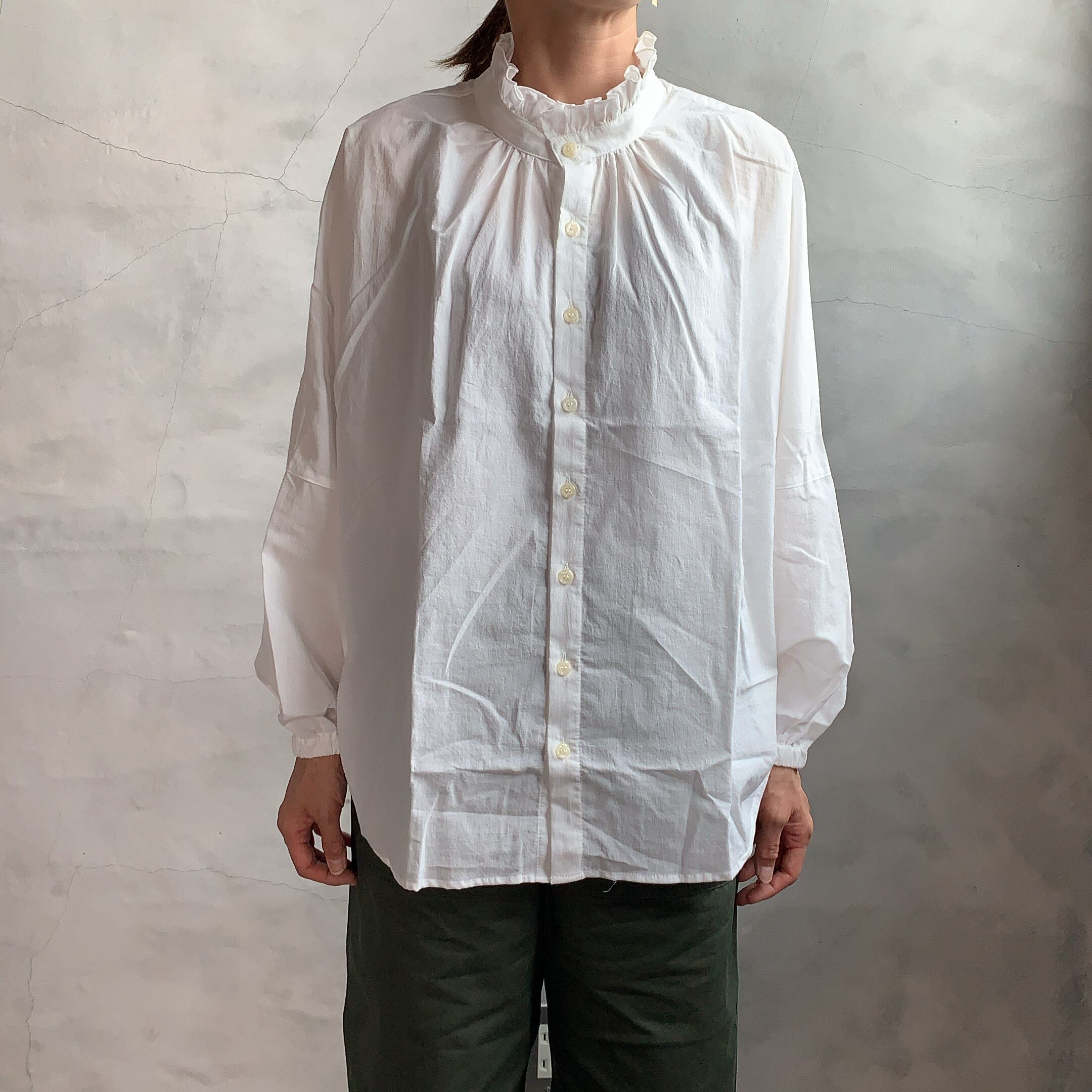 ゆったりと上品な落ち感のドルマンシャツです。フリルカラーと首元のギャザーでクシュっとなった襟元がコーディネートのアクセントに。前後2WAY使用になっているので、気分に応じて楽しんでいただけます。綿100%を使用しているので、ご自宅で簡単に丸洗いしていただけます。豊富なカラーもオススメのポイントです。