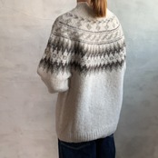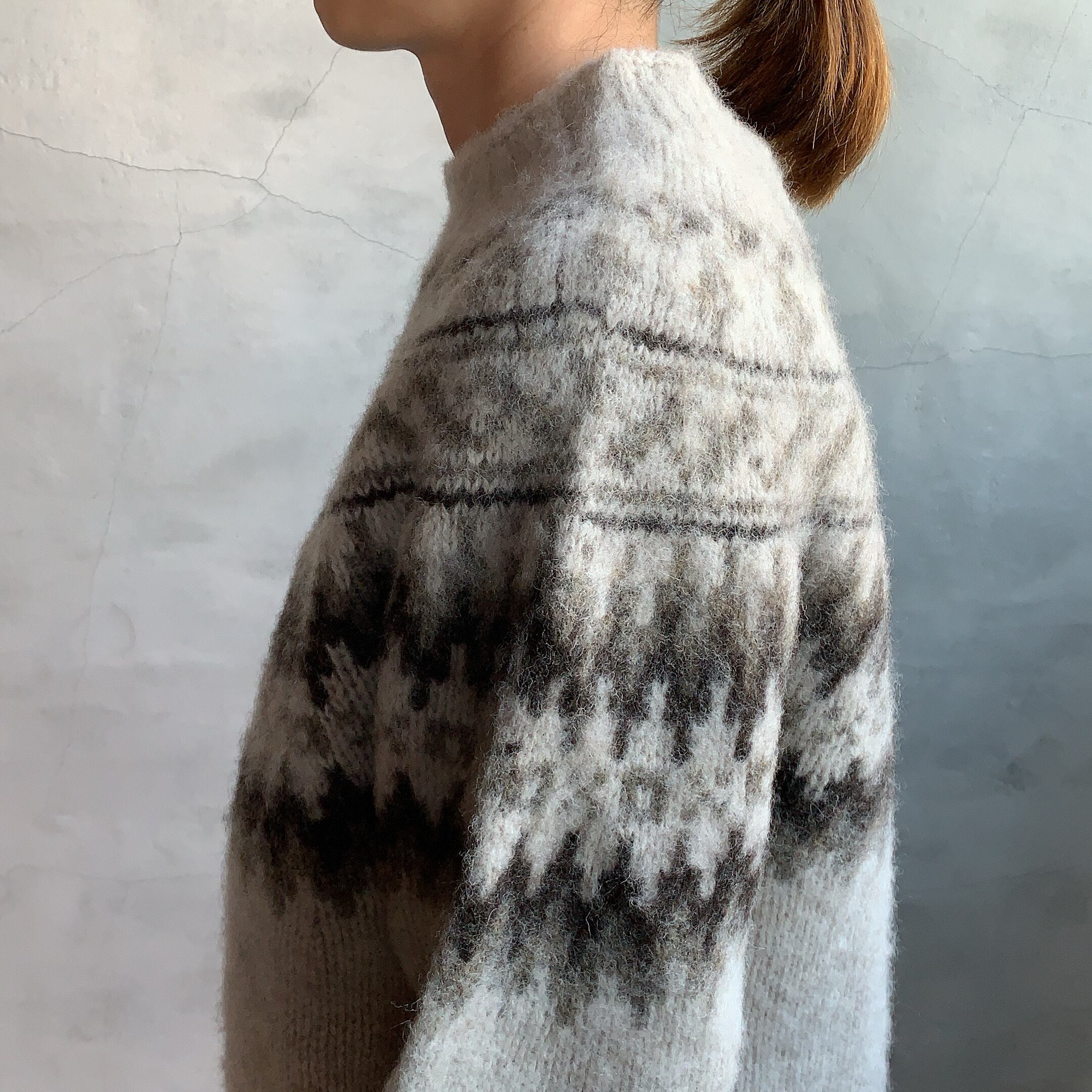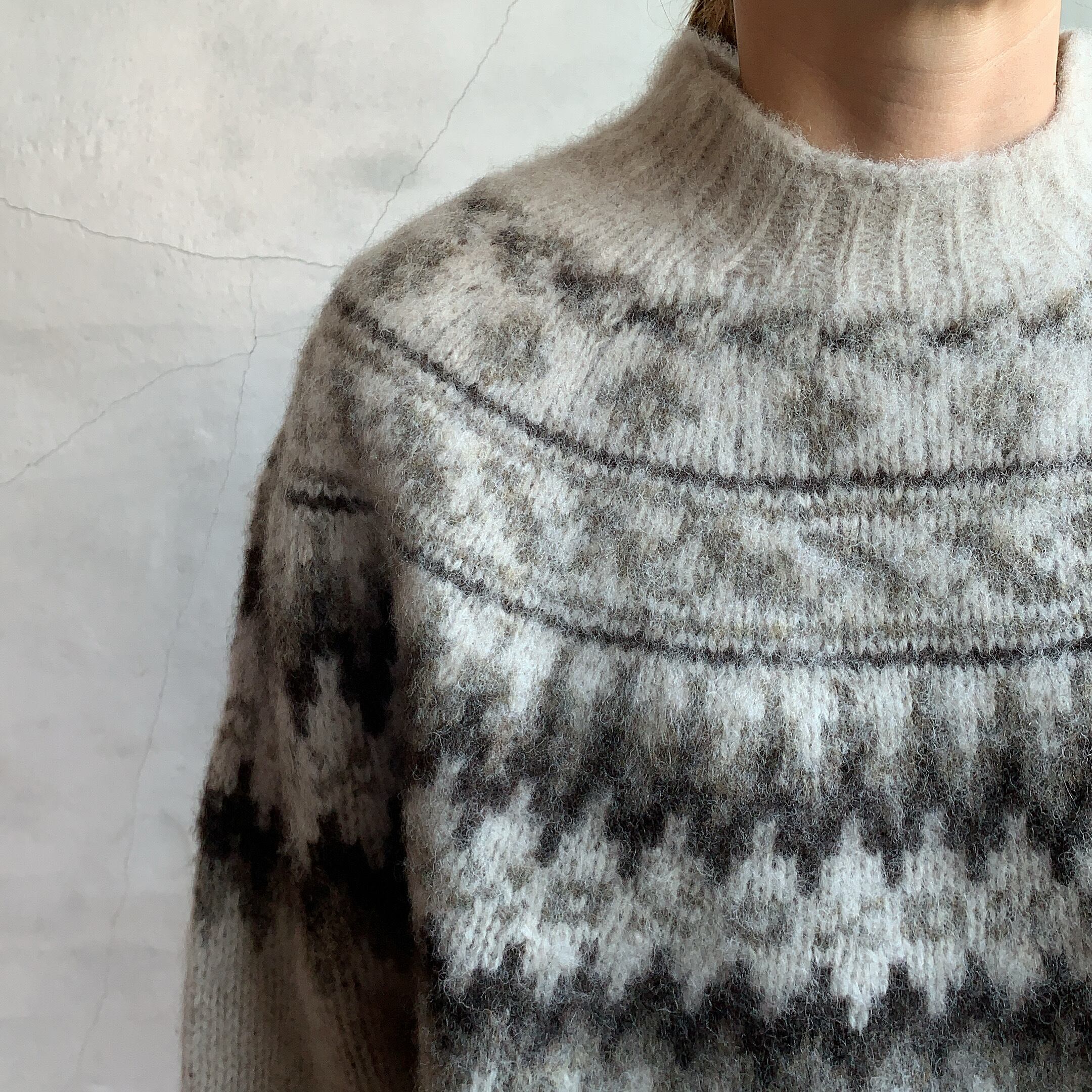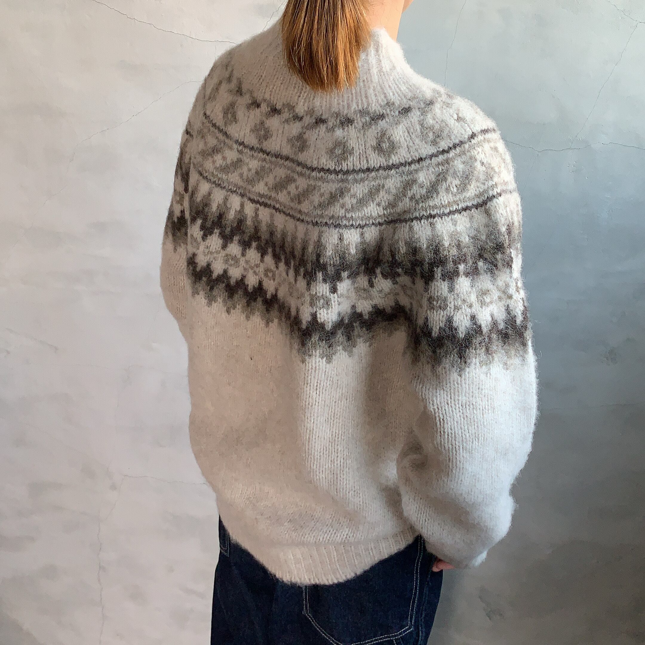 ハーレーオブスコットランドから、雪柄のモックネックセーター。某大手ブランドのファクトリーとしても稼働しているイギリスの名門ニットメーカーから、首回りに特徴的な柄を配した雪柄セーターです。はっきりとした色の糸を使い、編み上げたニットです。胸元まで大振りな柄が入り、コーディネートのアクセントとして機能してくれます。首元は高めに設定されたモックネックです。生地はイギリスのピュアニューウールを使用し、ミドルゲージで編み上げた、適度なボリュームのある厚み、ふんわりとした軽さもあるニットです。