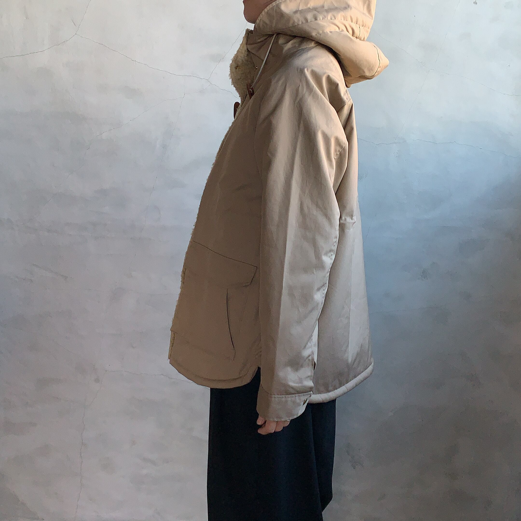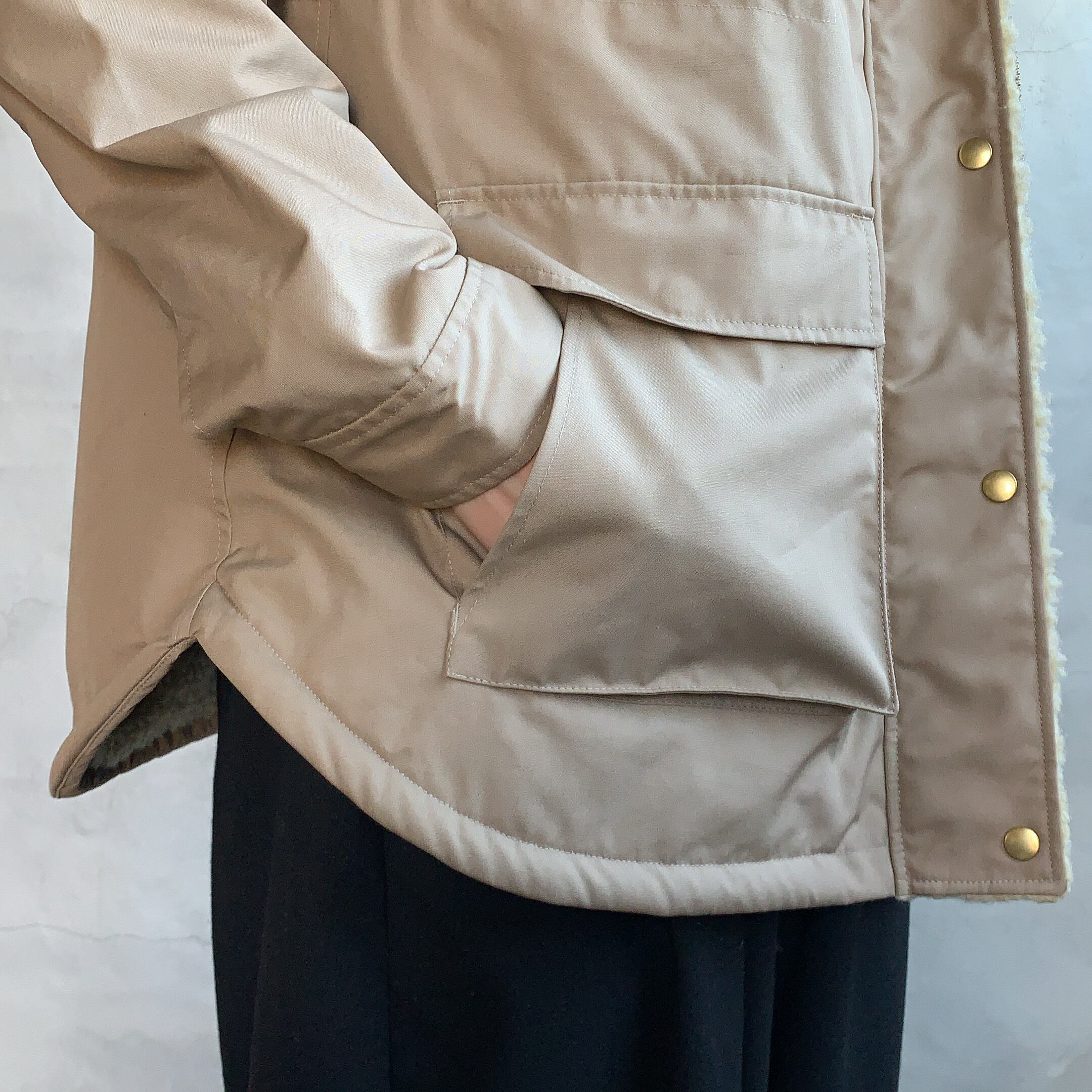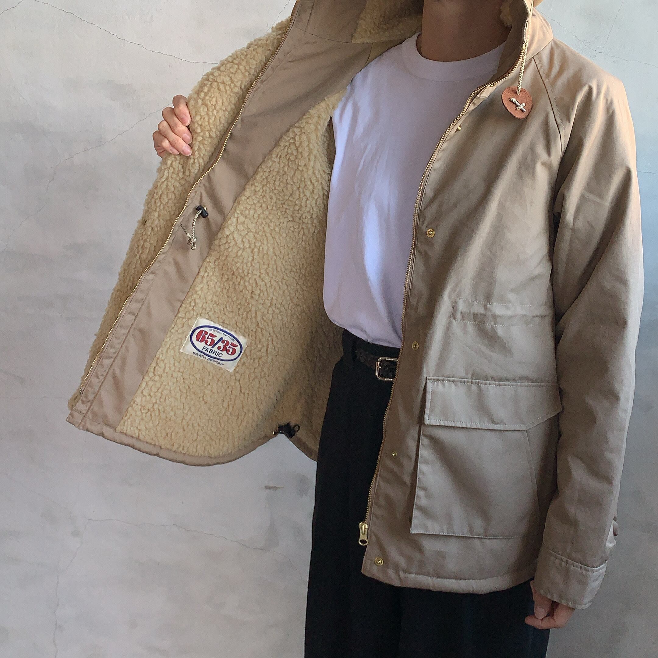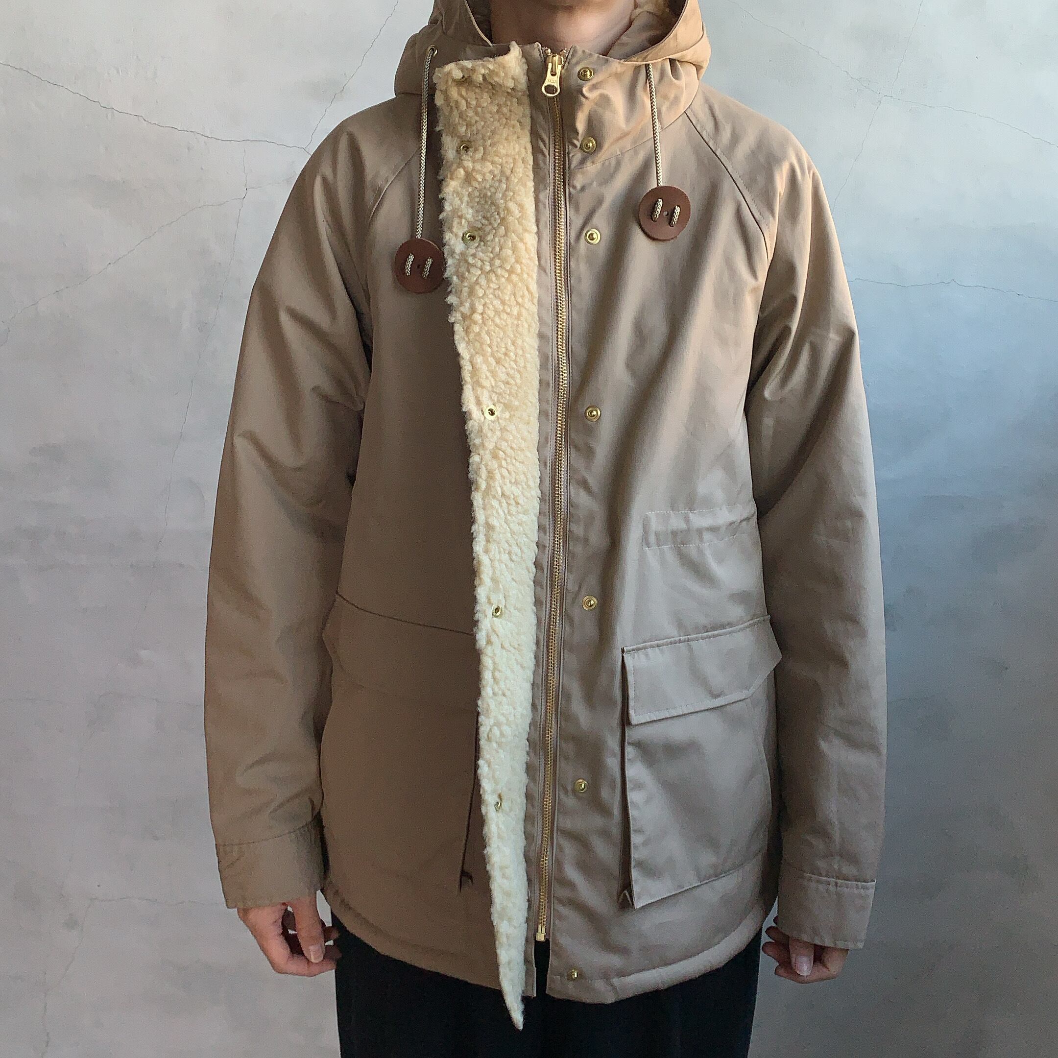 表地はポリエステル/コットンの65/35クロス。60/40クロスの様に引き裂きや摩擦に強いこの生地は、60/40クロスと共に古くからアウトドアに愛されてきた生地であり、現在も多くのジャケットに採用されています。 中には暖かいボアが付いていますが、着る時に邪魔にならないよう、袖にはあえて付けておりません。 前立てからボアがはみ出て見えるのもポイントです。