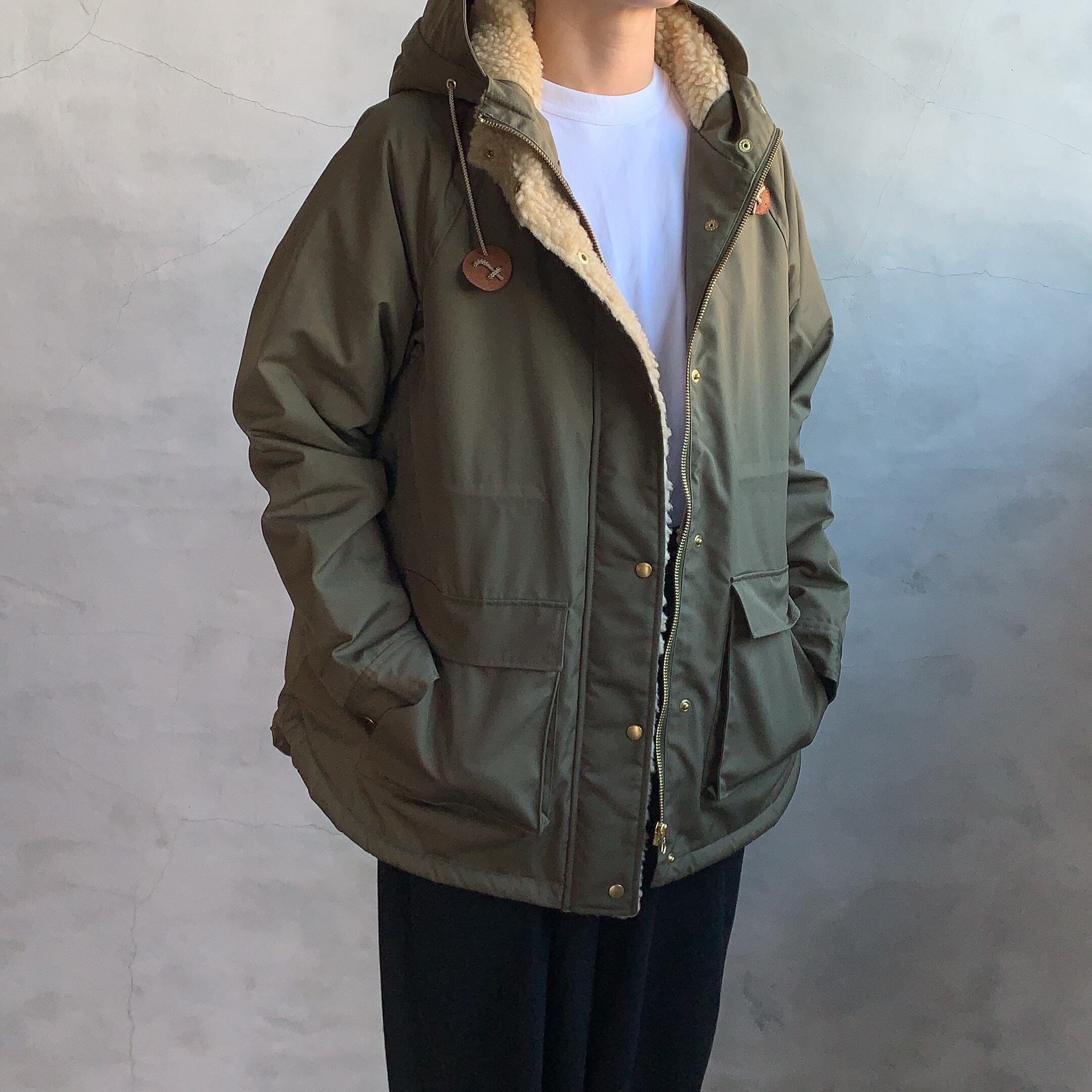 表地はポリエステル/コットンの65/35クロス。60/40クロスの様に引き裂きや摩擦に強いこの生地は、60/40クロスと共に古くからアウトドアに愛されてきた生地であり、現在も多くのジャケットに採用されています。 中には暖かいボアが付いていますが、着る時に邪魔にならないよう、袖にはあえて付けておりません。 前立てからボアがはみ出て見えるのもポイントです。