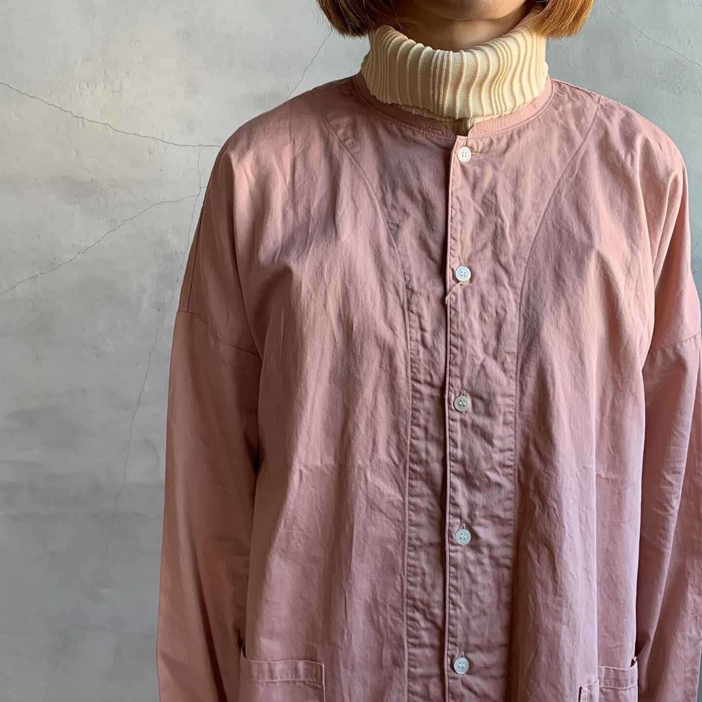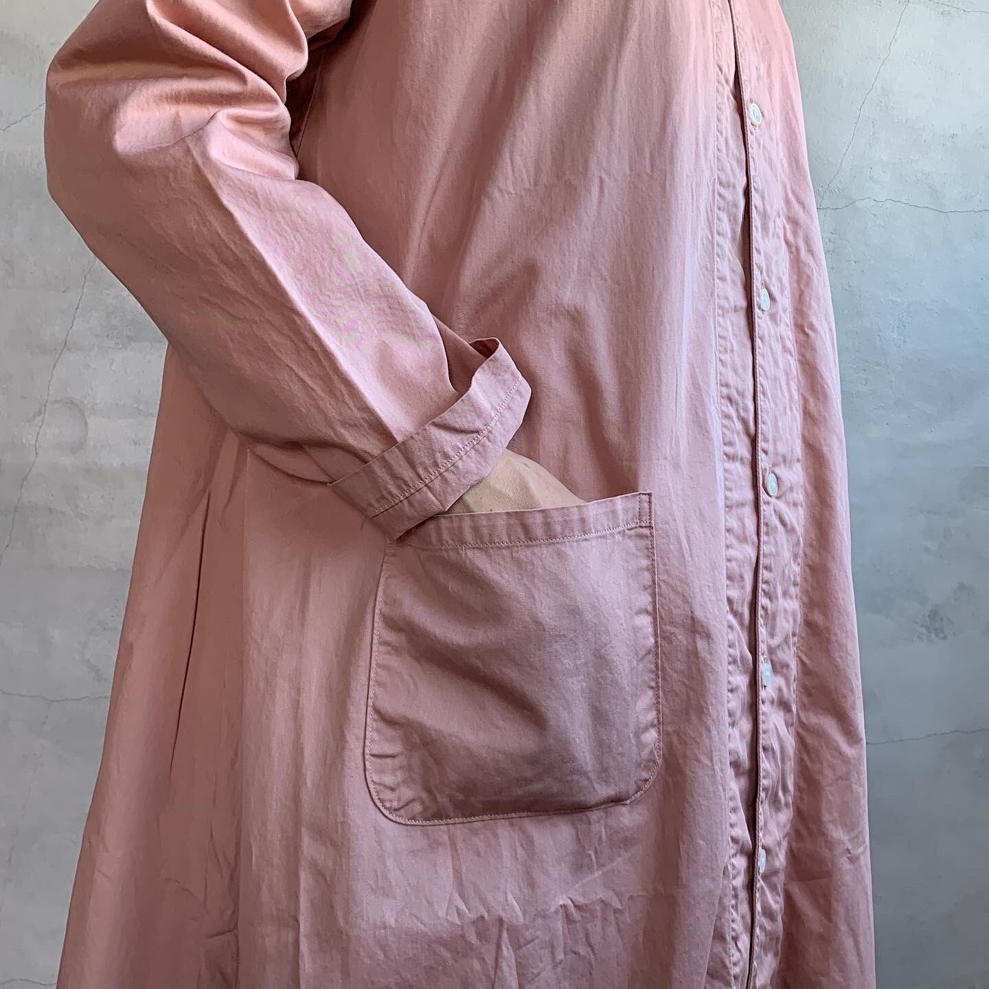 小さな襟とゆったりロングなシルエットが特徴のアトリエローブ。