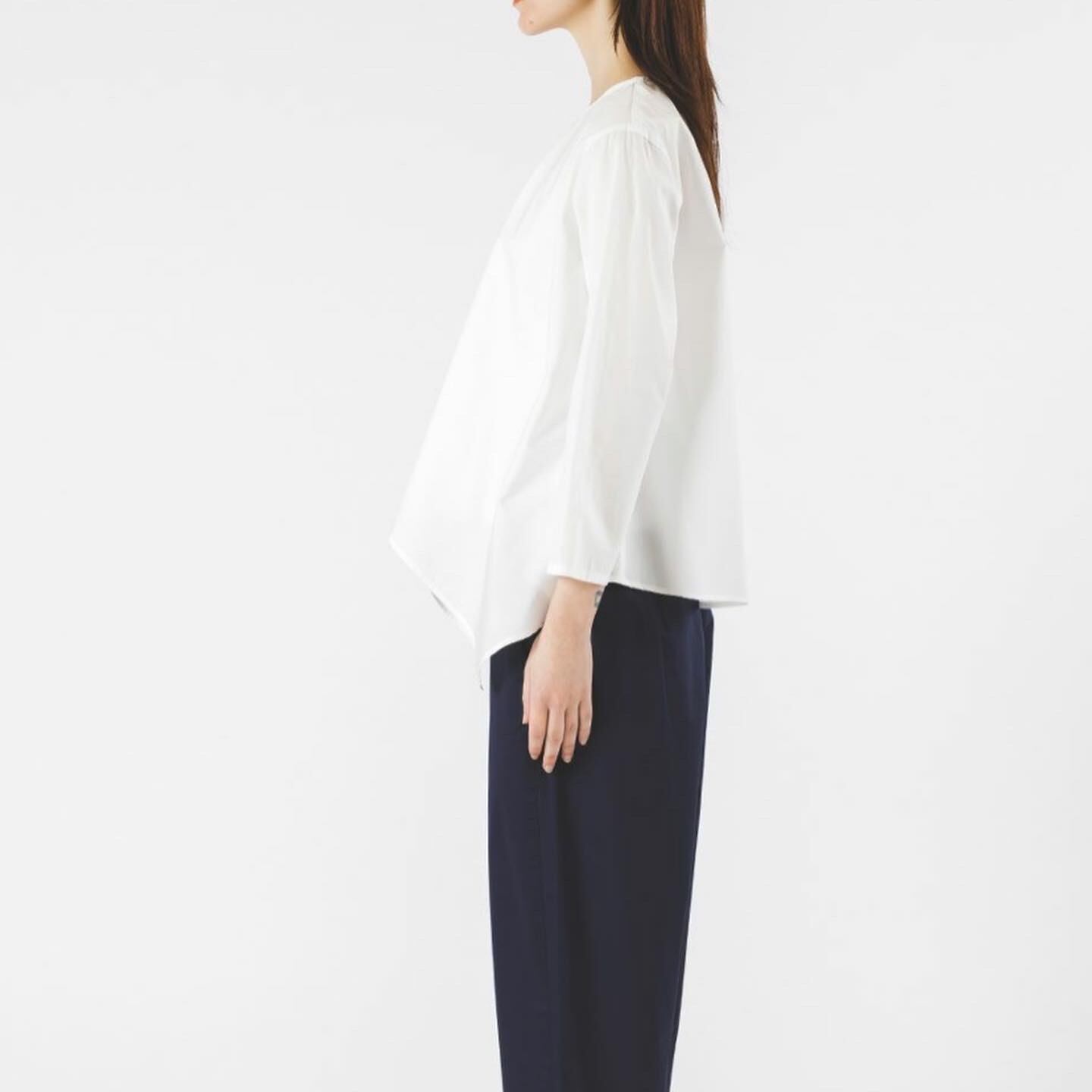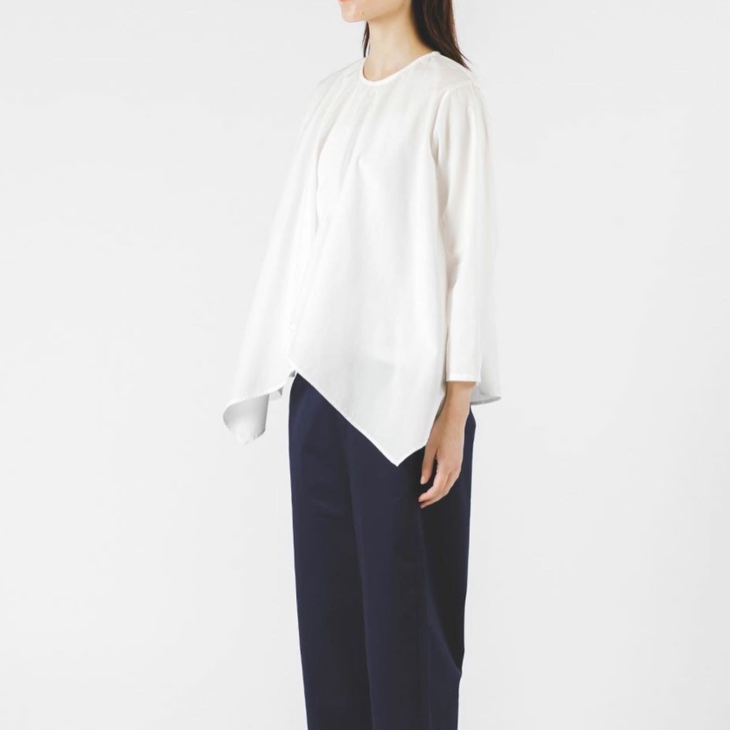 50ブロードを使用したノーカラーフレアラウンドヘムプルオーバーシャツです。変形ヘムのシルエットがとてもきれいで優しく動きのあるデザインが特長的。シンプルに透明感のある着こなしを演出できる1枚。ベストに合わせてもヘムの遊びがポイントになるシャツです。バックネックにボタン開き有り。着脱しやすいデザインに仕上がっています。