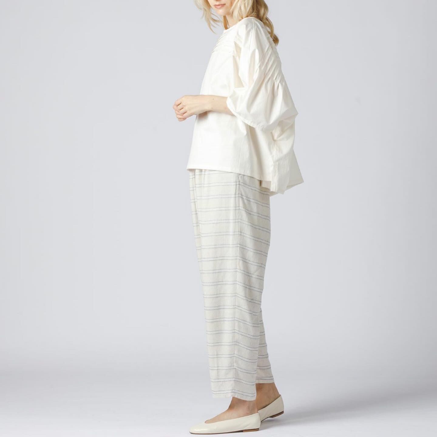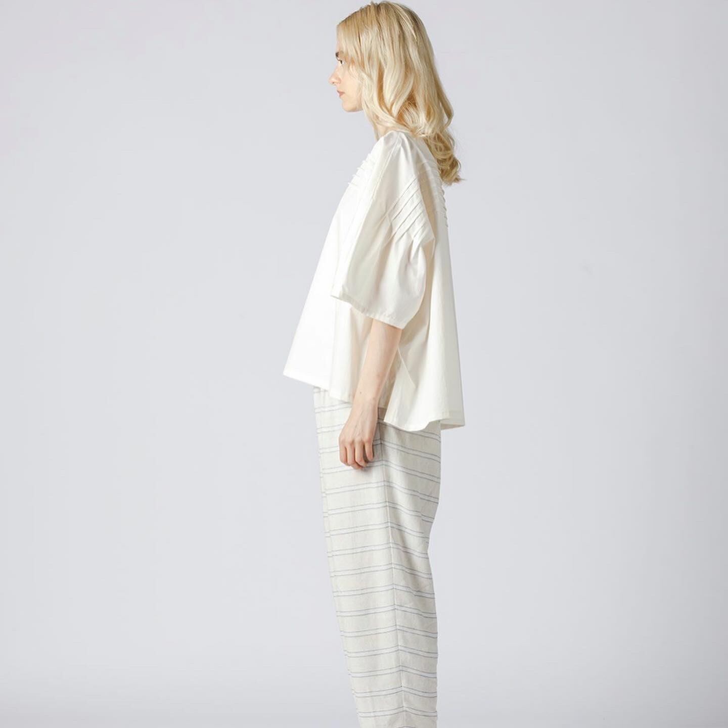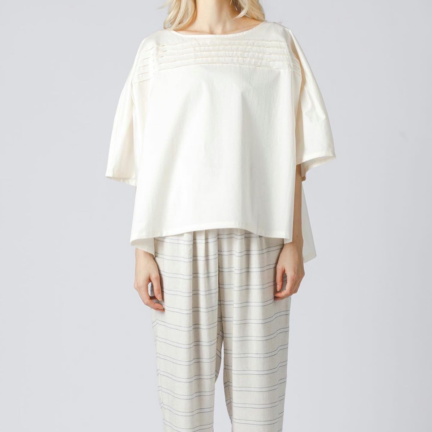 80強撚素材を使用したピンタックドルマンスリーブプルオーバーです。独特な加工を施す事で光沢感としなやかさを表現しました。フロントとバックの上部のみピンタックを施したシンプルなデザインが特長的。人気のドルマンスリーブは通気性も良く涼しげな着こなしを演出します。オフホワイトは白さを控えたアイボリーに近いカラーに仕上がっています。オフホワイトは透け感がございます。ヒップにかかる程の丈感でスッキリとした清楚な1枚。