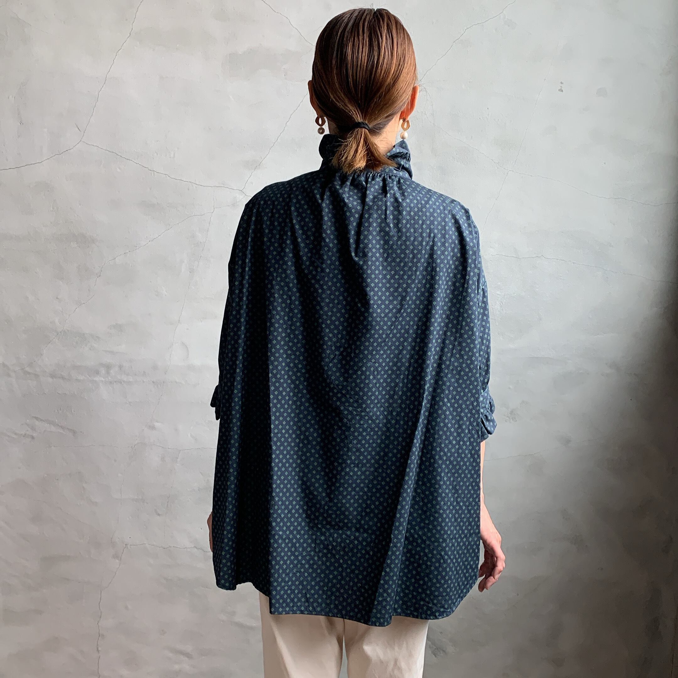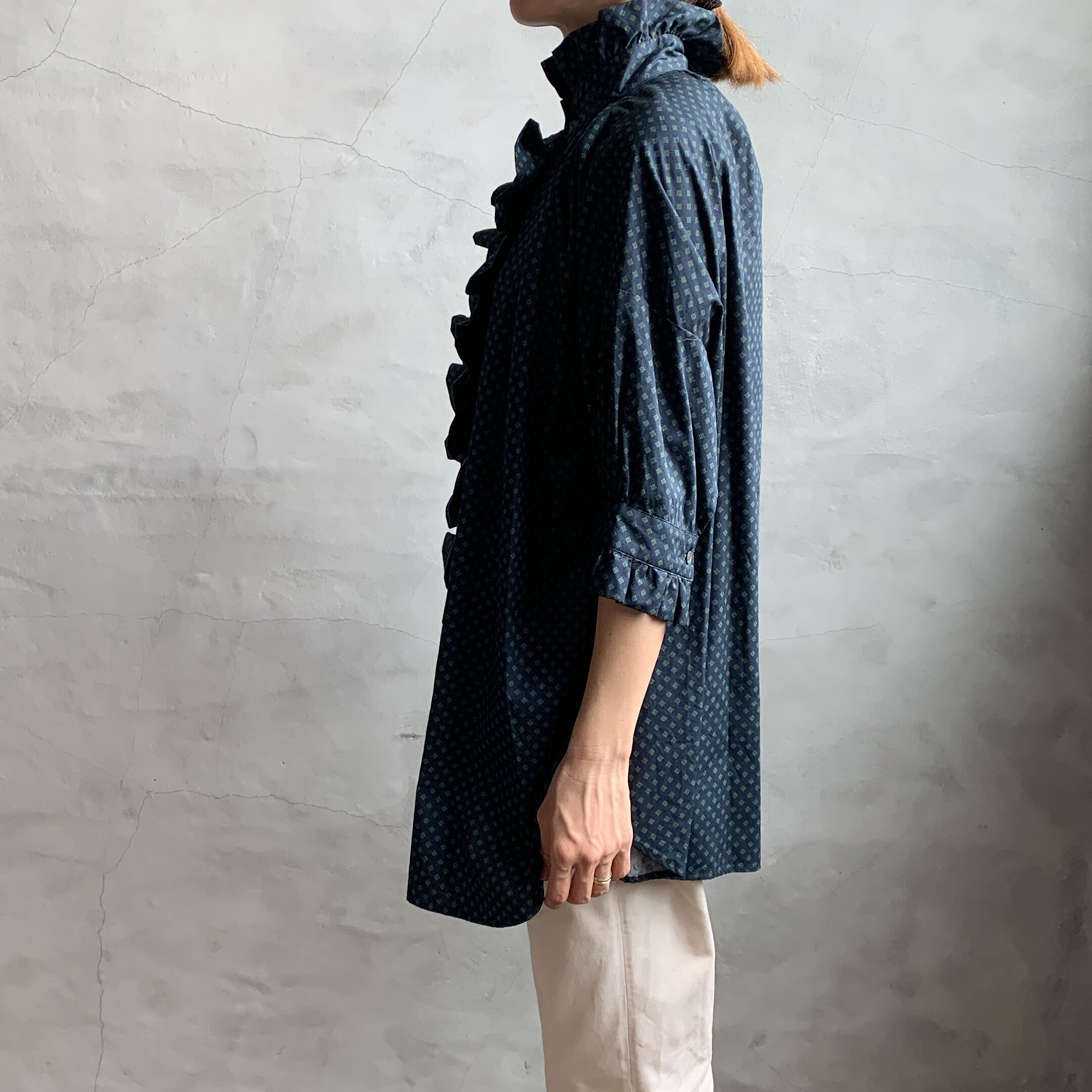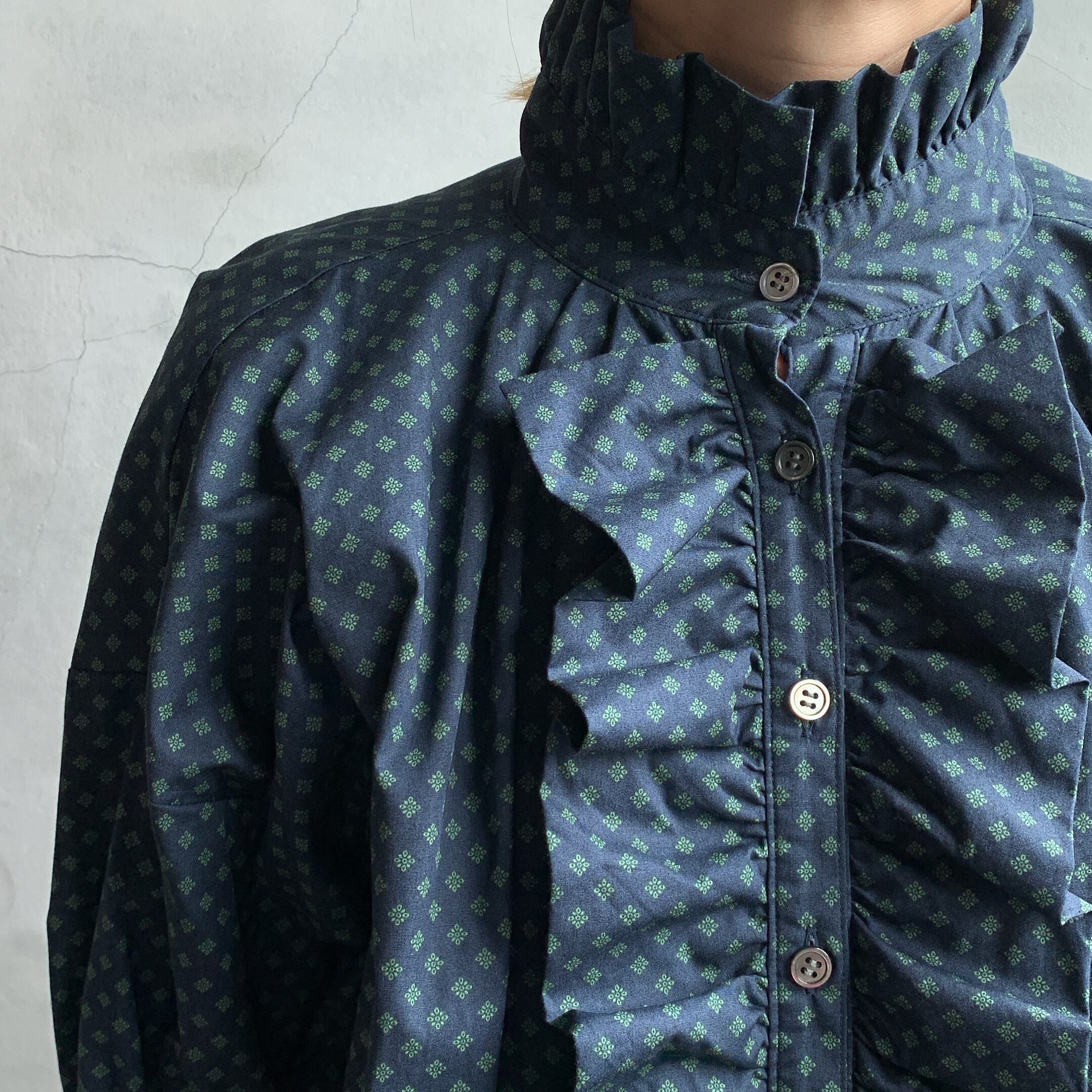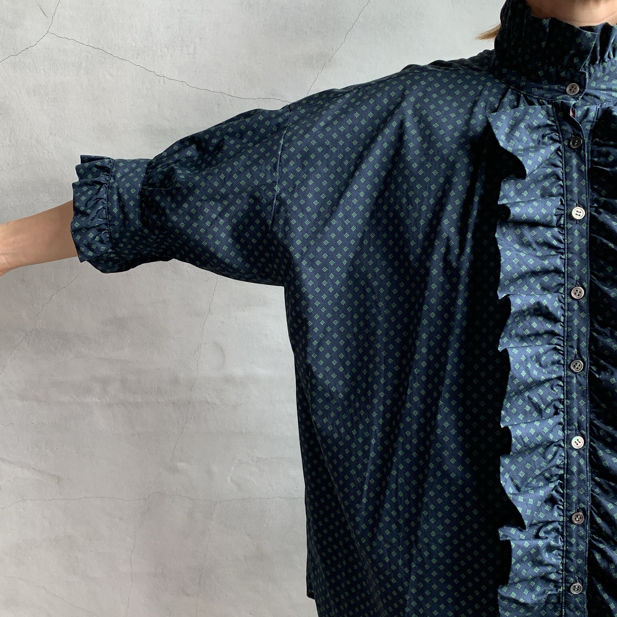 dahl’iaより小紋柄フロントフリルロングシャツが入荷いたしました。