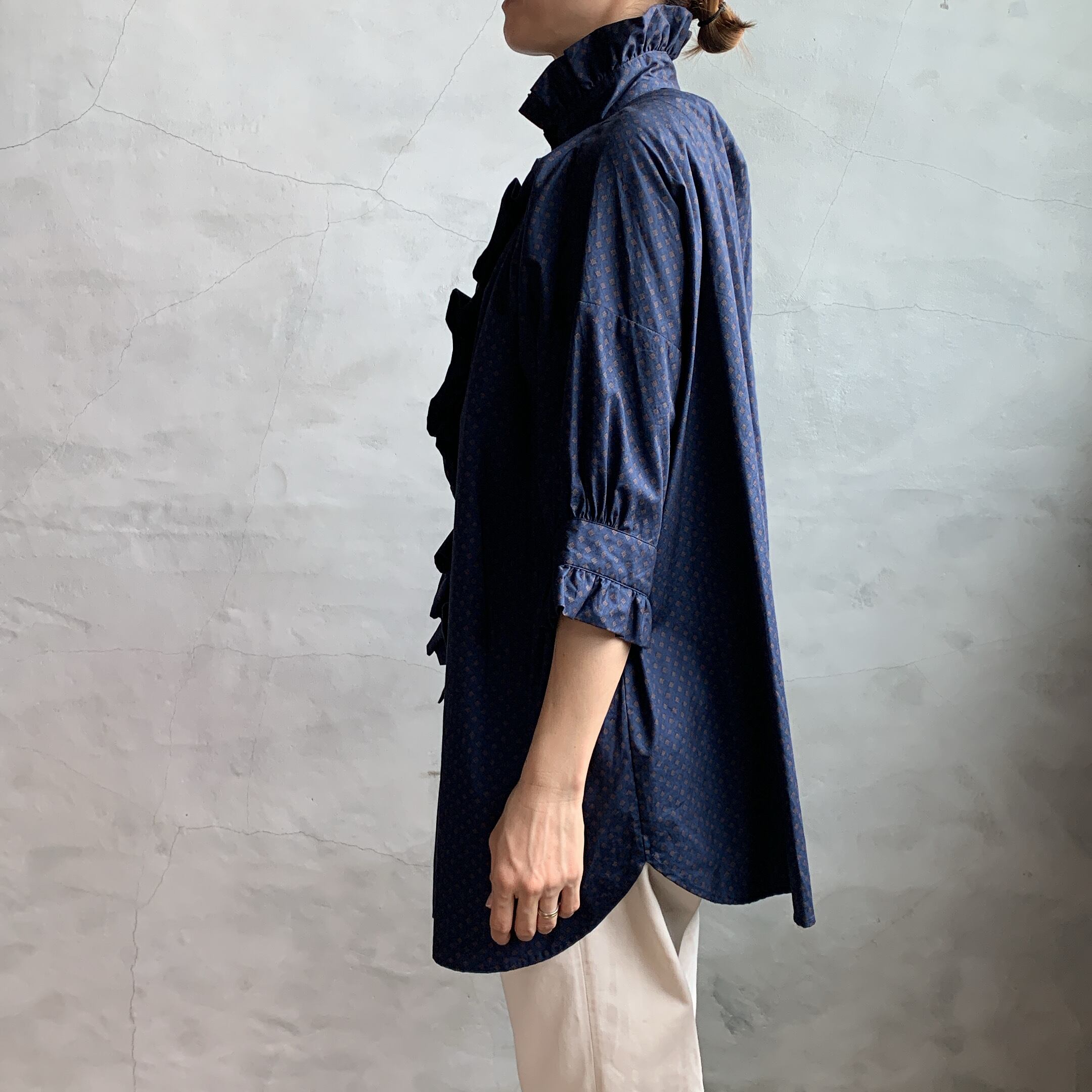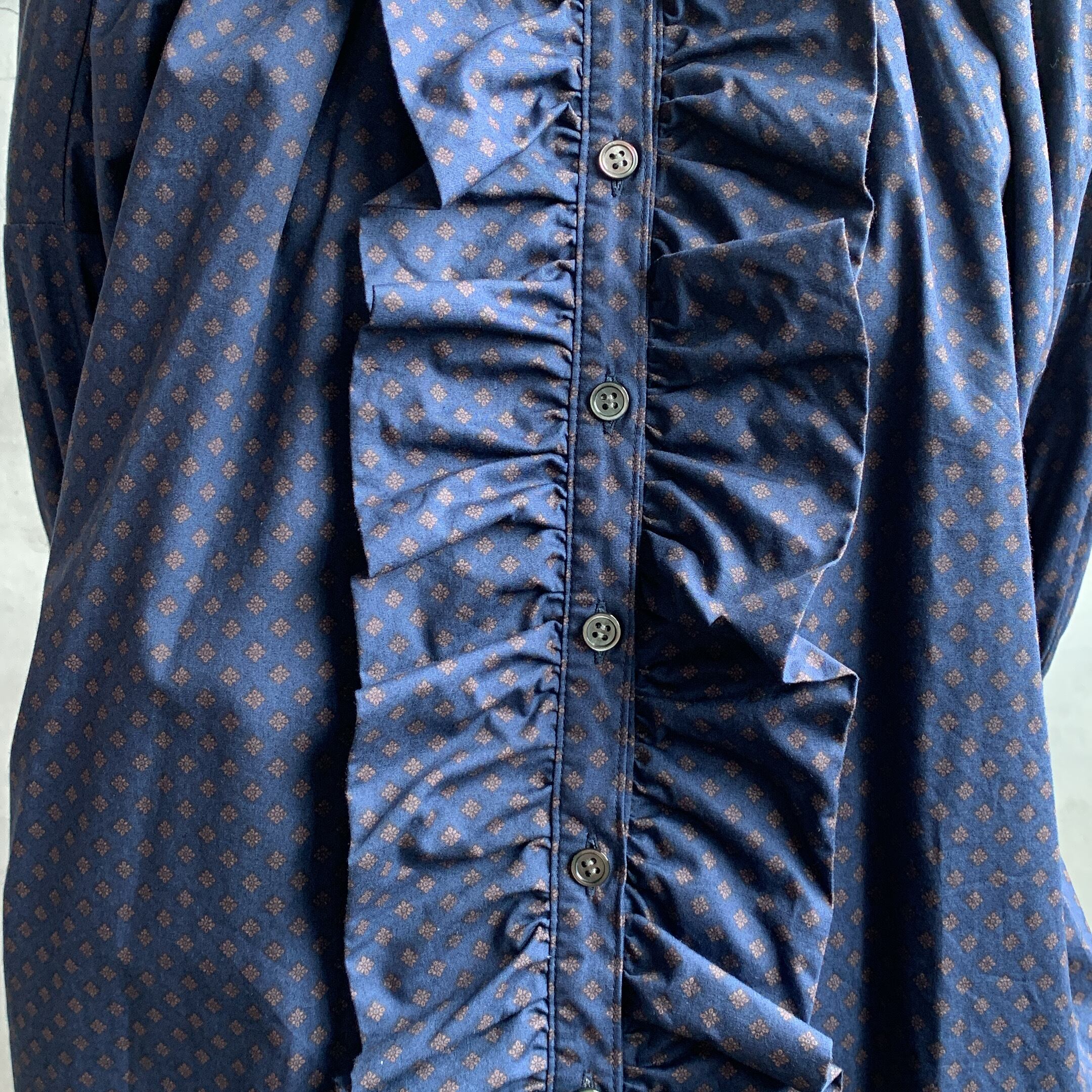dahl’iaより小紋柄フロントフリルロングシャツが入荷いたしました。