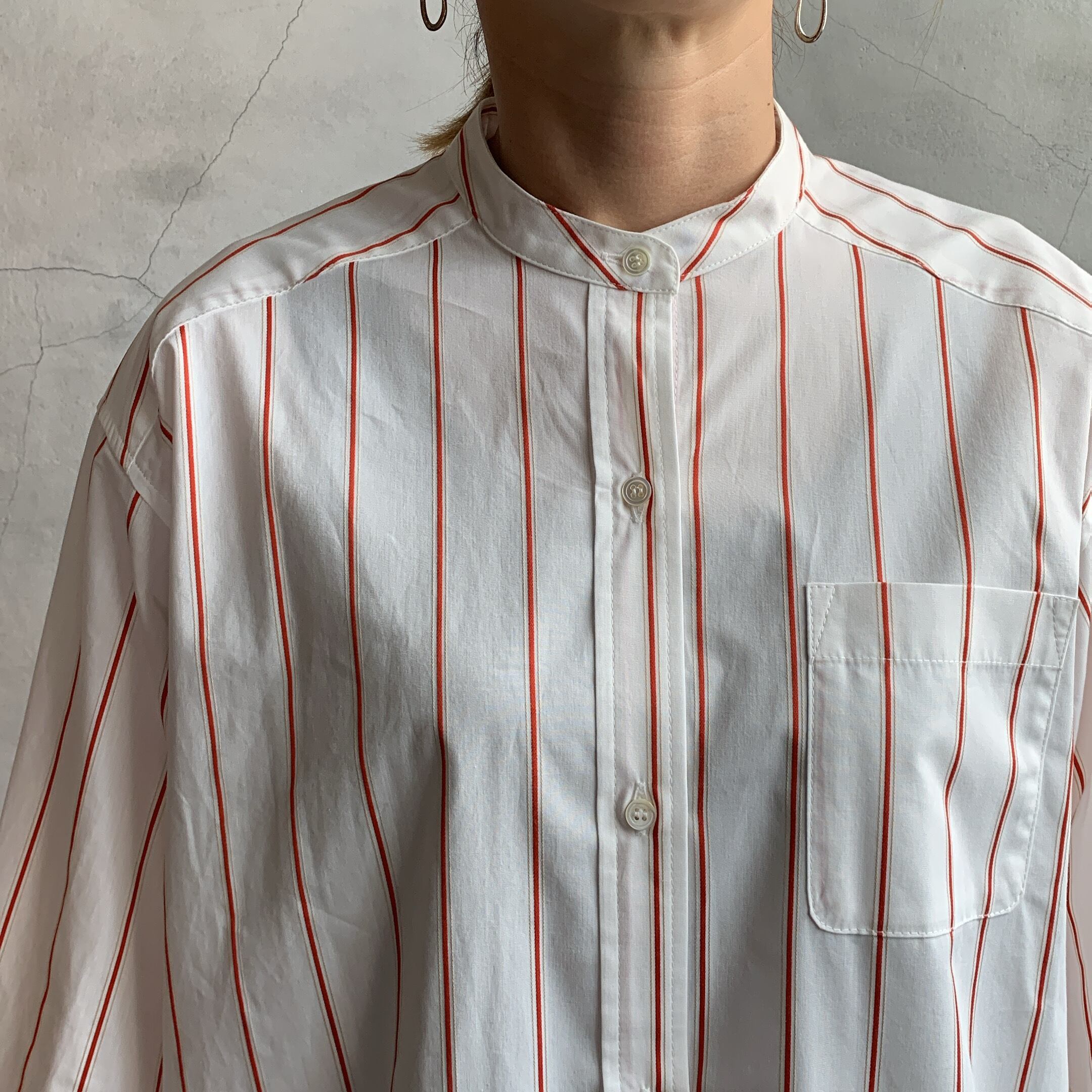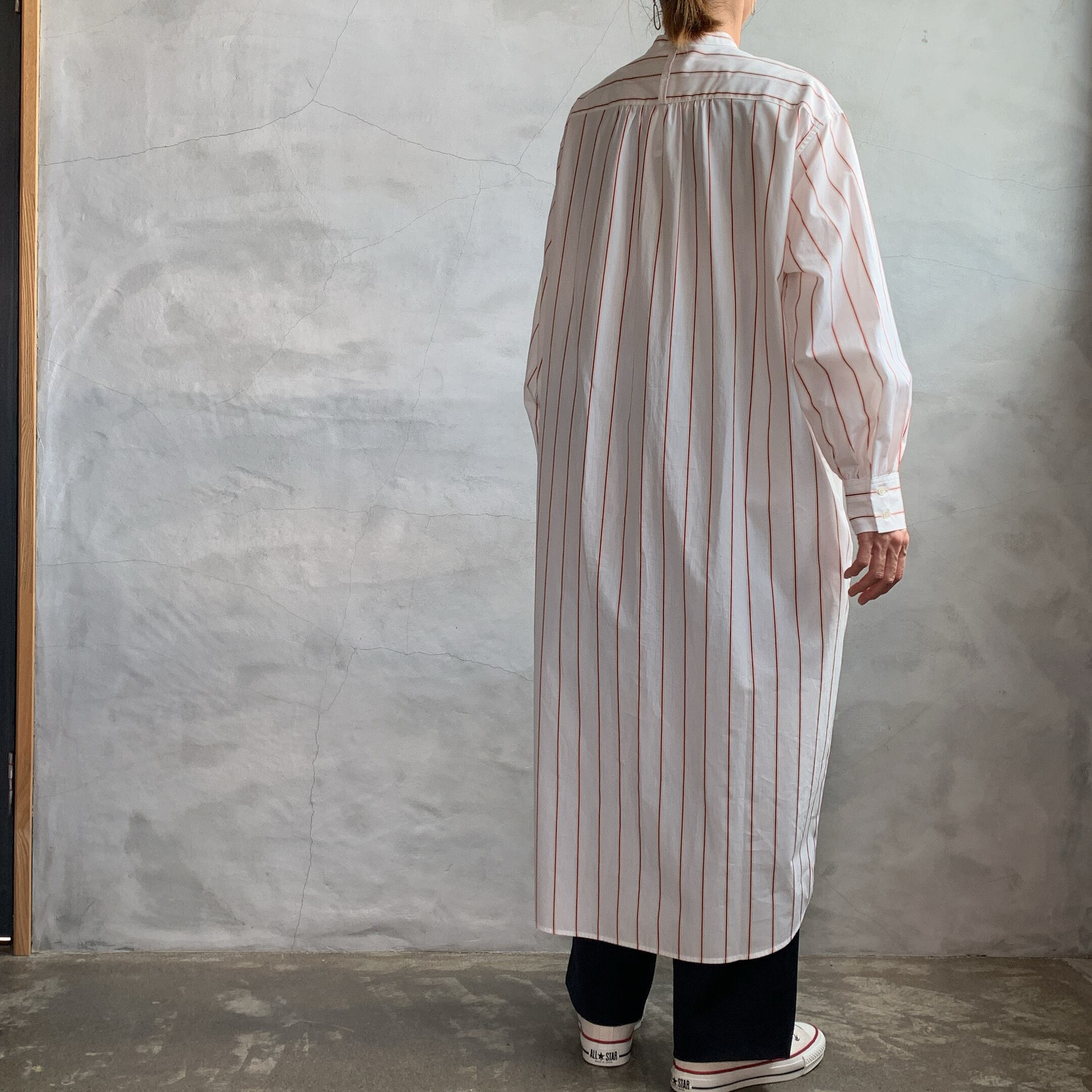 ストライプ部分をサテン組織にすることでスッキリとしたクリーンな印象が特長。シャープなバンドカラーから裾までフロントボタンを施しました。羽織でコーディネートをしても素敵でレイヤードができる1枚。