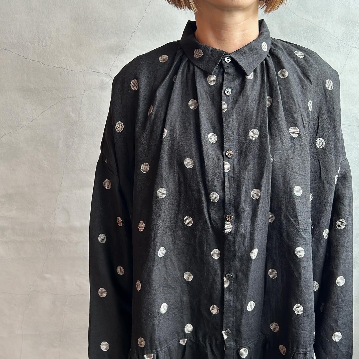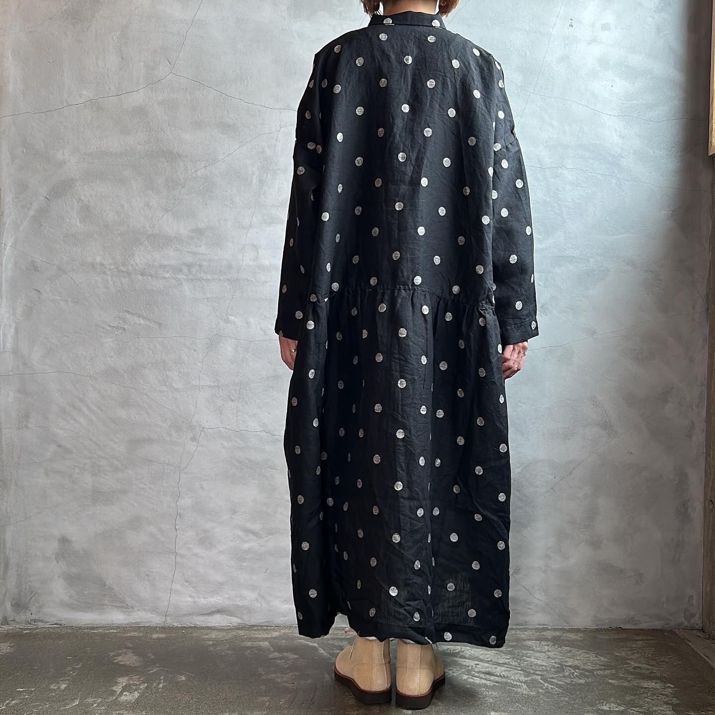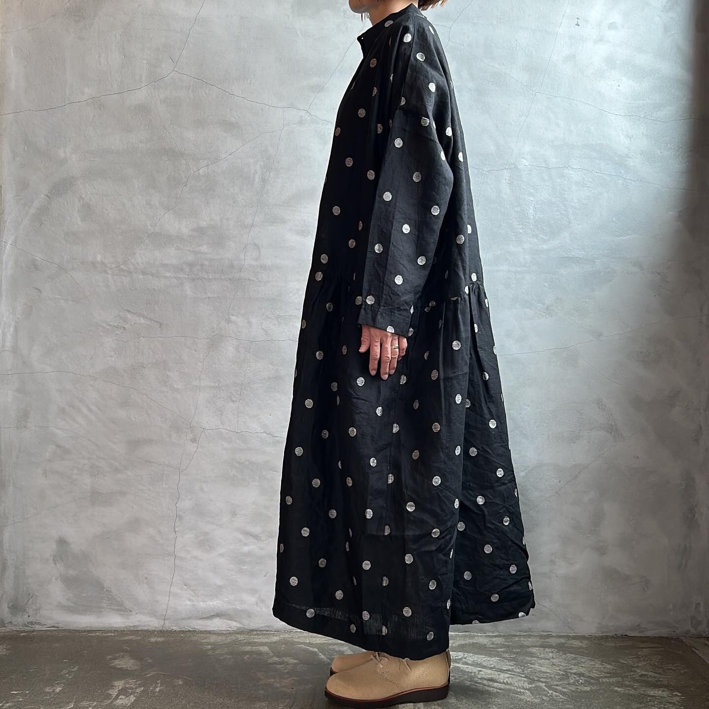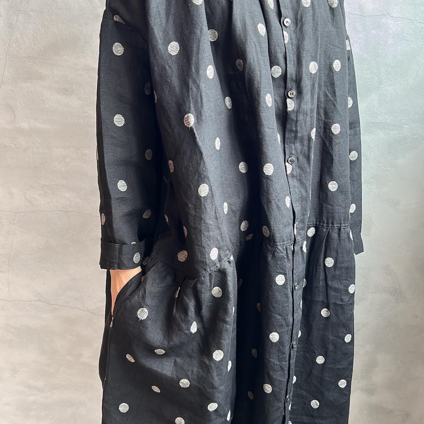 素朴な素材感あるオーガニックリネンにドット刺繍がアクセントになった Antiquités オリジナルのリネン。ドットとドットの間隔、大きさ、配色カラーなどにこだわってできた刺繍ドットです。プリントとは違うさり気ない凹凸感あるドットは、着て洗うほどに刺繍がなじみ雰囲気ある表情に。ブラックベースに × ナチュラルドット、凛とメリハリのある配色です。
