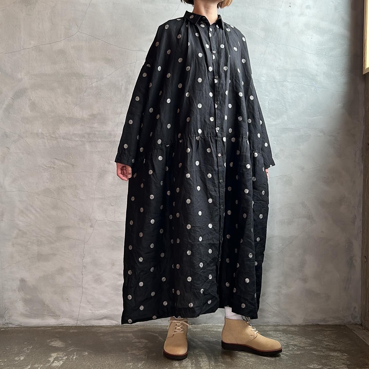 ichiAntiquités 800302 Organic Linen Embroidery Dots Shirt Dress / C : BLACK