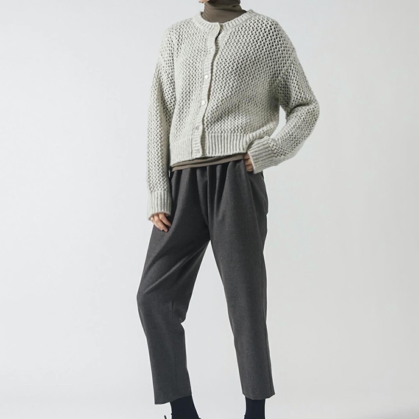 メッシュ編みの中ゲージシリーズ、メッシュクルーネックカーディガンです。インナーの透け感が分かるほどのメッシュ編みが特長。裾の長さはヒップ上のスッキリとした丈に仕上げました。肉厚過ぎず薄手過ぎないカーディガンで暖かく着こなせる1枚。上からアウターも着やすいサイズ感になっています。落ち着きのある優しい色合いでシックにコーディネートができるカーディガンです。