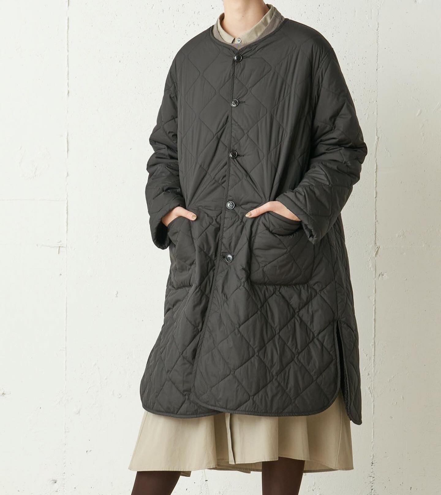 毎年人気のリバーシブルキルティングシリーズ、キルティングリバーシブルコートです。今シーズンはキルトステッチをカジュアル過ぎないデザインに仕上げました。裏地はリサイクルポリエステルを使用。ノーカラーのスッキリとしたデザインとゆったりとしたサイズ感です。キルティングシリーズの中で一番丈が長くなります。サイドスリットを施したことで足さばきもよく動きやすいデザインに仕上がっています。手袋をしても手がすっぽりと入る大きなポケットが付いた冬に快適な仕様。軽さはもちろん暖かく、リバーシブルでコーディネートができるお勧めの1枚です。