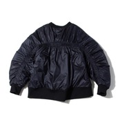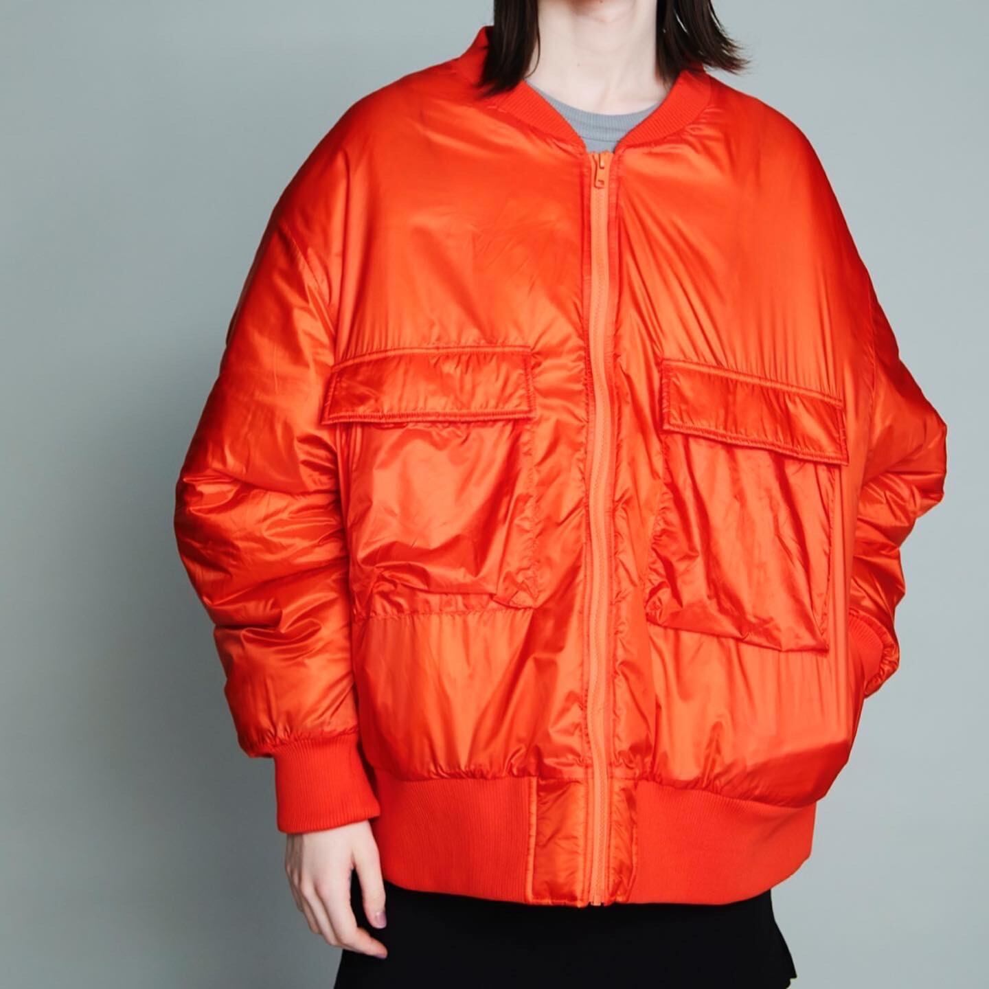 発色性と柔らかさの出る特殊ナイロン素材を使用し、軽量かつ保温性のある中綿を入れた、オーバーサイズのリブブルゾン。