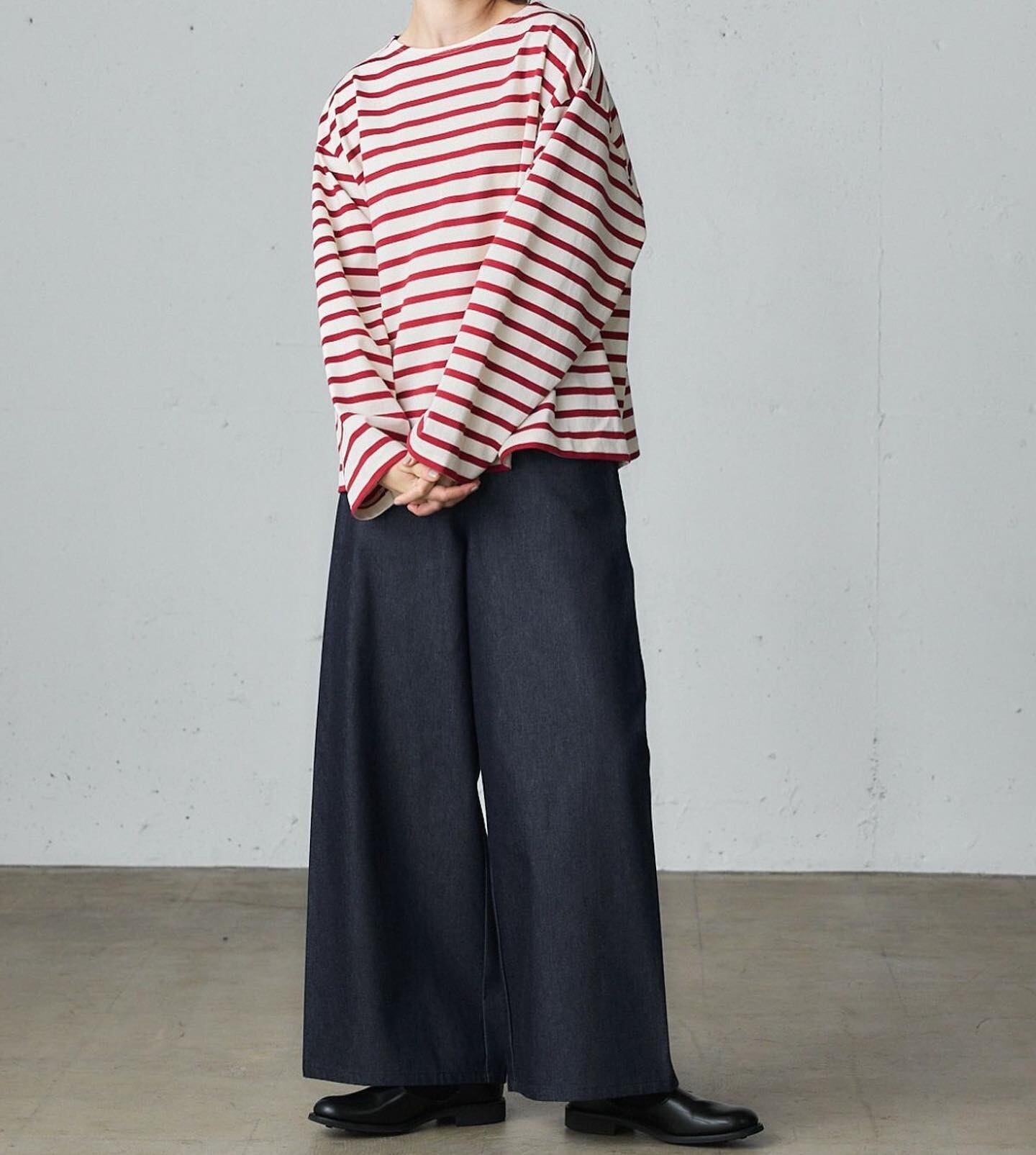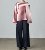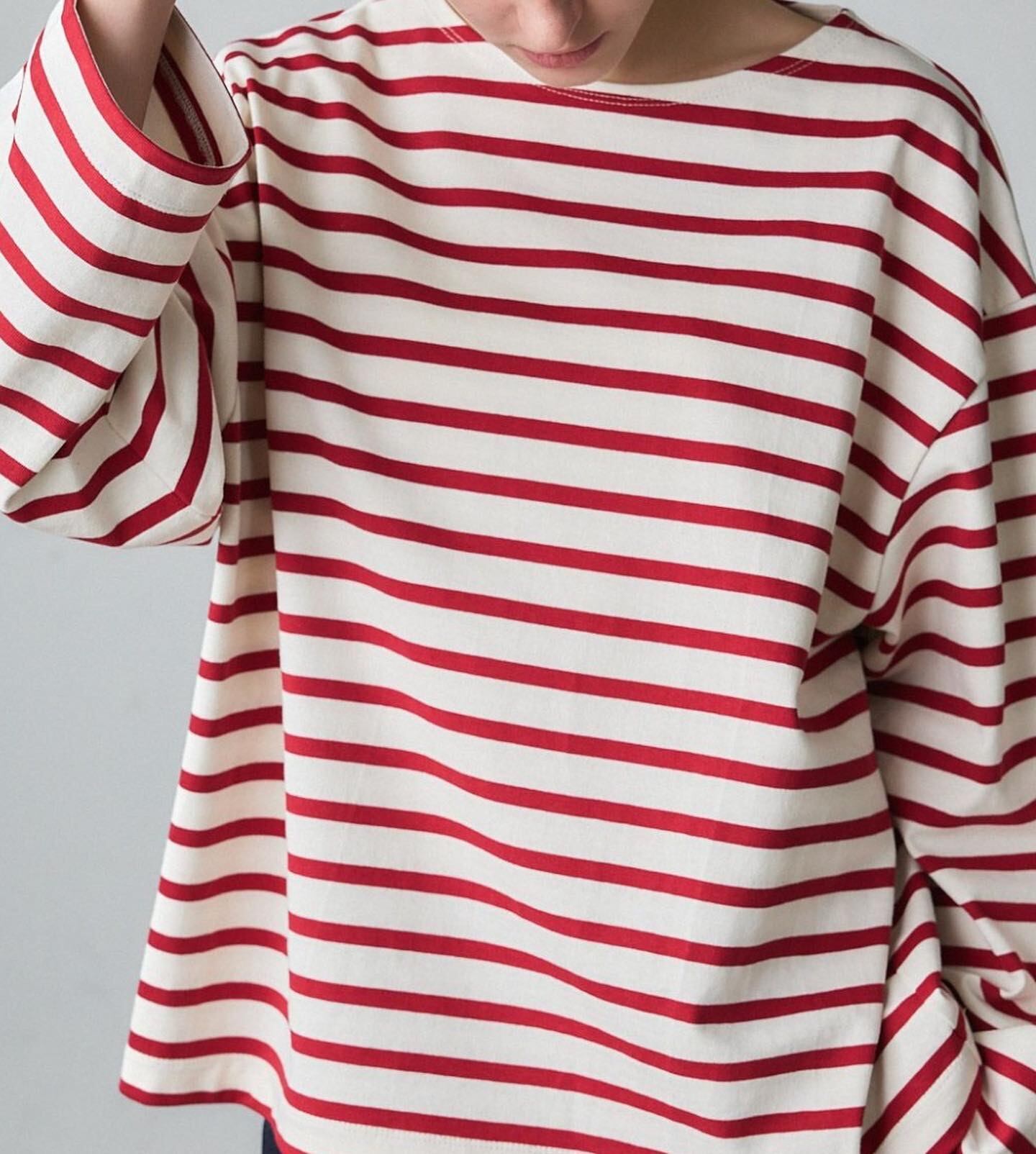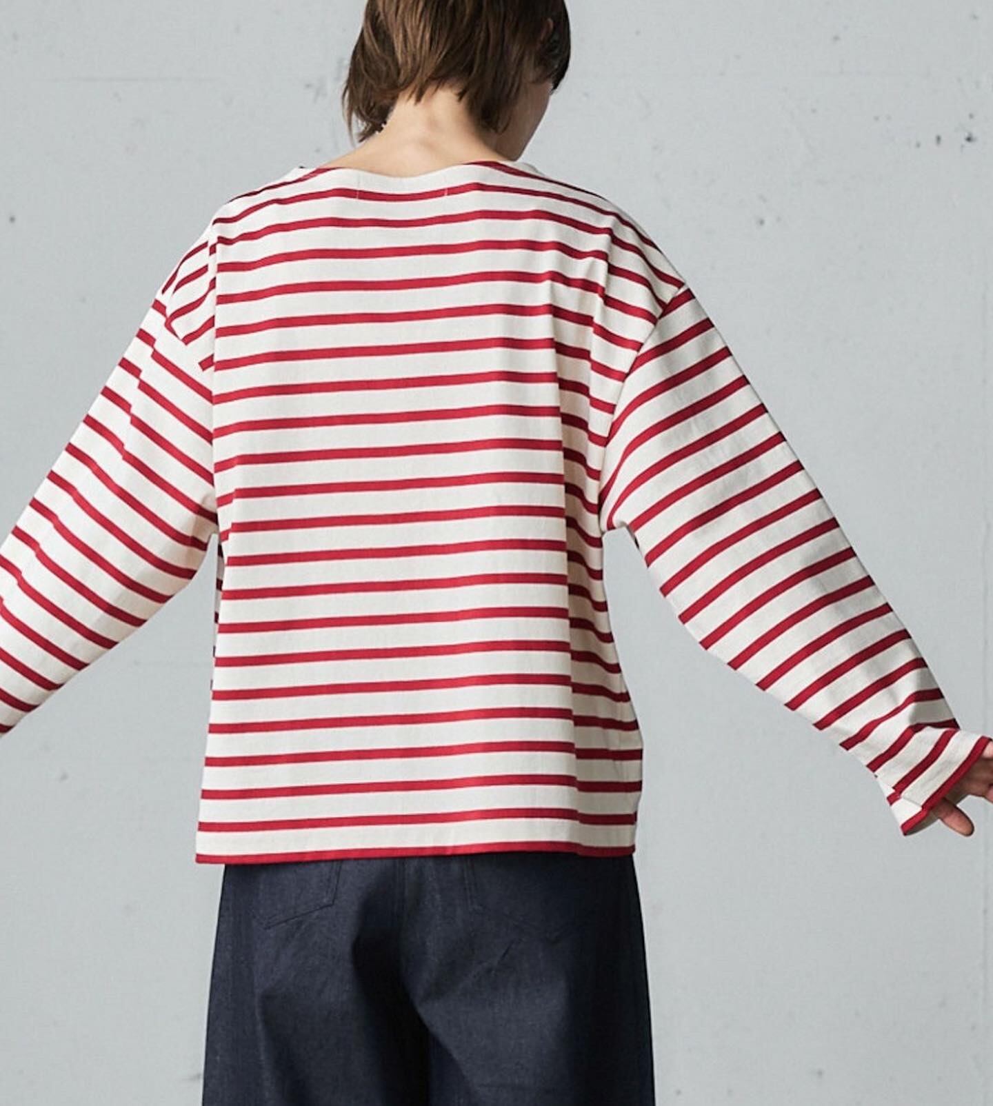 編み立て時に限界まで度目をつめたハリ感のあるボーダー天竺を使用したボーダーワイドプルオーバーです。ワイドなサイズ感でインナー合わせもしやすく長い時間着用できます。袖が通しがしやすいゆったり目の袖丈が特長。春先まで長く愛用でき大人のカジュアルにお勧めのボーダーアイテムです。