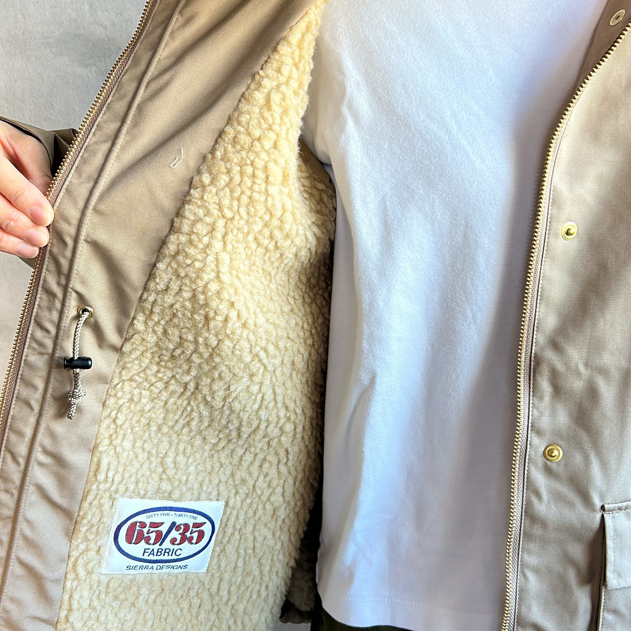 表地はポリエステル/コットンの65/35クロス。60/40クロスの様に引き裂きや摩擦に強いこの生地は、60/40クロスと共に古くからアウトドアに愛されてきた生地であり、現在も多くのジャケットに採用されています。