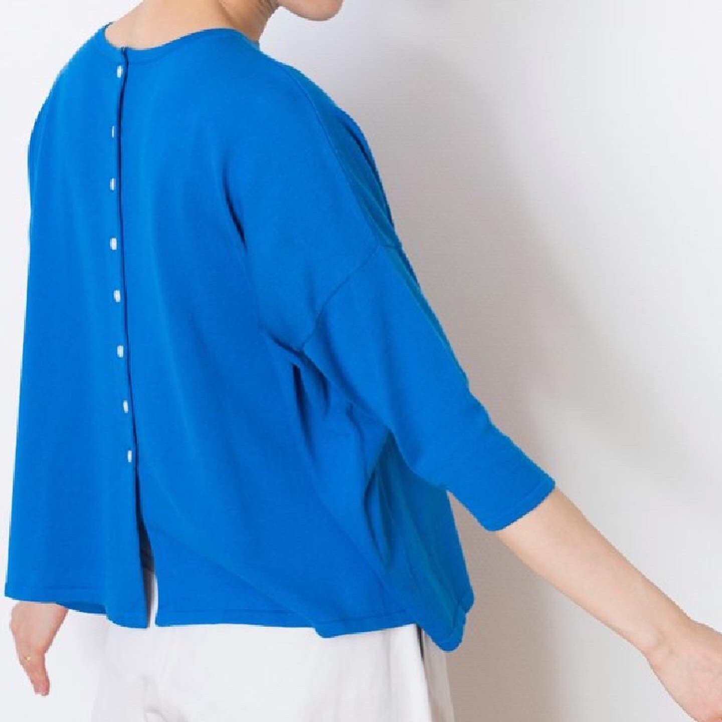 背中側にまわしたボタンを外した着こなしをすると、またぐっと新鮮な表情に。 後ろ身頃にさりげないテントラインがうまれ、バックスタイルも様になります。