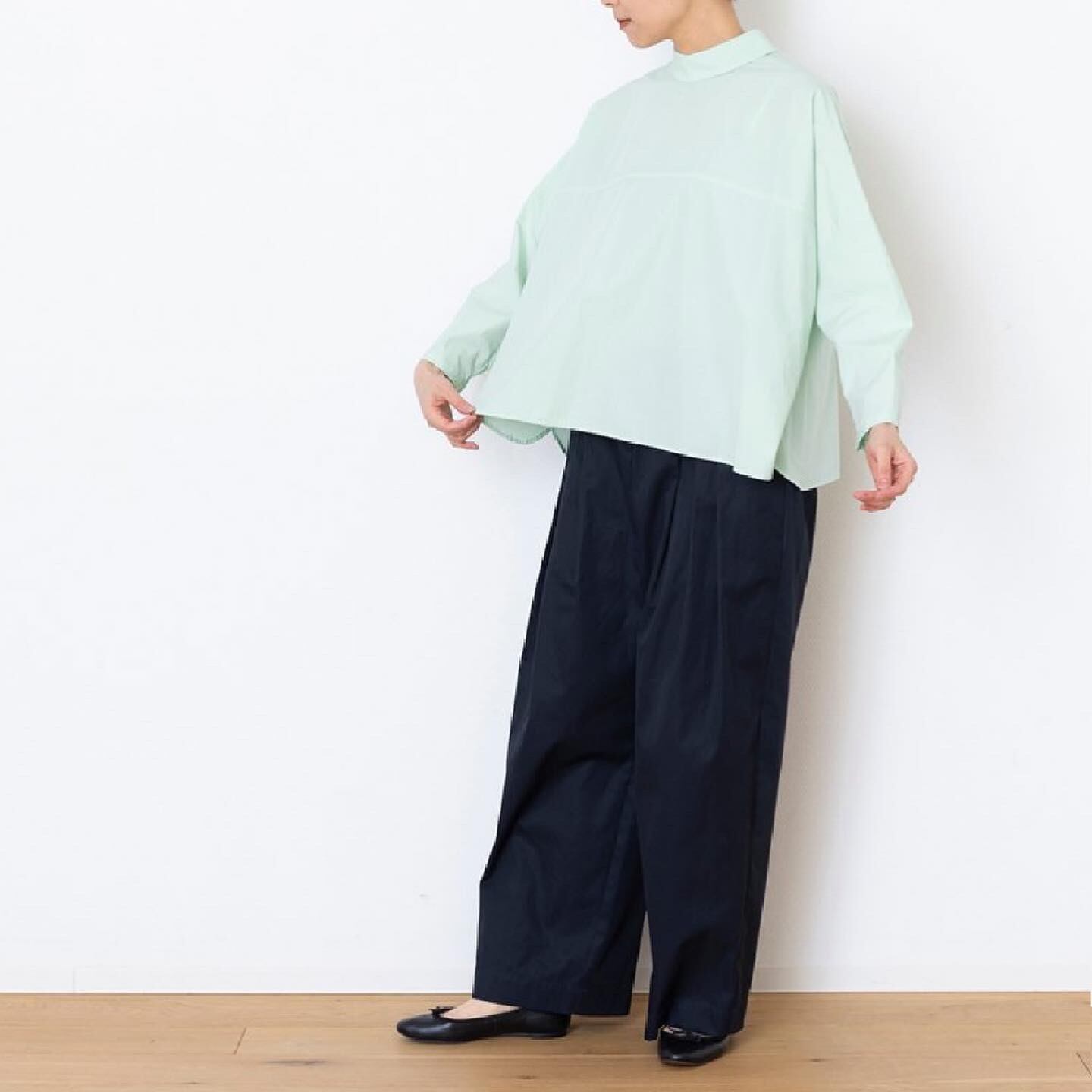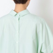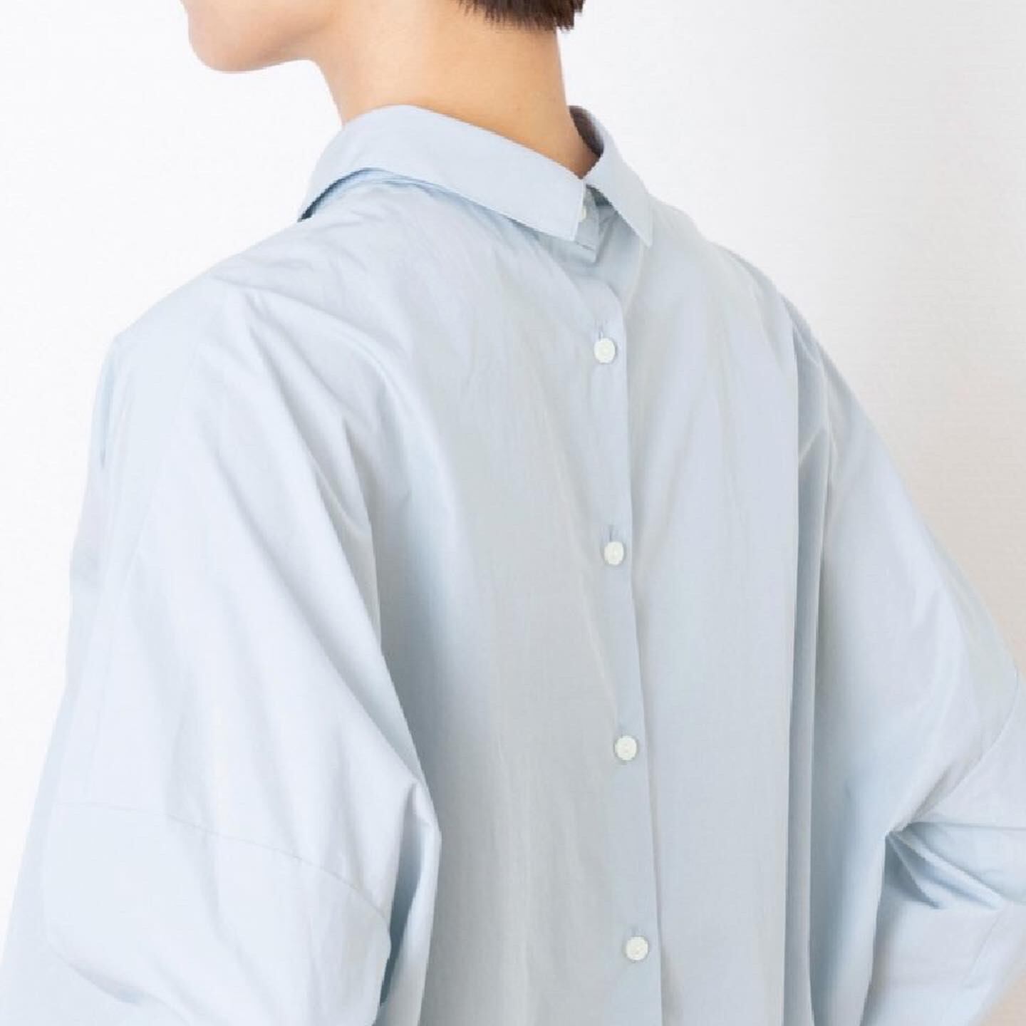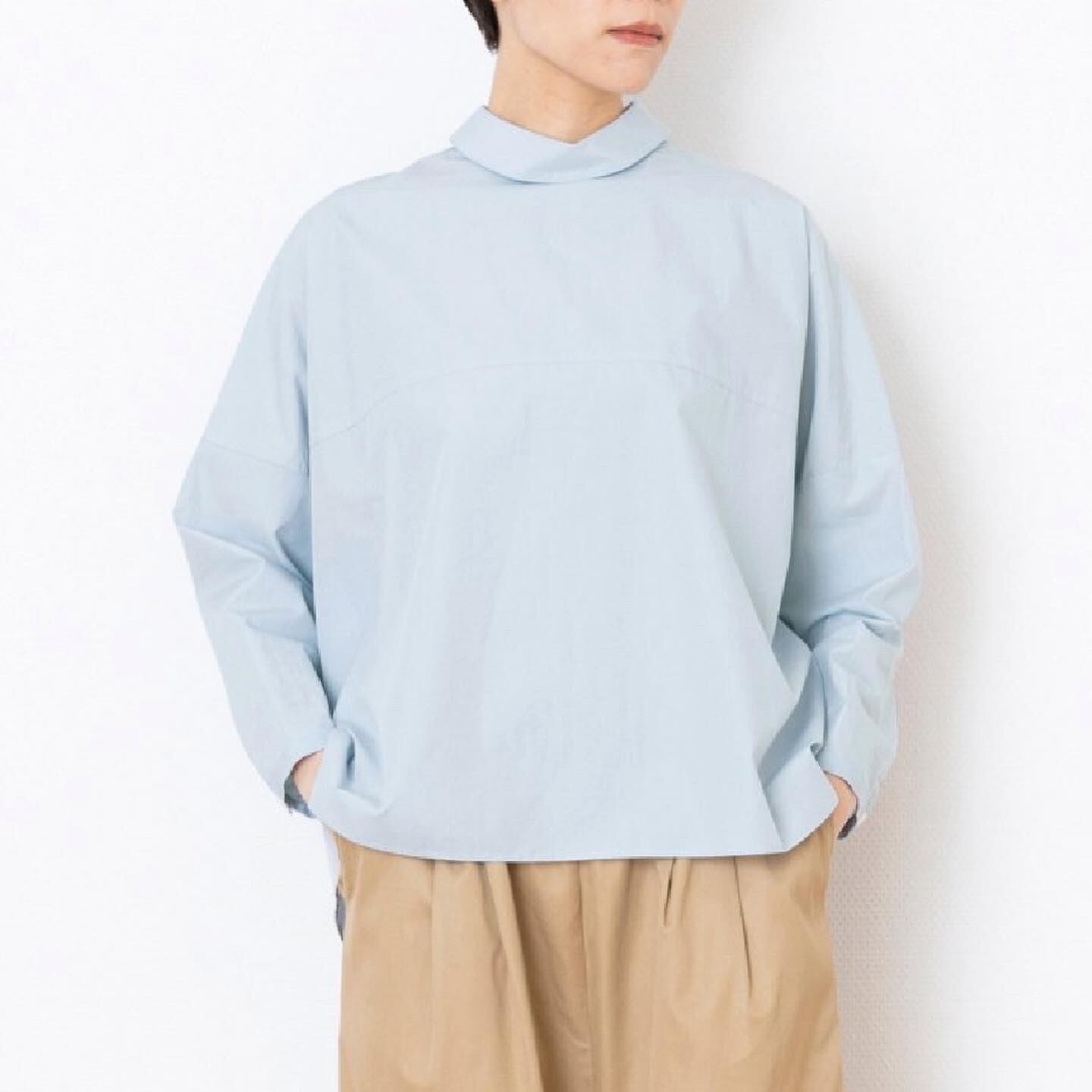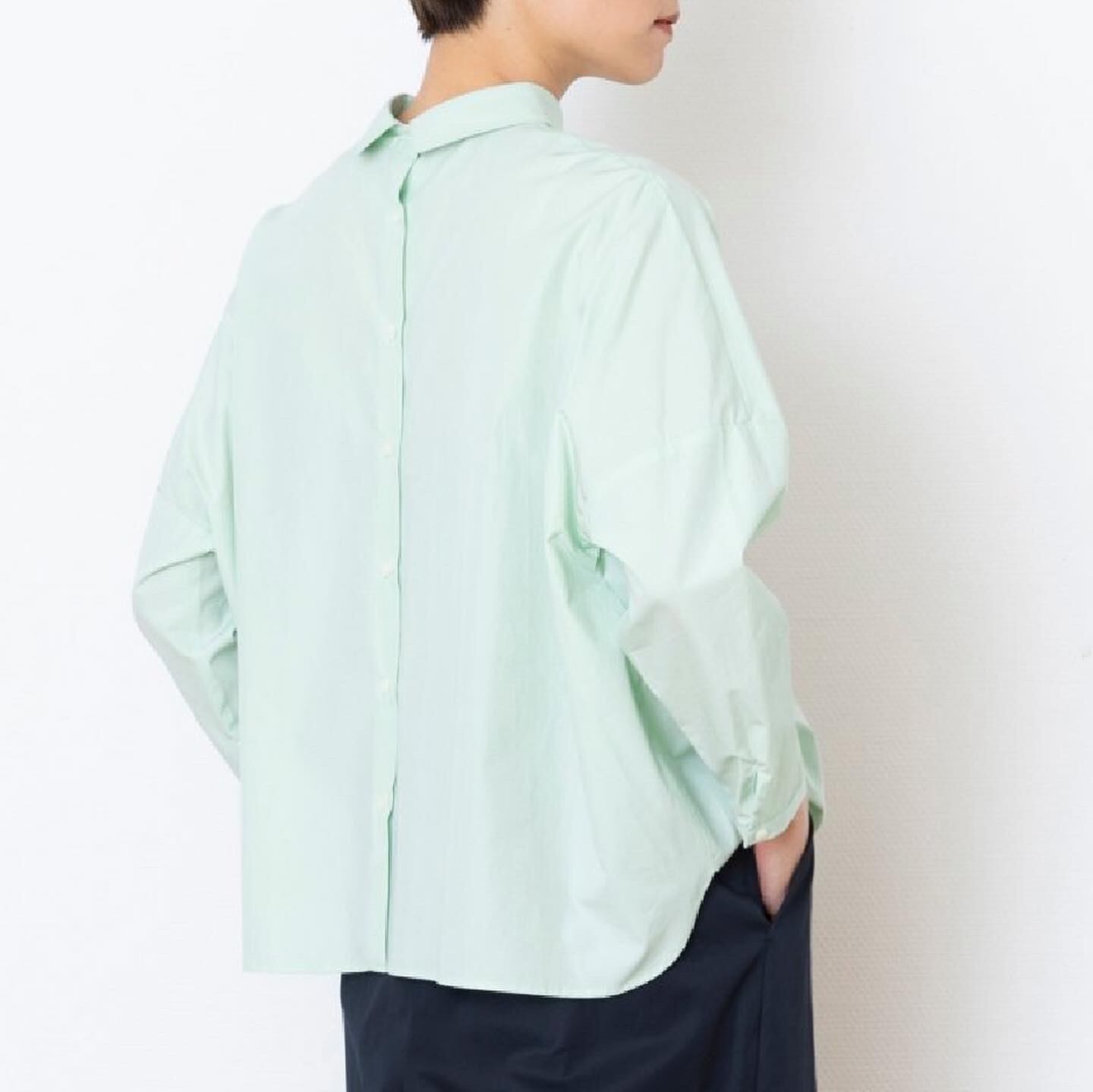 春にぴったりのさわやかなカラーのコットンブラウス。 さらっと1枚で着るのはもちろん、ボタンをあけて羽織りとしても、ボタンをすべて留めて背中側にまわせばハイネックシャツに早変わり。 前後どちらでも着られる2way仕様で、着方によってがらっと雰囲気の変わる1着です。