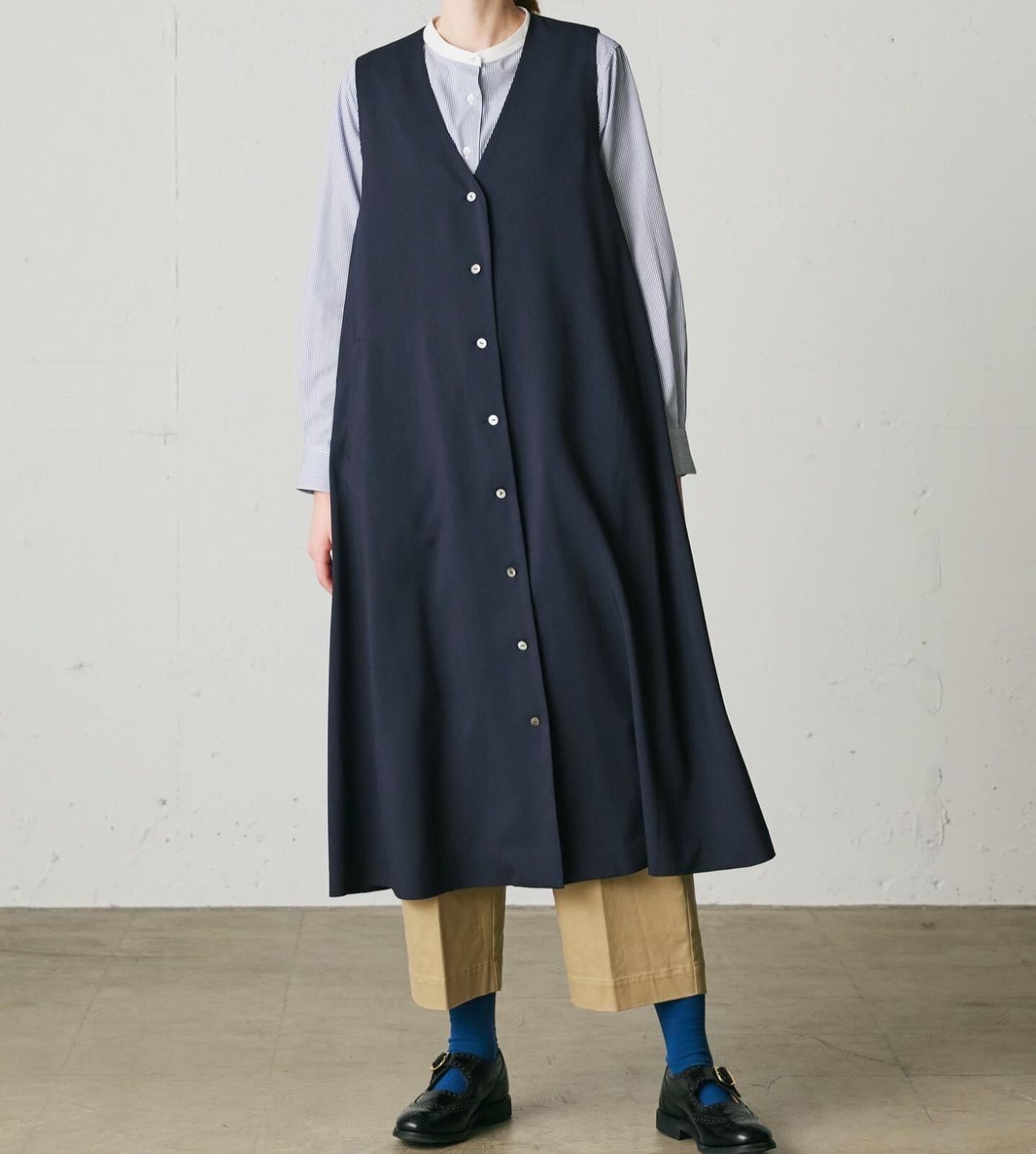 清涼感のある梳毛ライクなサスティナブル素材を使用したVネックロングジレワンピースです。縦糸に再生ポリエステル糸を使用。軽く、シワになりにくい素材です。フレアシルエットのキレイ目な着こなしを演出。ジャンパースカート、ロングベストとしても着用できるお勧めの1枚です。