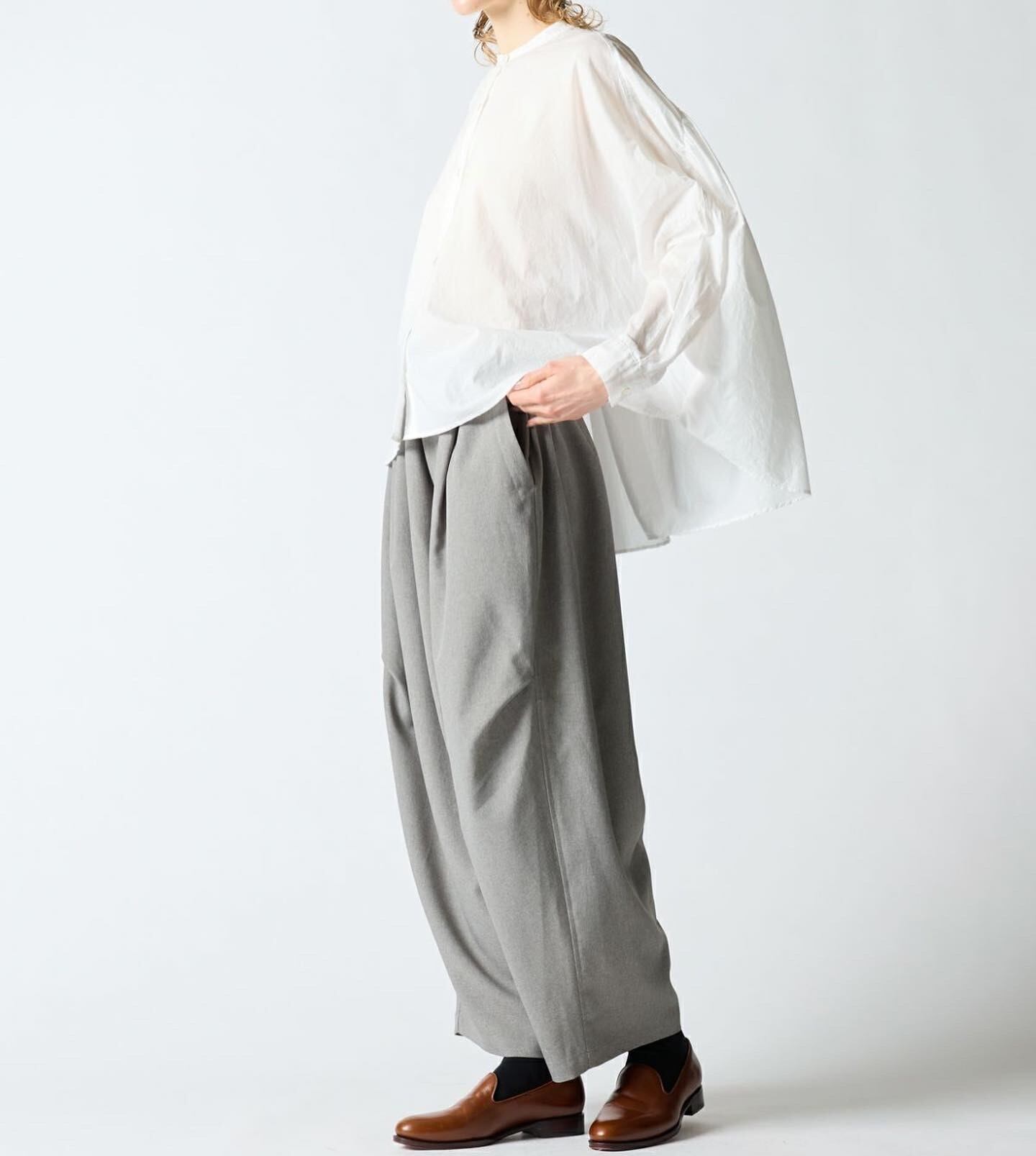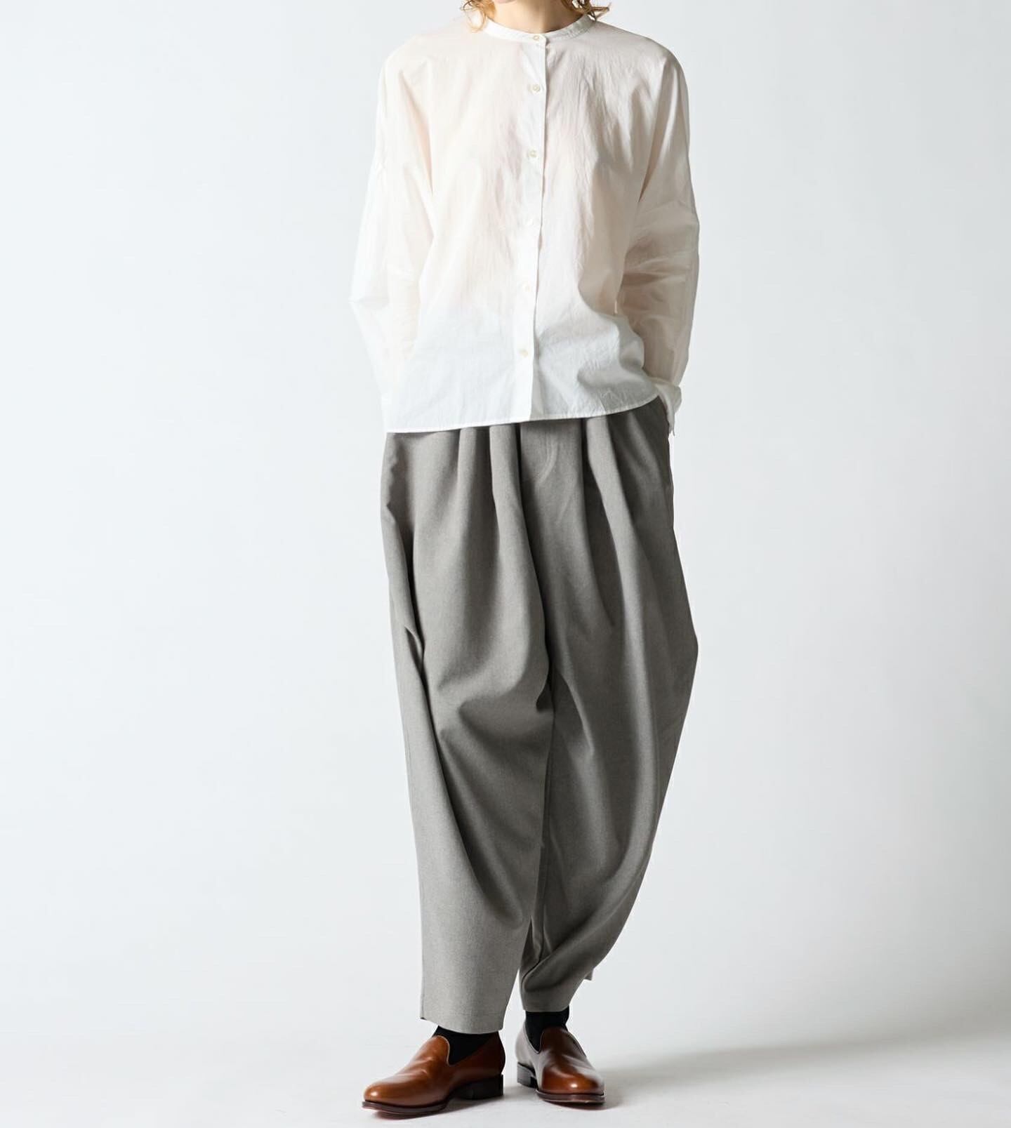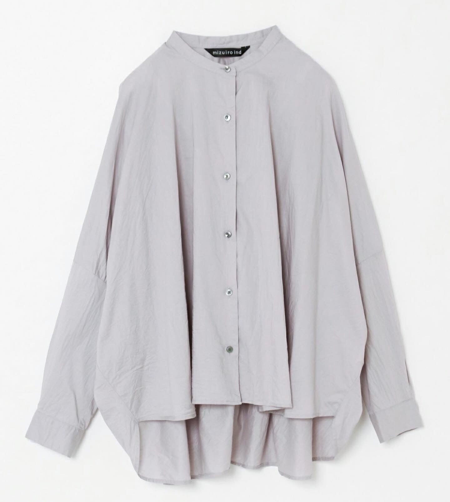 mizuiro ind人気のバックギャザーワイドシャツがこの秋も登場。ブラウン・ライトグレー・グレイジュの3色の新色を追加したバリエーションで更に新鮮さが増した魅力的な1枚となっています。柔らかでナチュラルなコットンは軽さと透明感のある素材の為透け感がございます。フロントはスタンドカラーですっきりとしたシンプルなスタイル。バックは肩から施したギャザーでふんわりとした女性らしいシルエットがしなやかに揺れる魅力あるシャツです。シーズンを通して長く愛用できるのもポイント。羽織としてコーディネートしても素敵です。mizuiro indのお勧めシャツです。