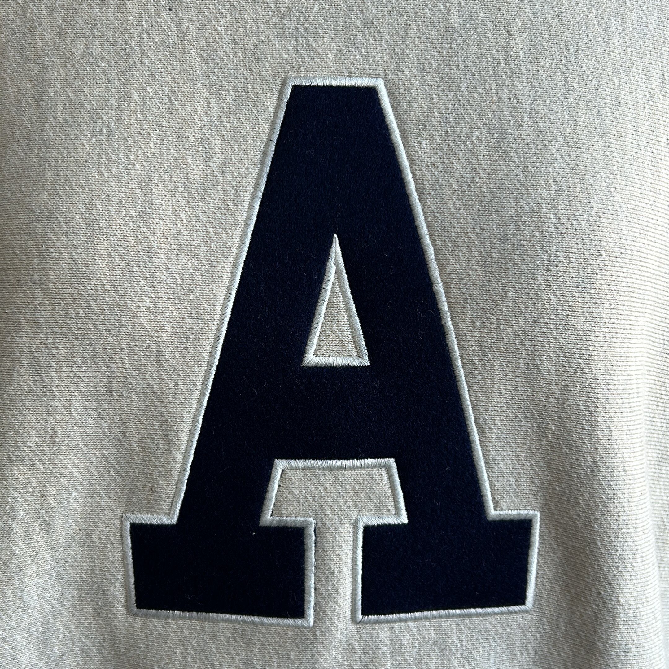 フロントに配した “A” ロゴのフェルトワッペンが目を惹くクルーネックスウェット。