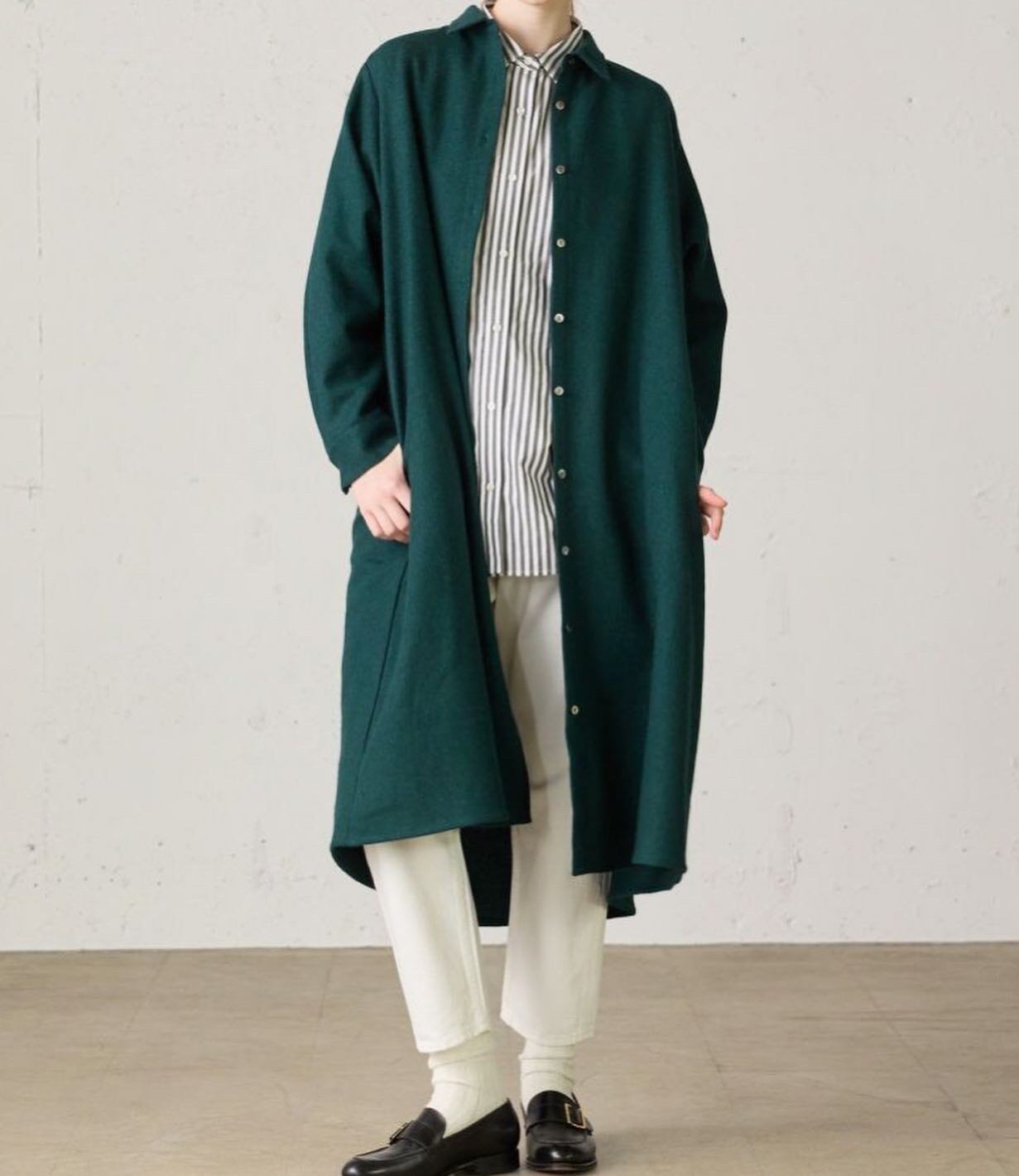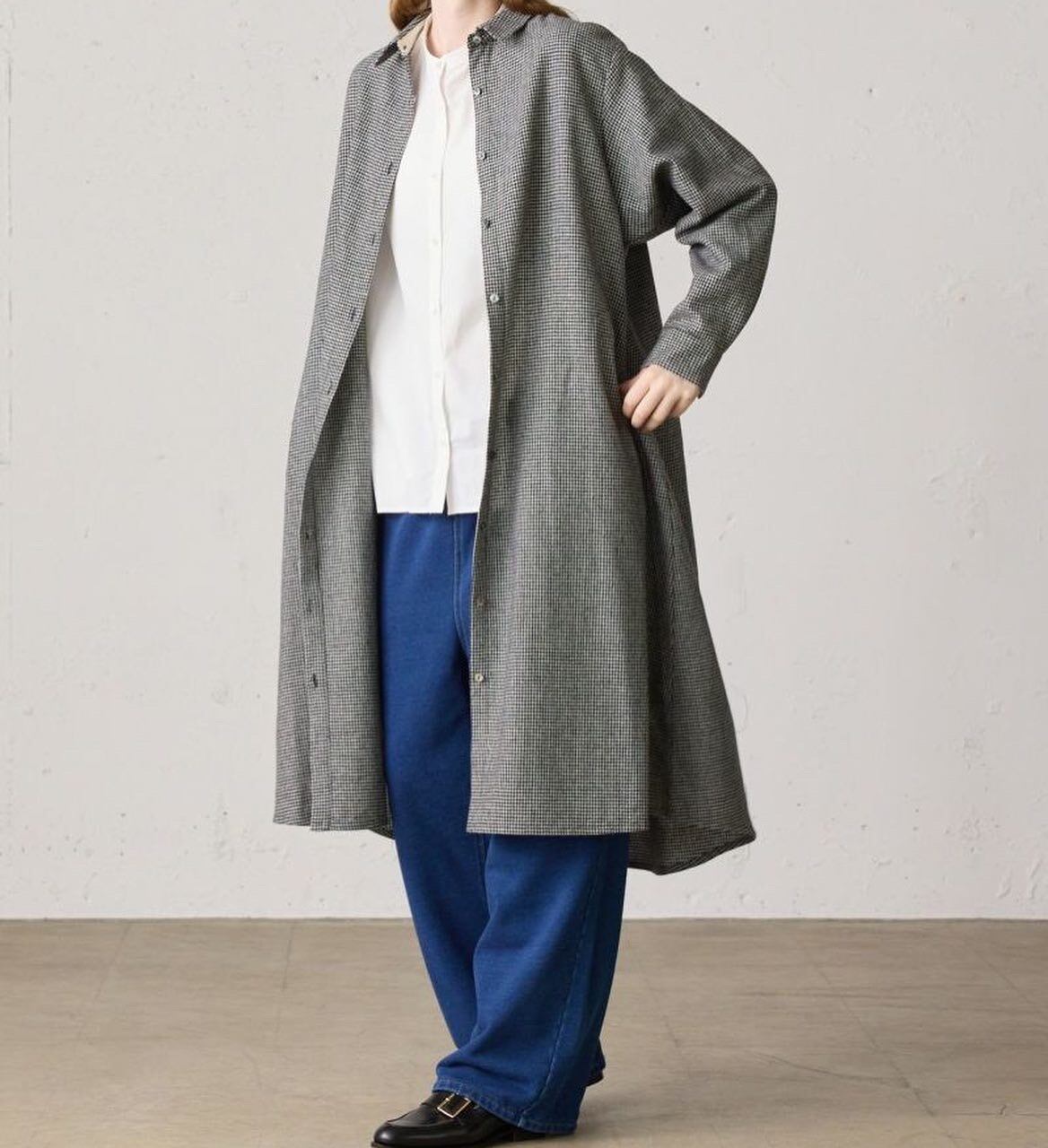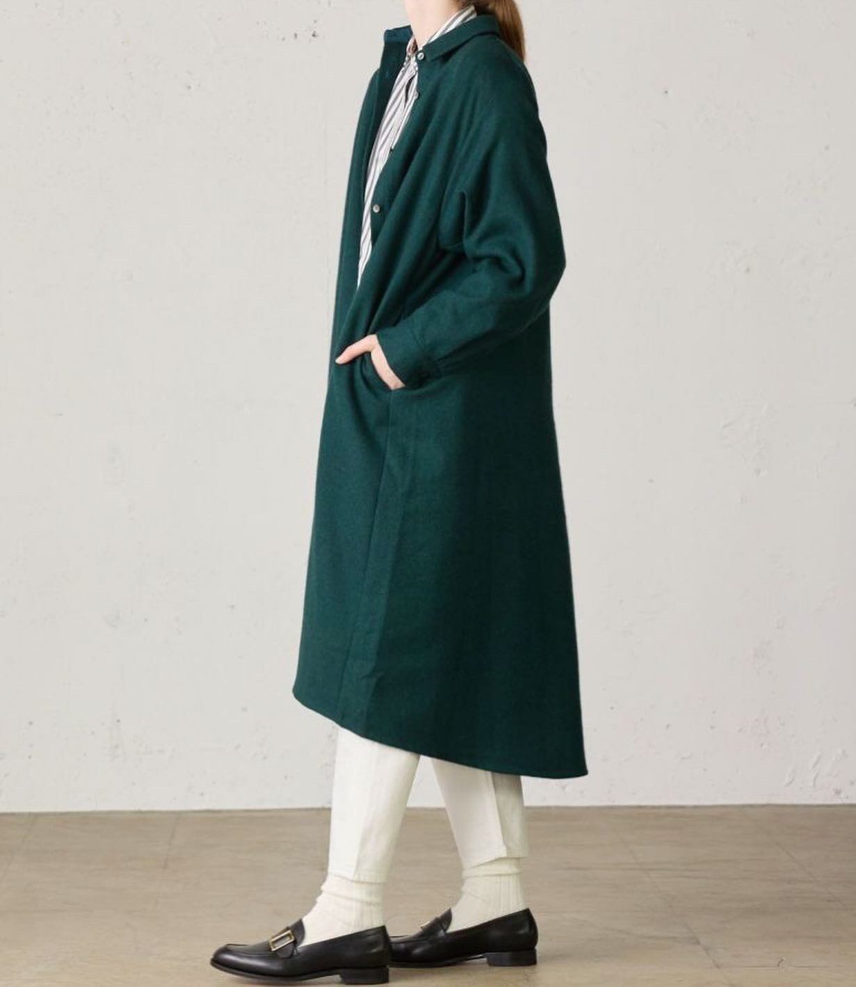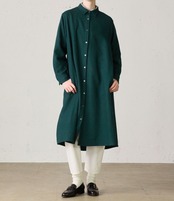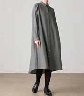 MidiUmiの人気商品でもあるリサイクルウールを使用したコートワンピースです。程よい厚みが特徴のフラノ素材で、再生する生地の色が混ざり合いながら糸として生まれ変わるため、深みのある色味や様々な長さの繊維が混ざり合うことで生まれる表情が魅力の生地を使用しております。1枚仕立てになっておりますので、軽さを体感していただけます。カフスボタン2つ付きなので調節によってボリューム感も変えていただけます。首元、カフスは裏に綿スレキが付いているため、チクチクしにくい仕様になっております。コートとしてもワンピースとしても着用していただける1枚です。