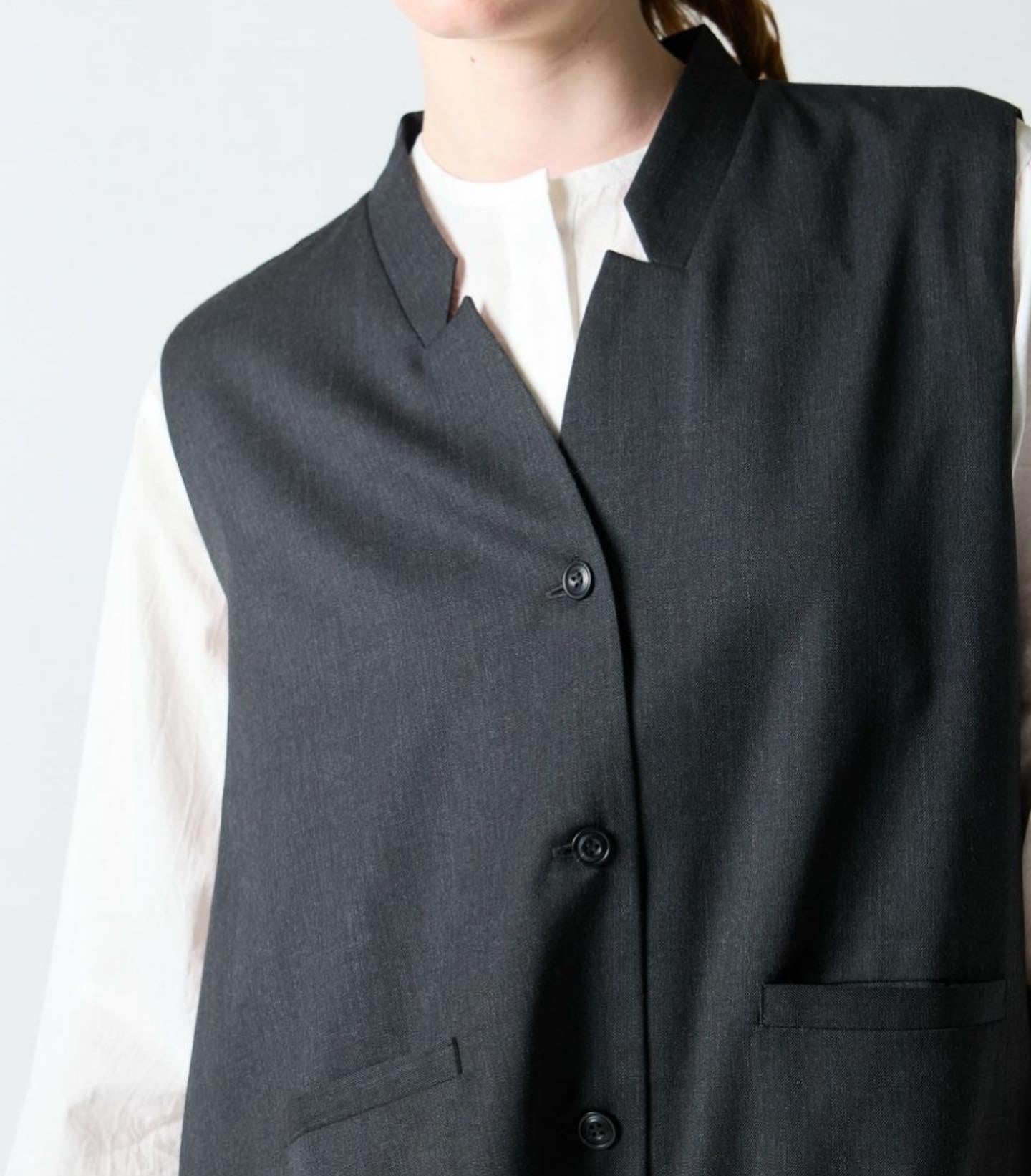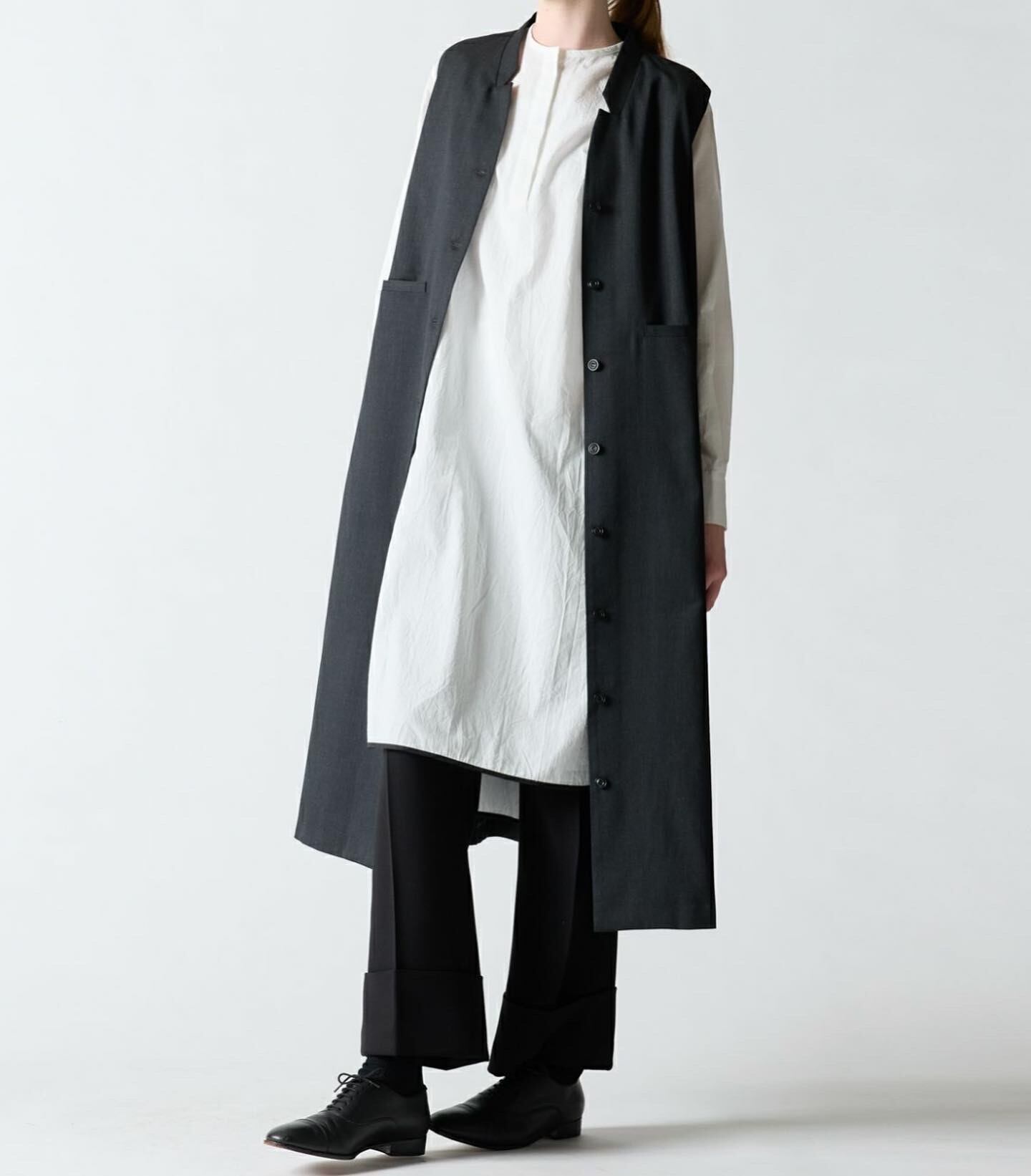 mizuiro indをイメージ付ける人気のスタンドカラーフレアジレワンピースです。フロントボタンのシックなデザインで、ロングワンピースとしてもロングベストとしても着こなせる1枚。小さ目襟のテーラードを変形させ裾にかけ上品に広がるシルエットが魅力的。シャツワンピースやパンツを合わせたコーディネートでレイヤードを楽しむことのできる幅広い着こなしを表現します。ウール混なので暖かく、アウターも羽織りやすいこの冬お勧めのワンピースです。