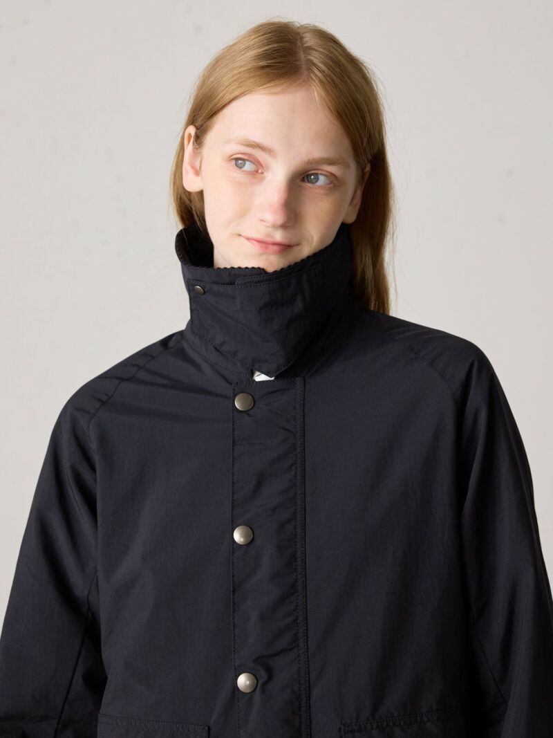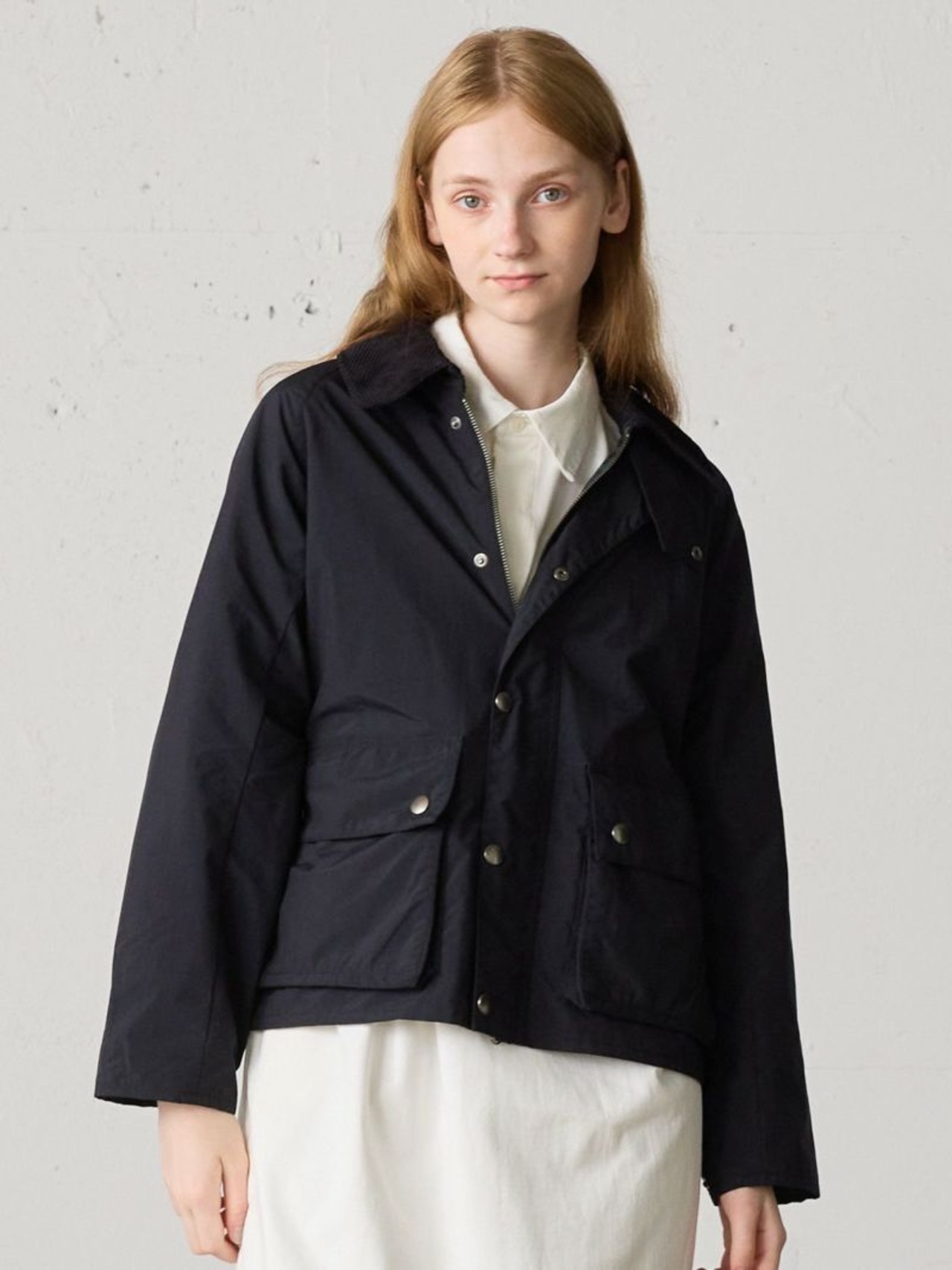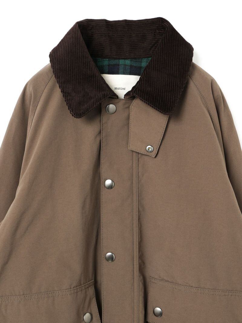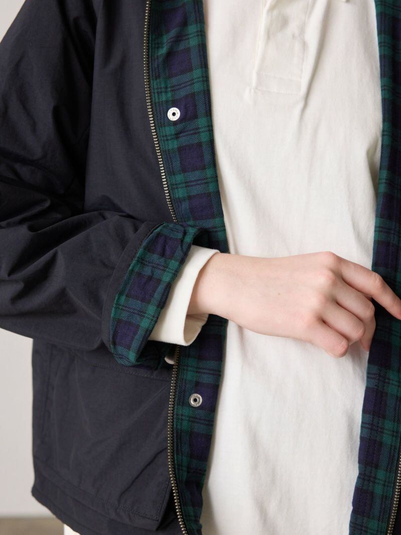MidiUmiの人気アウターでもあるハンティングショートジャケットです。撥水性のある軽い素材を使用したコンパクトなシルエットが特徴。裏地は全てブラックウォッチのチェック柄で仕上げたカジュアルなデザイン。フロントジップとスナップボタンを使用。コーデュロイで温かみのある襟元は、襟を立て首までしっかり覆ってくれる仕様。フロントベルトが付いているのでスナップボタンでしっかりと留めていただけるデザインとなってます。袖口の広さもスナップボタンで調整可能。手がすっぽりと入る大きなポケットもポイント。クラシックな大人のジャケットで落ち着きのある着こなしを演出できる1枚です。