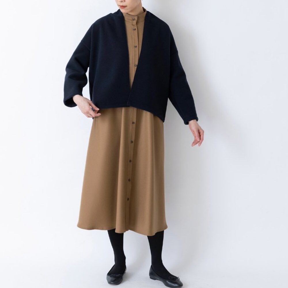 フロントにボタンがなく前立てはストンとまっすぐきれいなラインを作り出します。 やわらかな質感ですがどこかジャケットのようなきちんとした雰囲気です。
