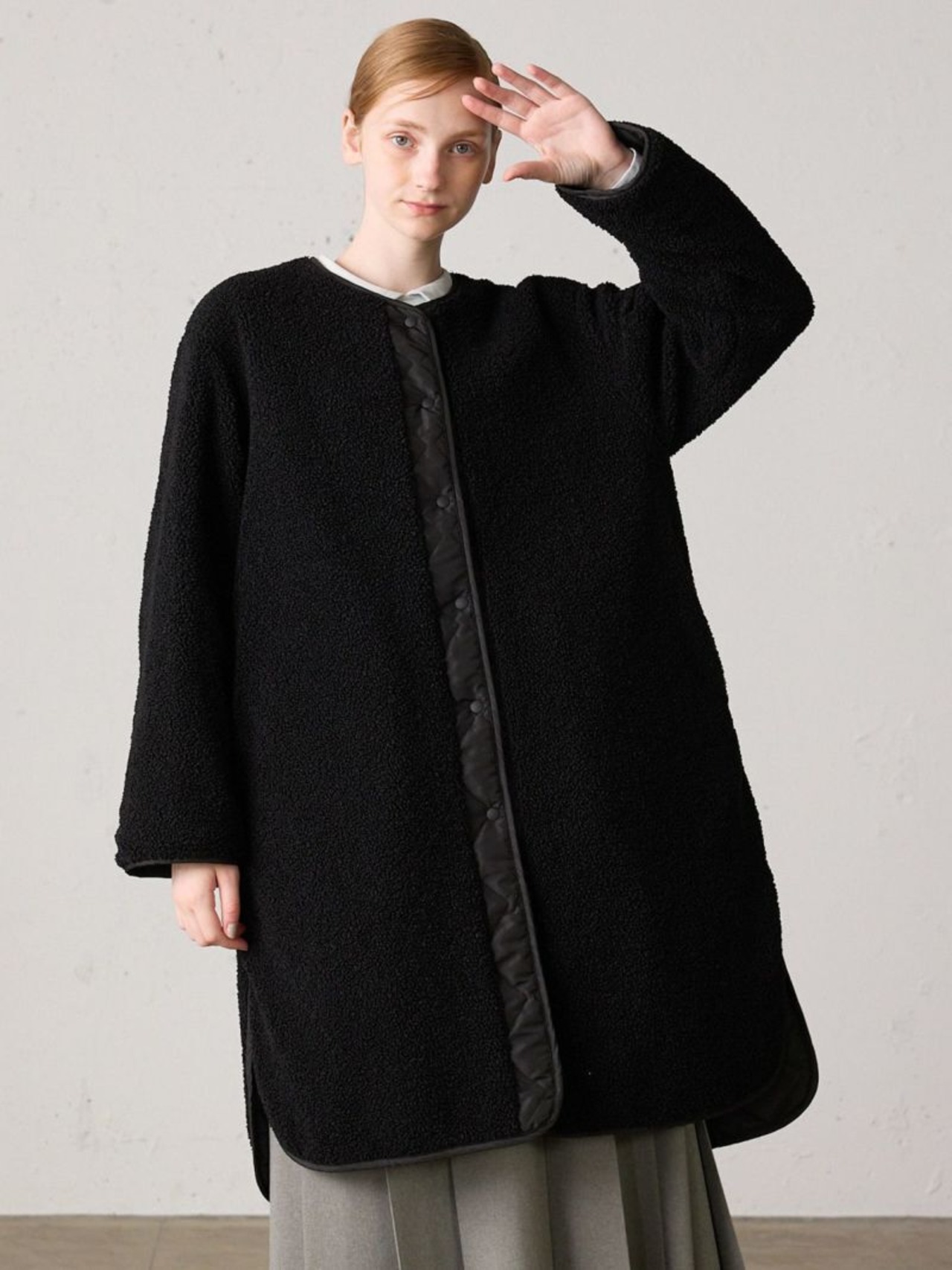 MidiUmiの冬の人気アウターでもあるキルティングリバーシブルコートです。今季は定番型からボックスシルエットにデザイン変更いたしました。どんなコーデにも合わせられる仕上がりになっております。ゆとりのあるサイズ感なので中にも着こめるのもポイント。キルティング側には手がすっぽりと入るポケット付。リバーシブルにすると暖かなボアの生地感が印象的に。雰囲気が変わって素敵にコーディネートを楽しんでいただけるのも魅力です。