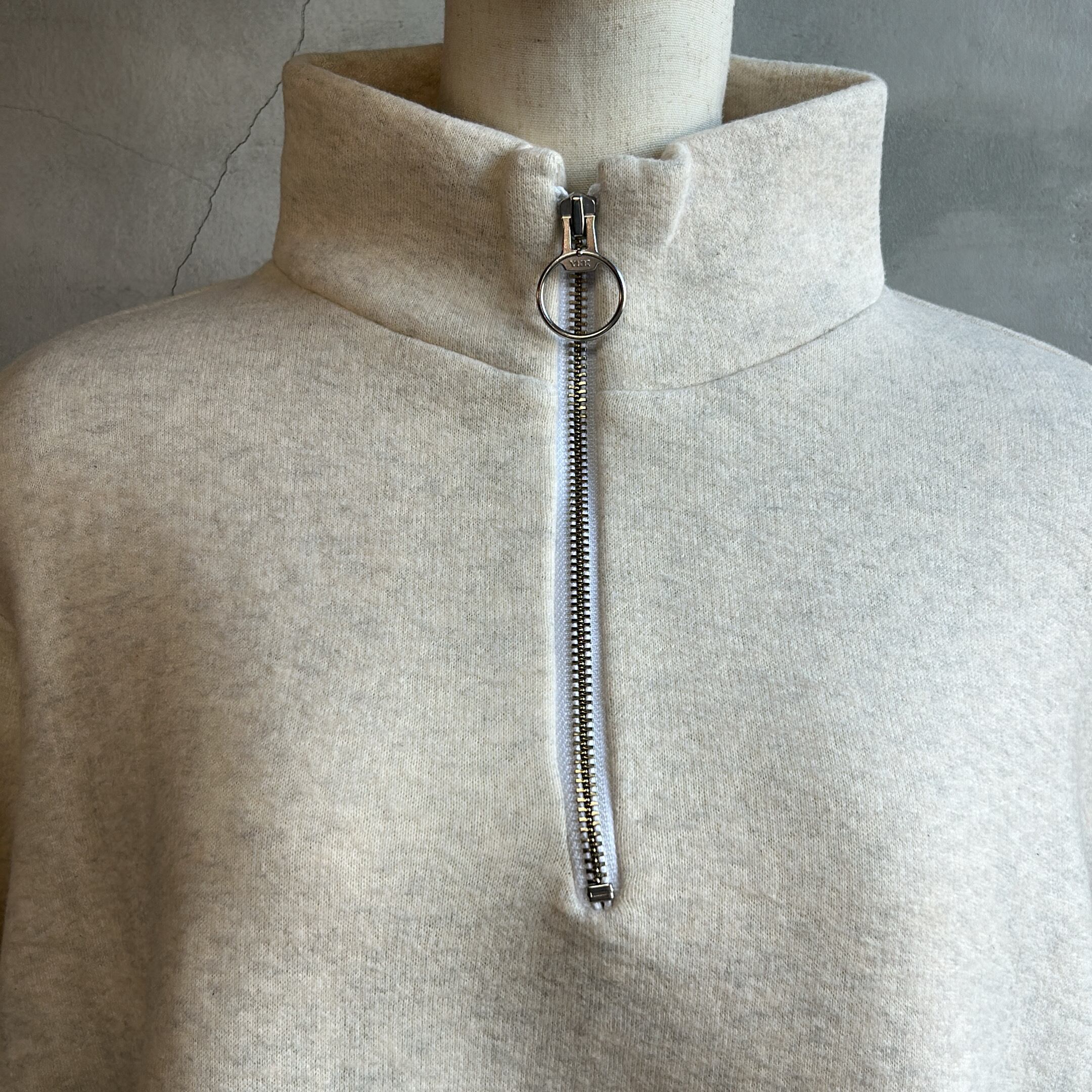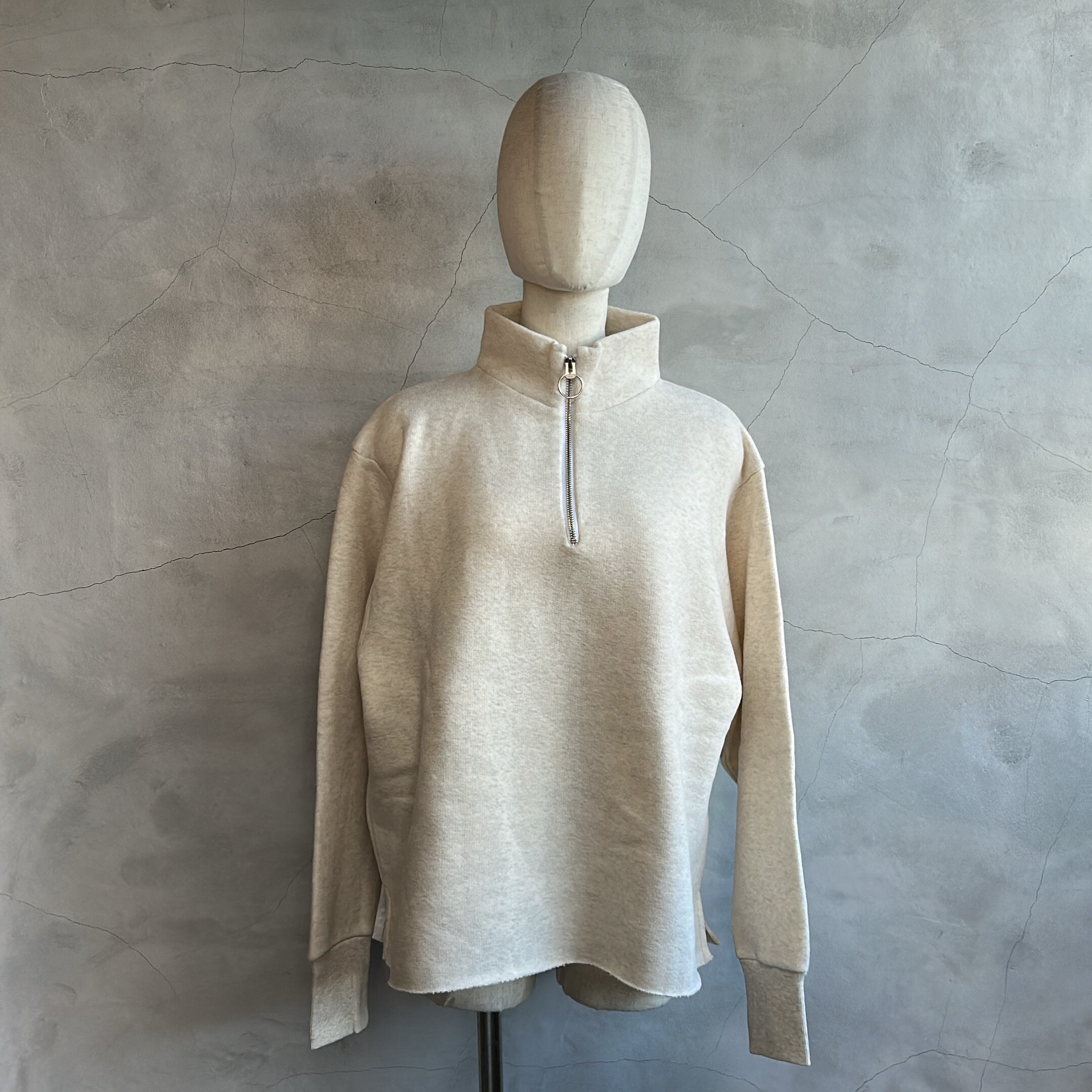 ジップを閉めてハイネックのスウェットとしても、開けて襟としても着用できます。
