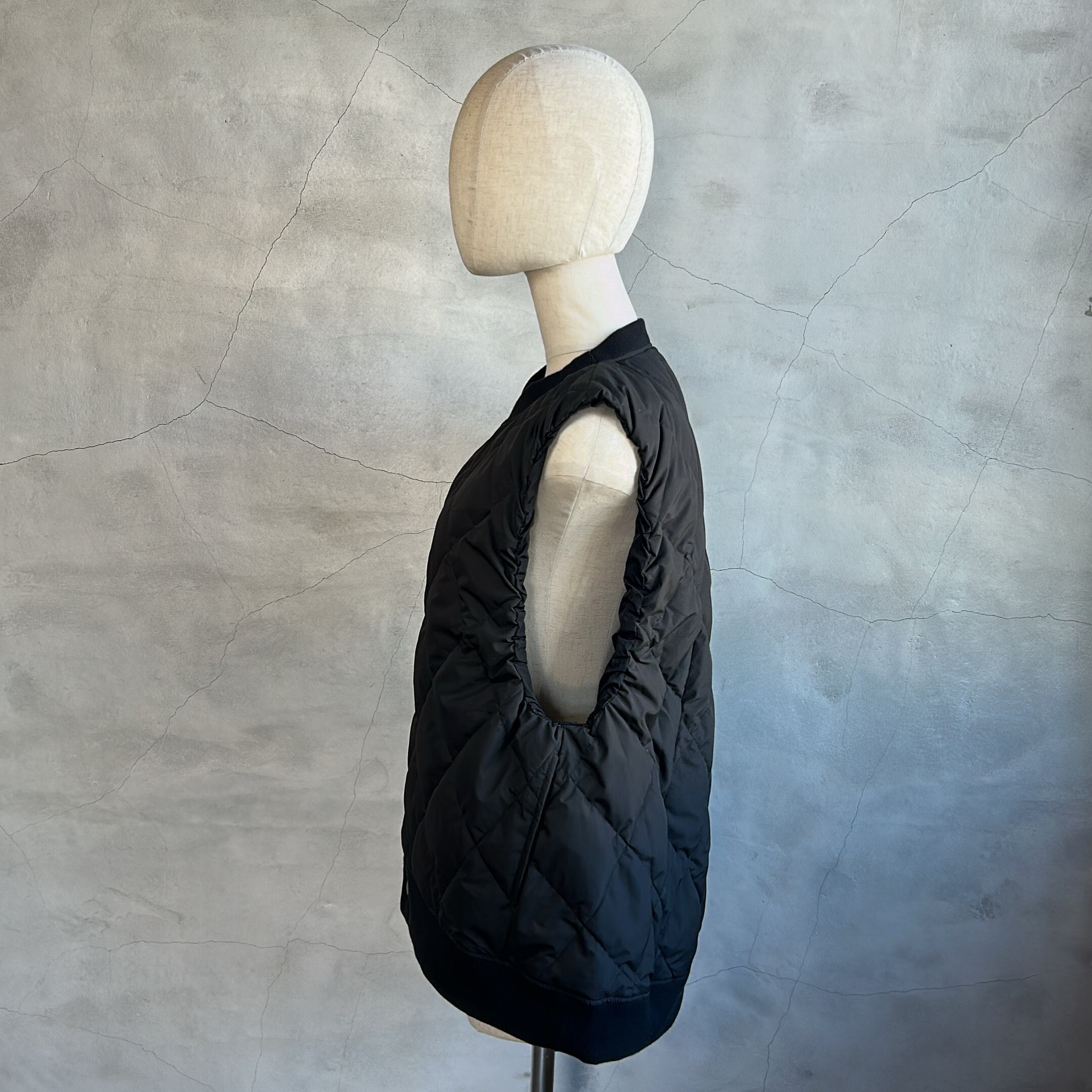 襟、裾のリブがアクセントになっていて、カッコかわいいダウンベストです。アームホールがゆったりしているので、ニットやカットソーの上からでもストレスなく着用できます。