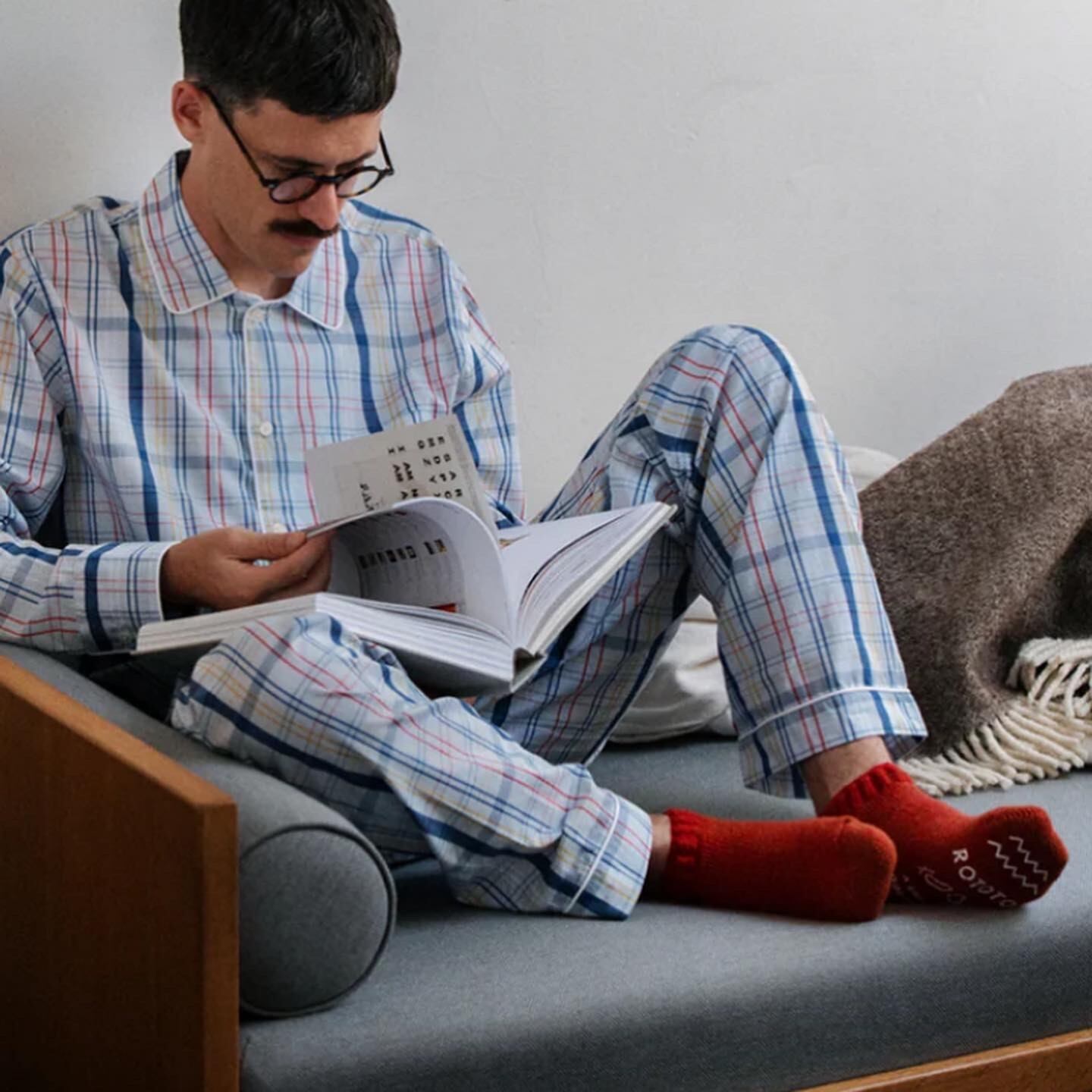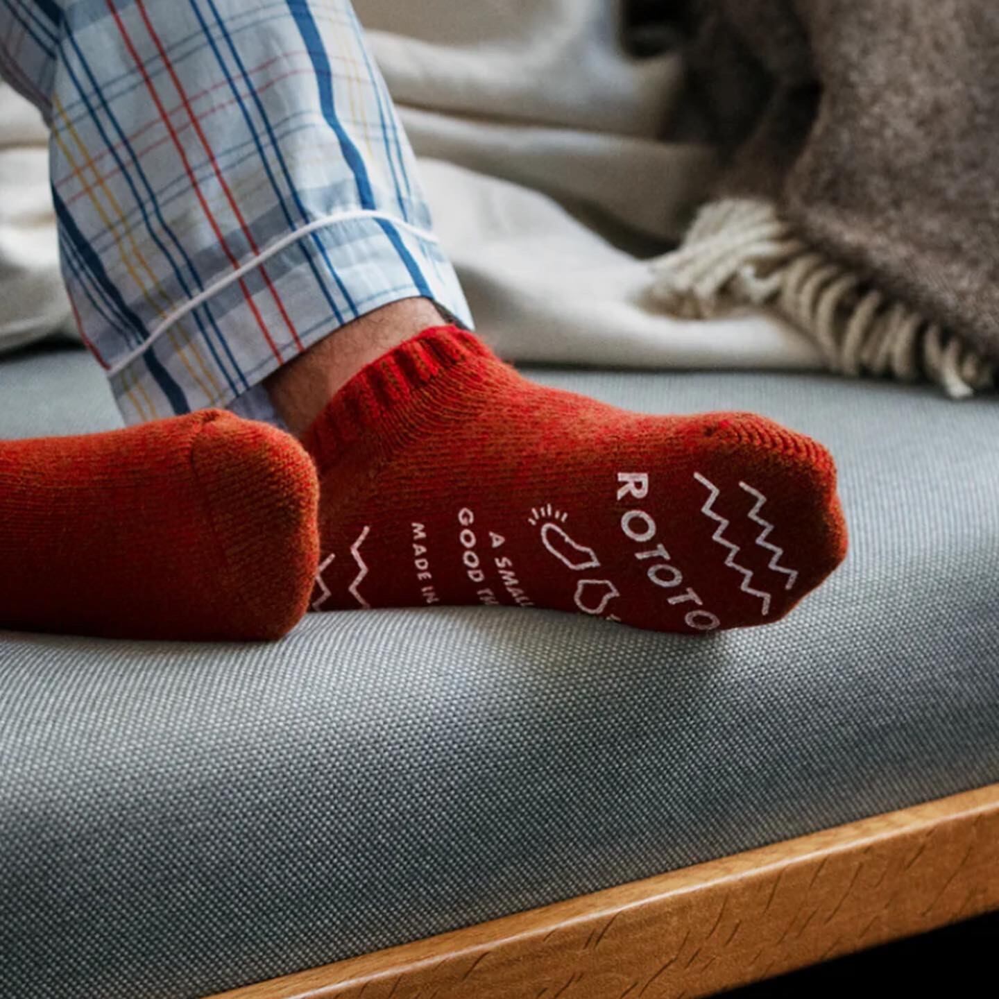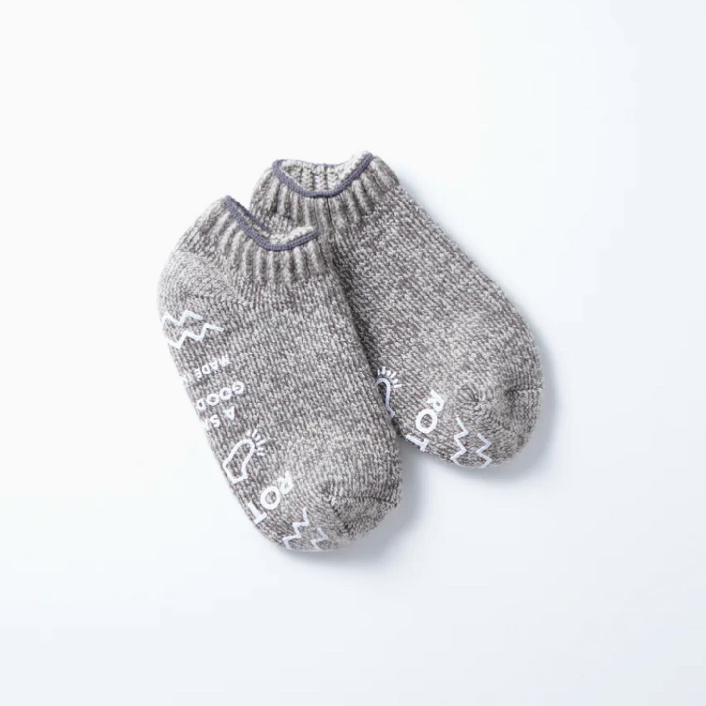 スリッパに替わる新しい履き物として考案されたソックスリッパ。今シーズンから2色の糸をミックスした杢カラーへアップデート。汚れや毛玉などがより目立ちにくい生地となりました。糸は保温性とやさしい肌あたりが特徴のアクリルとウールの混紡糸を使用。内側を肉厚のパイル編みにすることで、絨毯のようなふかふかした履き心地に。素足のままの着用はもちろん、ソックスの上からオーバーソックスとして着用することも可能です。足底のプリントは滑り止めグリップ仕様となっています。