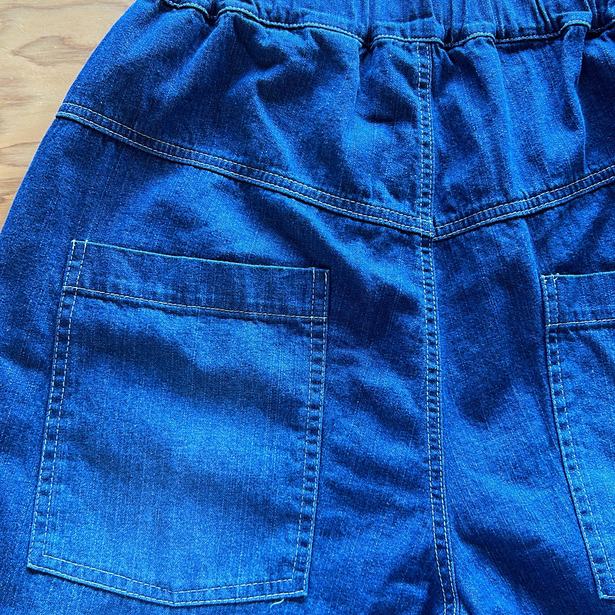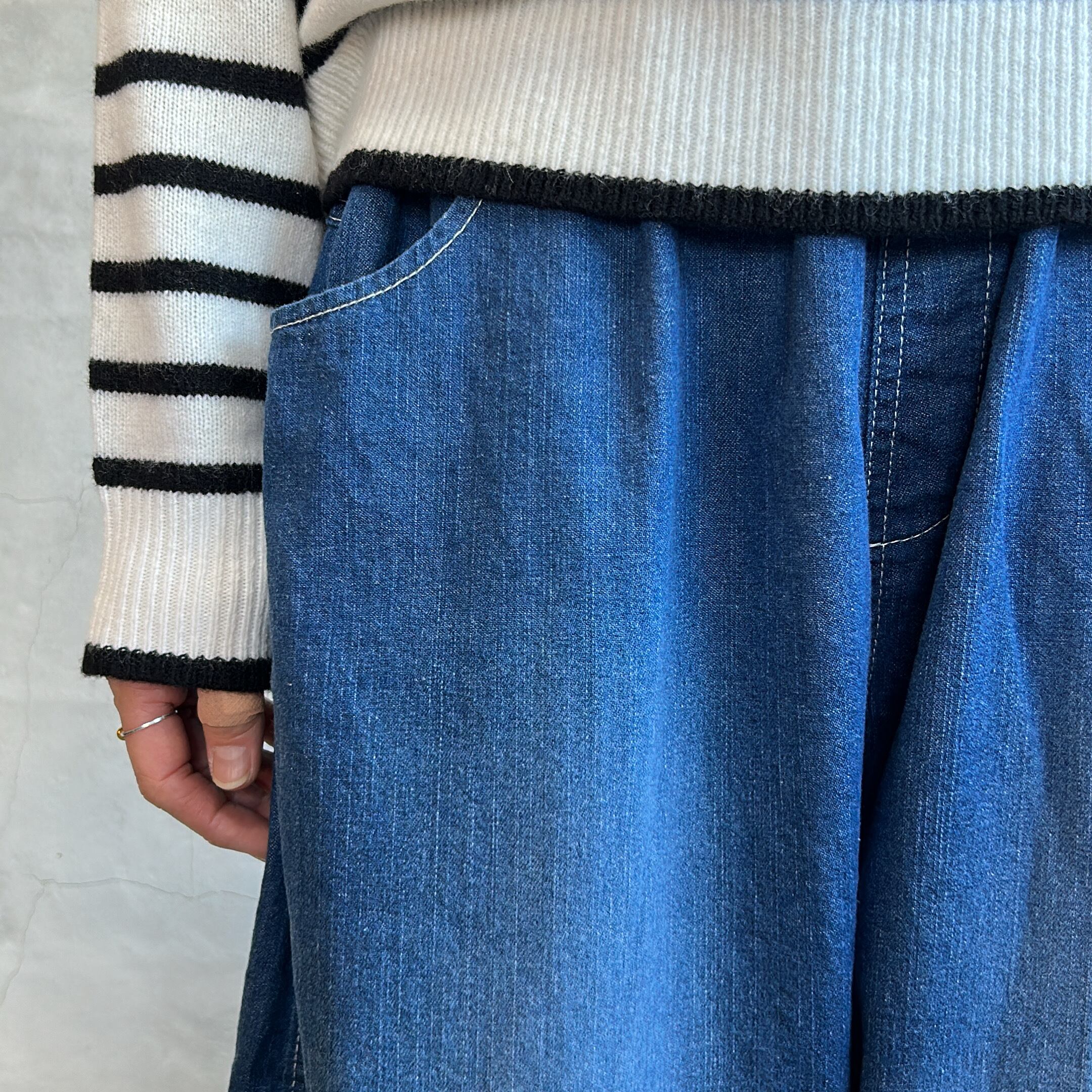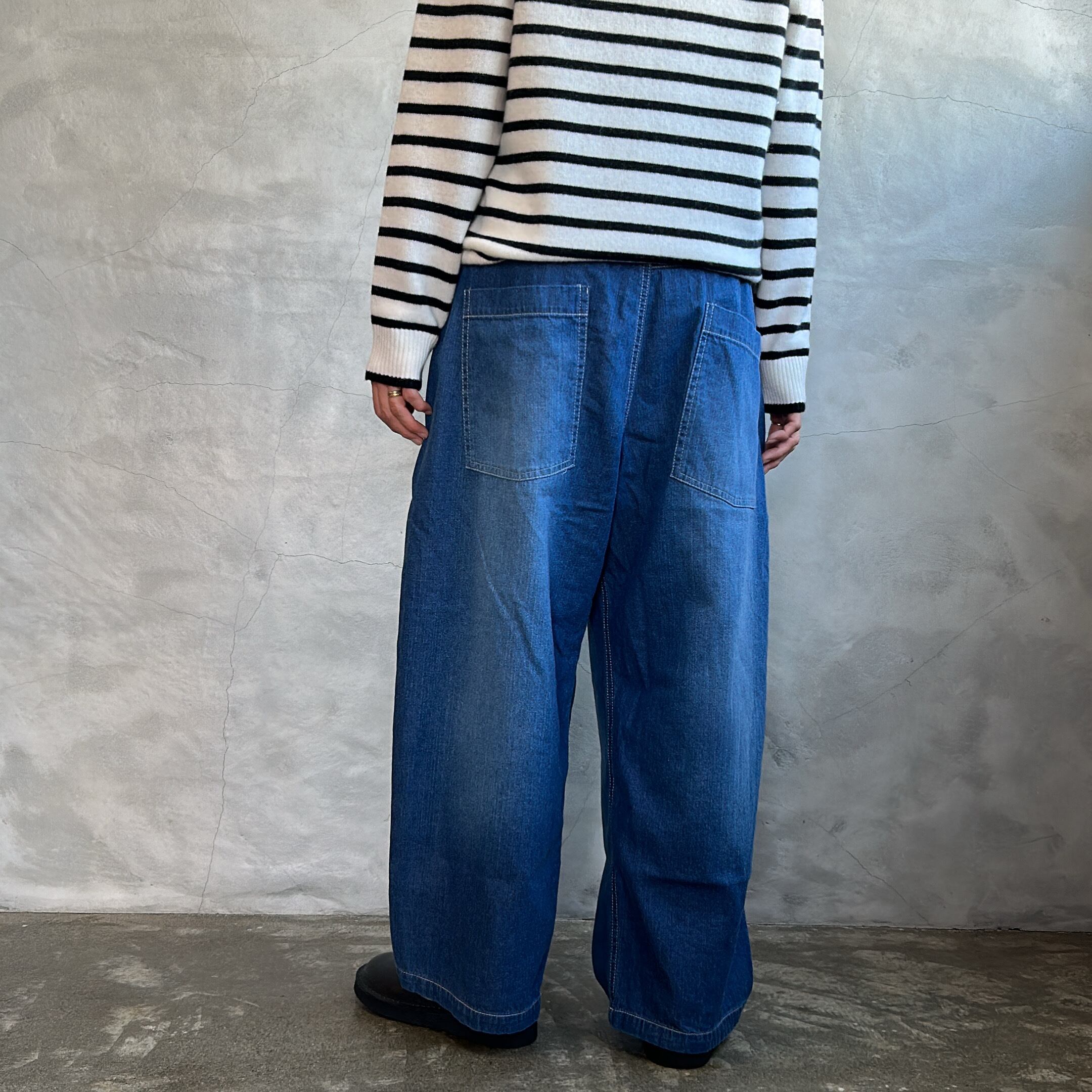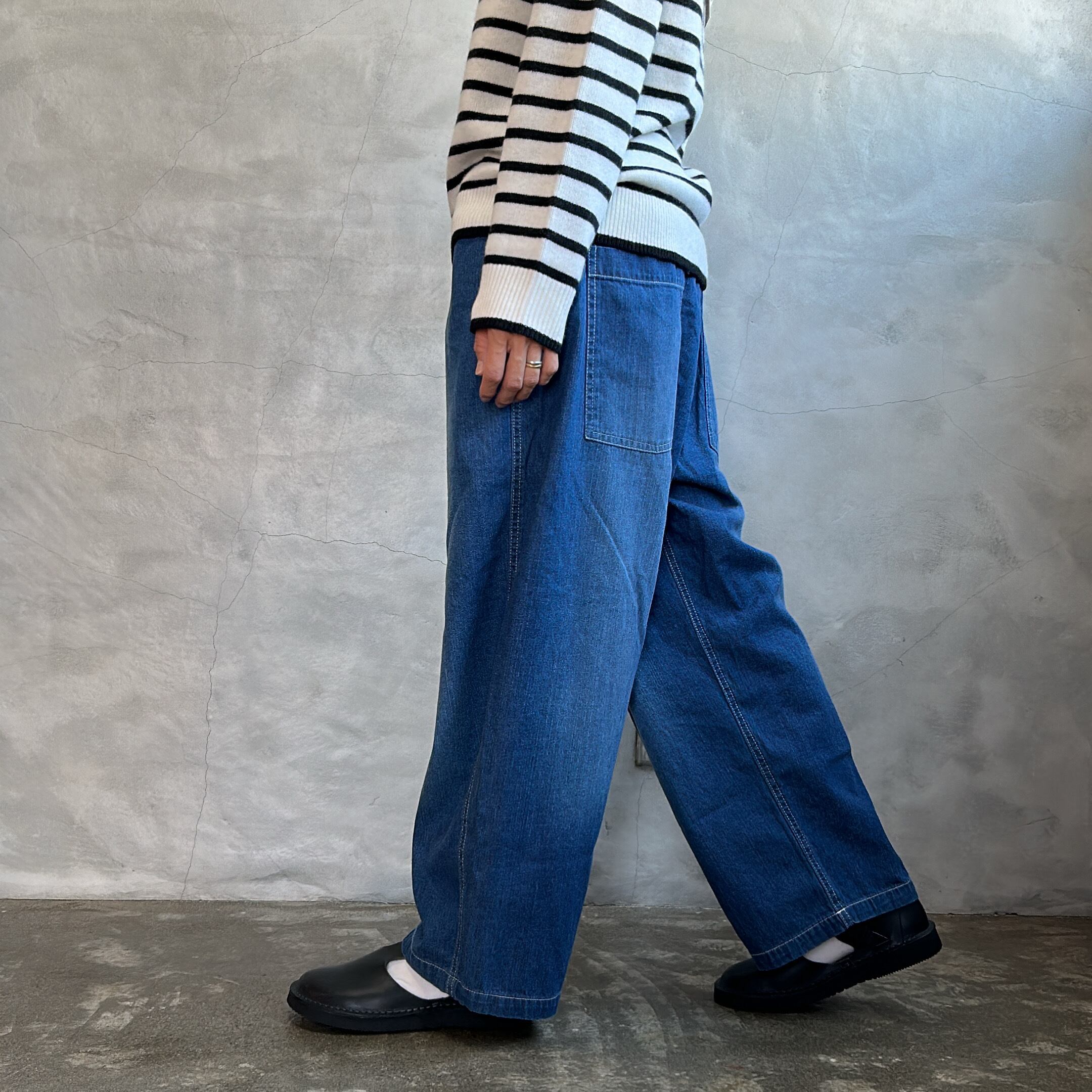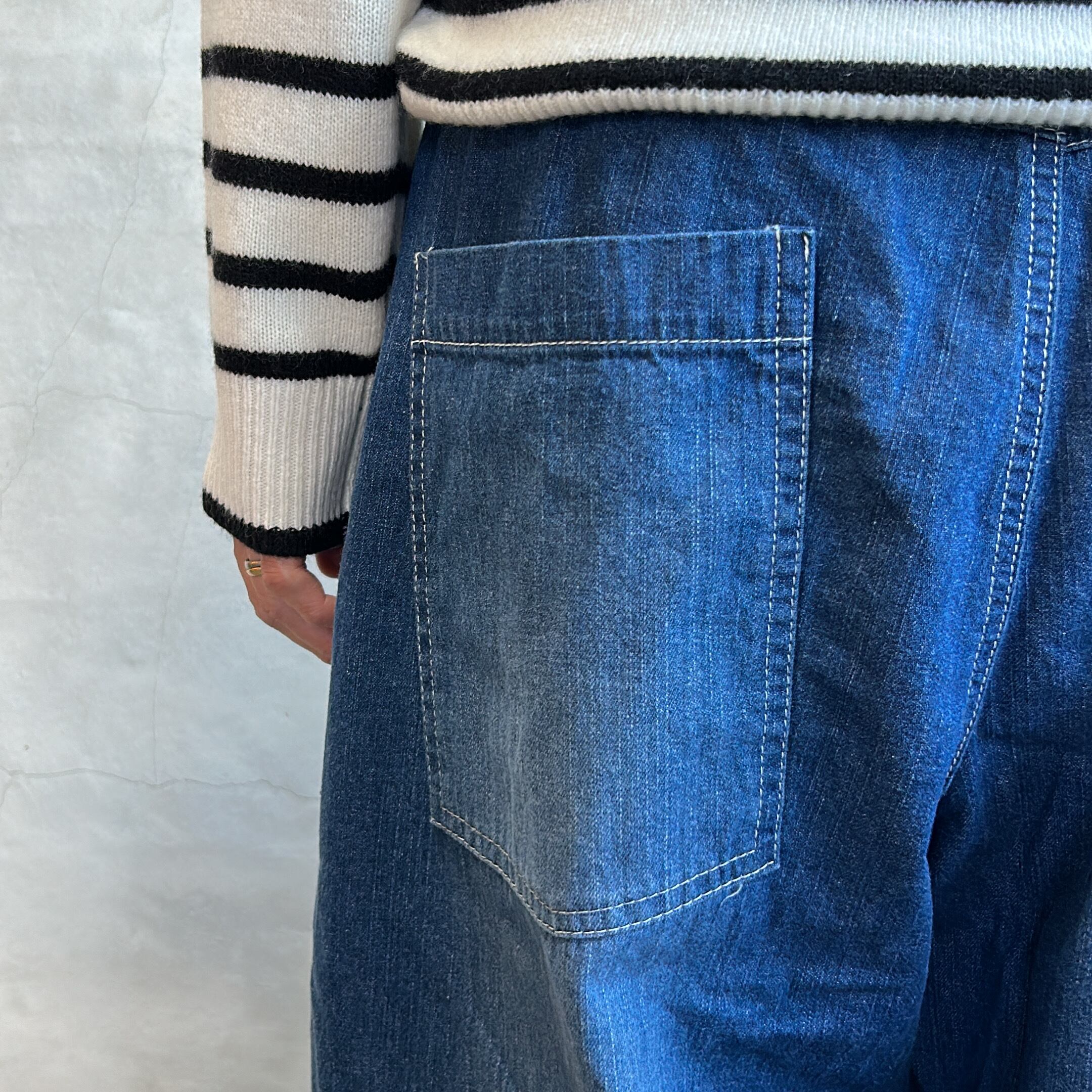 気になる部分をさりげなく隠して、おしゃれに決まるストレートシルエット。色違いの糸で、たくさん飾りステッチを施したNARUの本格デニムパンツです。もちろんウエストゴムで楽に履いていただけます。