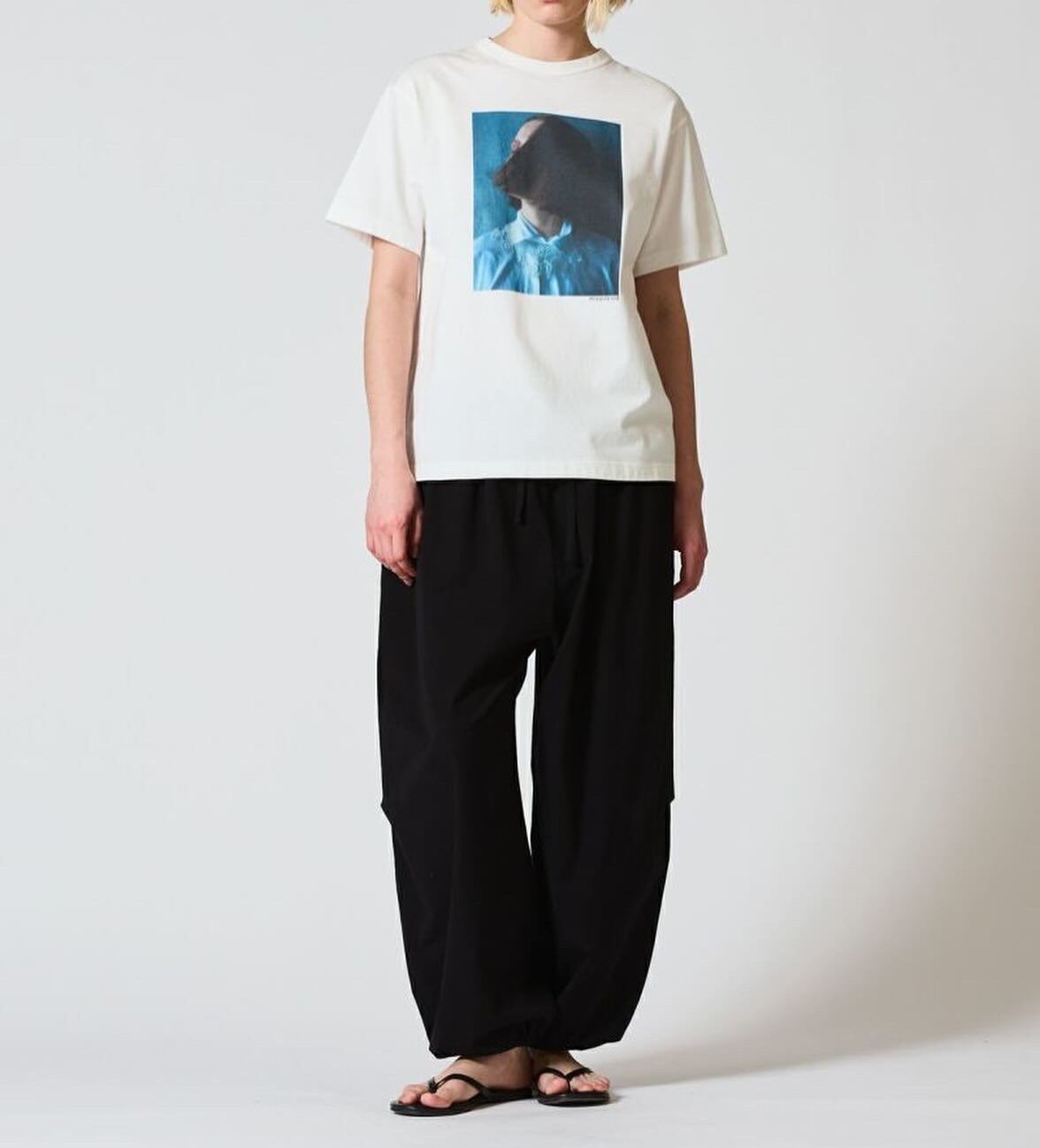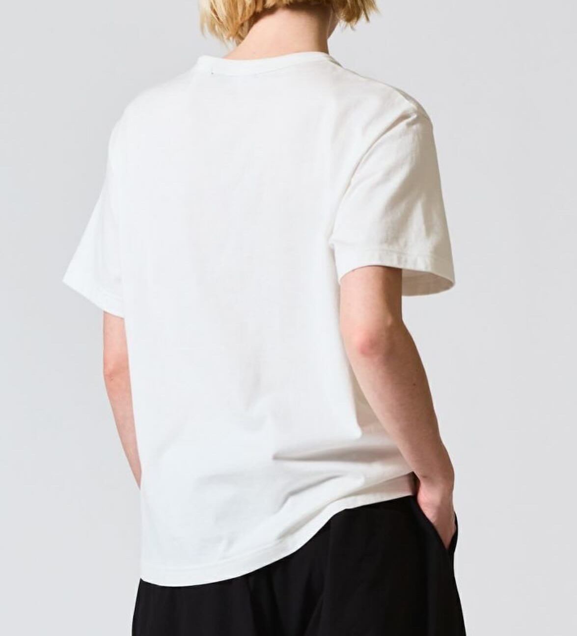 mizuiro indの着こなしを軽快に楽しんでいただけるプリントTシャツ。爽やかな白地にシックな3色のロゴカラーをプリントしたカジュアルアイテムです。ベーシックなクルーネックに程よいゆとりのあるサイズ感。ヒップにかかるほどの丈感となっています。プリント使いが新鮮さを感じていただける1枚です。同シリーズ2-210056/プリントワイドTシャツも展開。