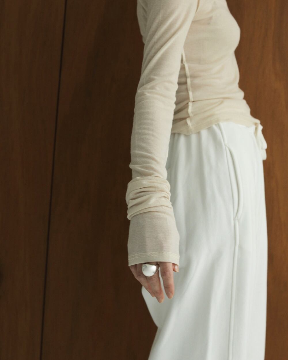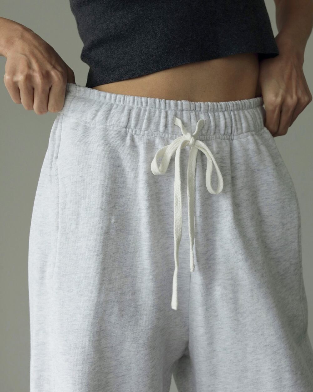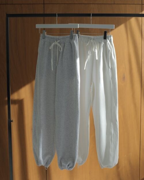 裾がドロストリング仕様のスウェットパンツ。紐が擦らないようにループで留まる仕様です。太めのシルエットが何にでも合わせやすく、着回せる定番の1本。