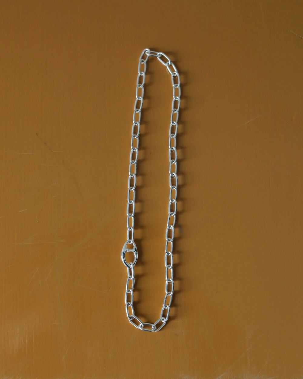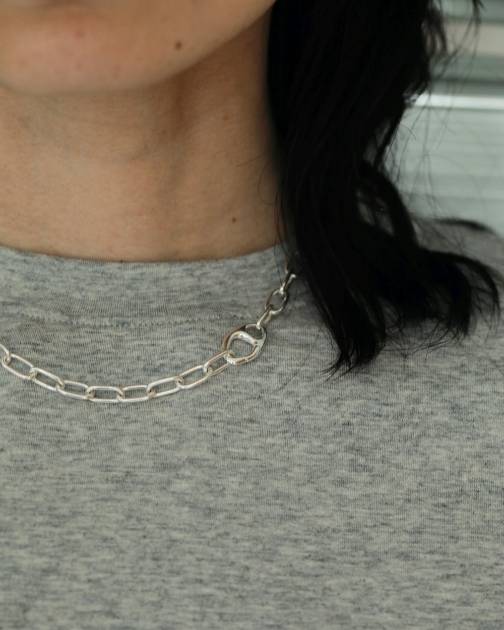 ボリュームのあるチェーンとの組み合わせでシンプルなスタイリングのポイントに。