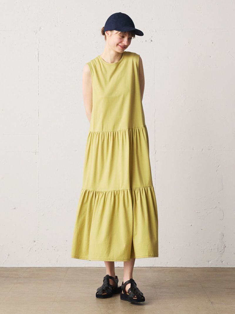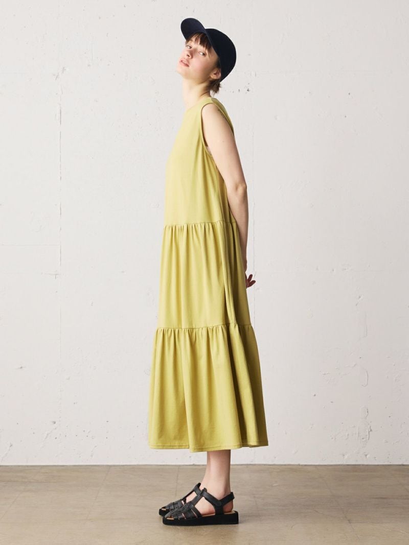 1枚でさらっと着用していただけるティアードノースリワンピース。フェミニンすぎず大人っぽく着用いただけます。カットソー素材の優しい着心地を体感していただけます。トップがすっきりしているのでティアードのボリューム感が控えめで全体的なバランスを考えられたシルエット表現。ワンピースの下にデニムを穿いたりもオススメです。
